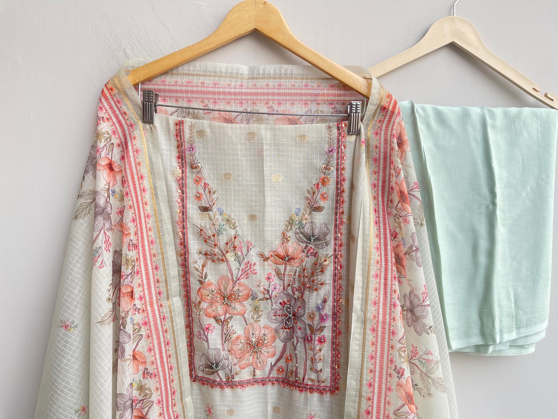 π banarasi soft kota doriya printed fabric unstitched shirt with resham pearl sequence embroidery