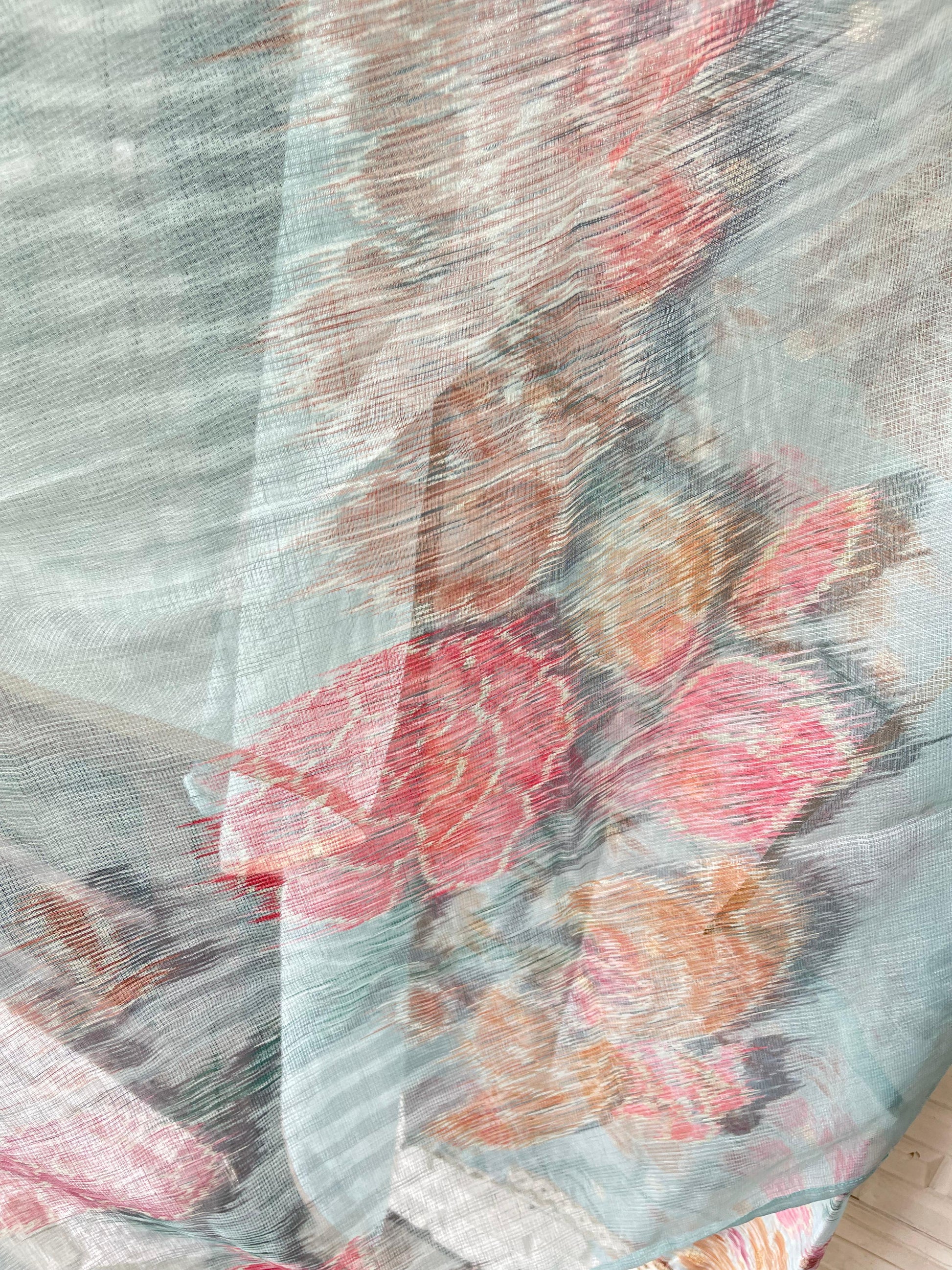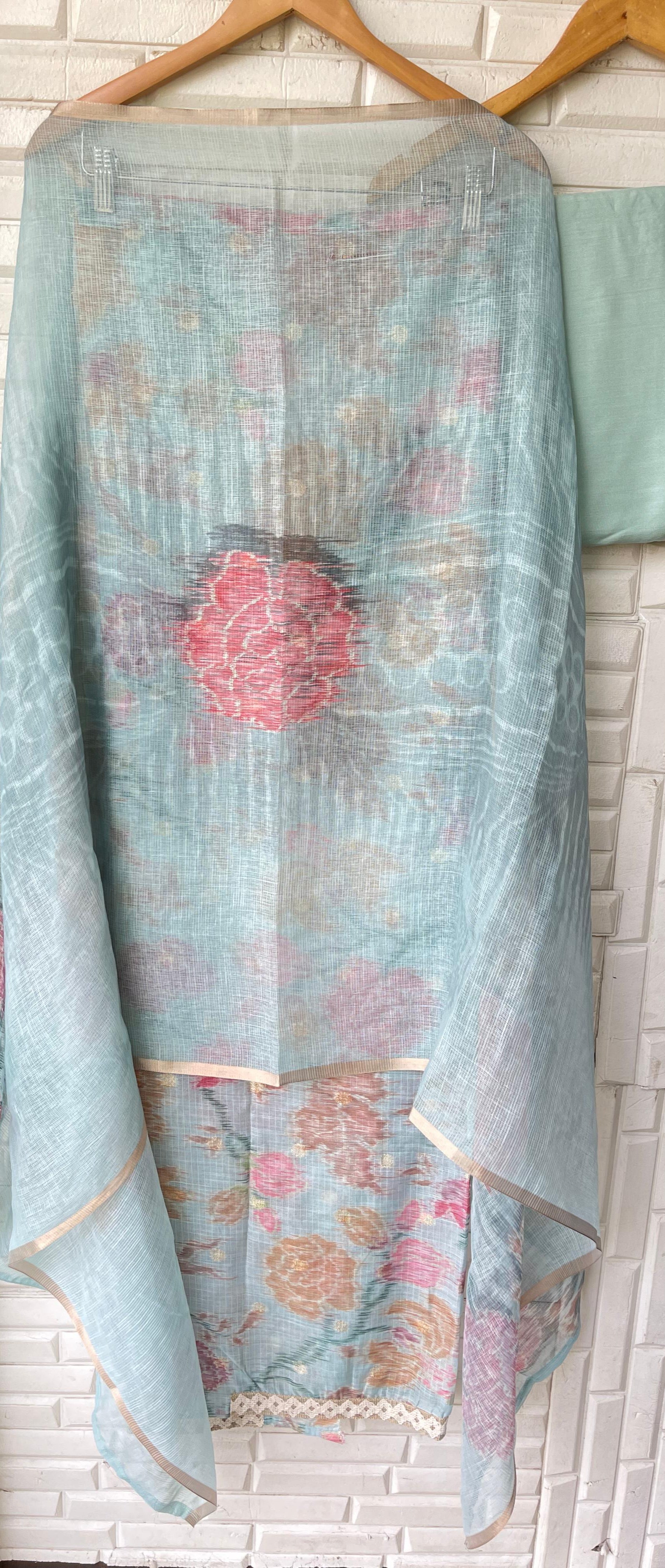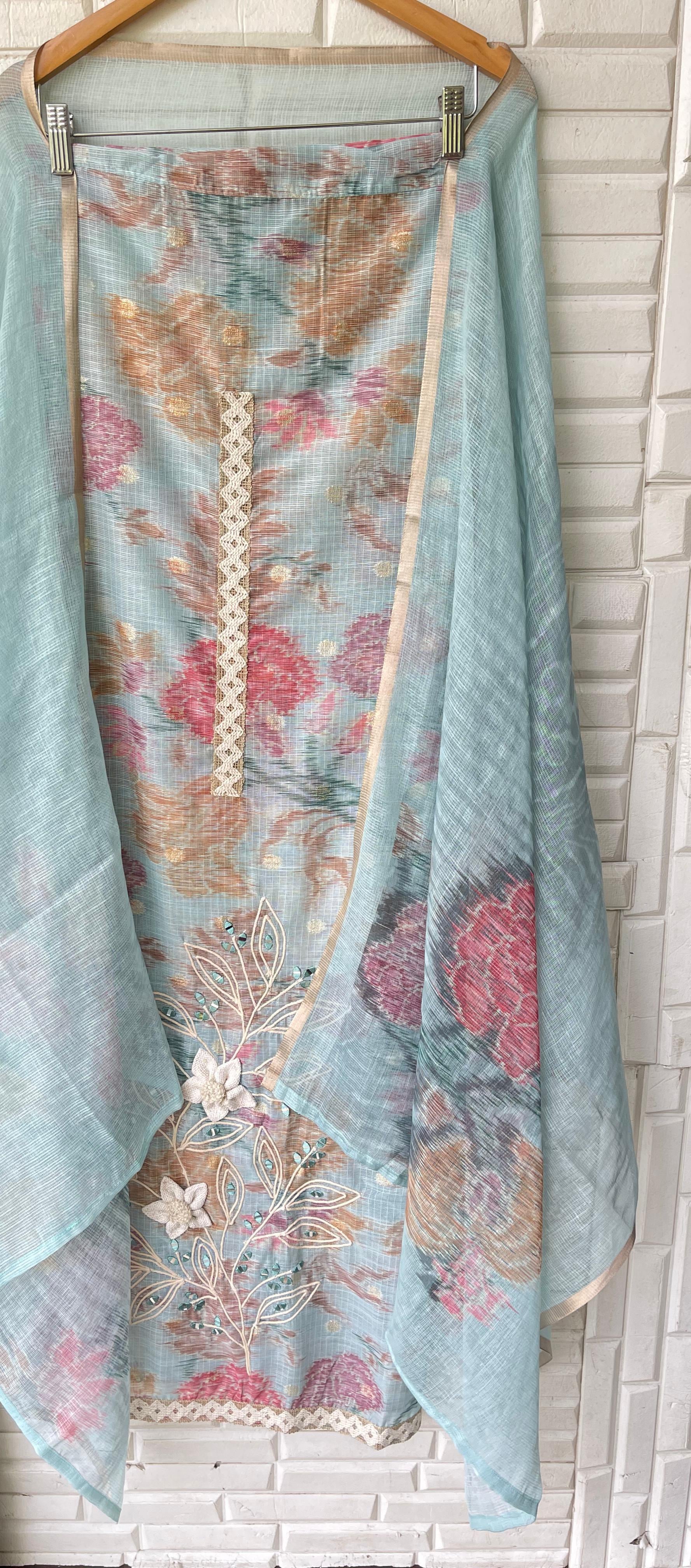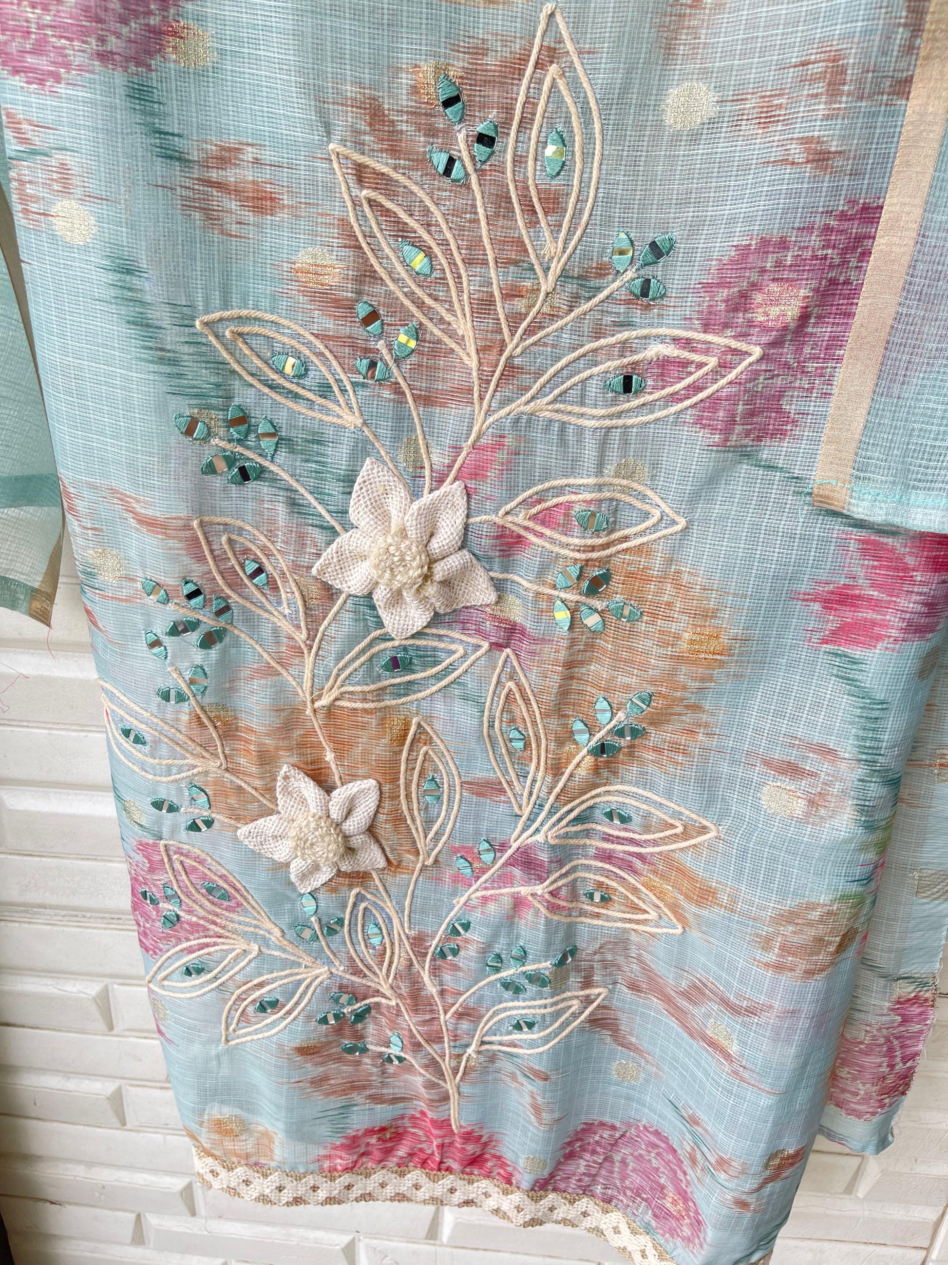 😊 banarasi kota doriya printed fabric unstitched shirt with jute resham mirror work embroidery and crotia 3D flowers
