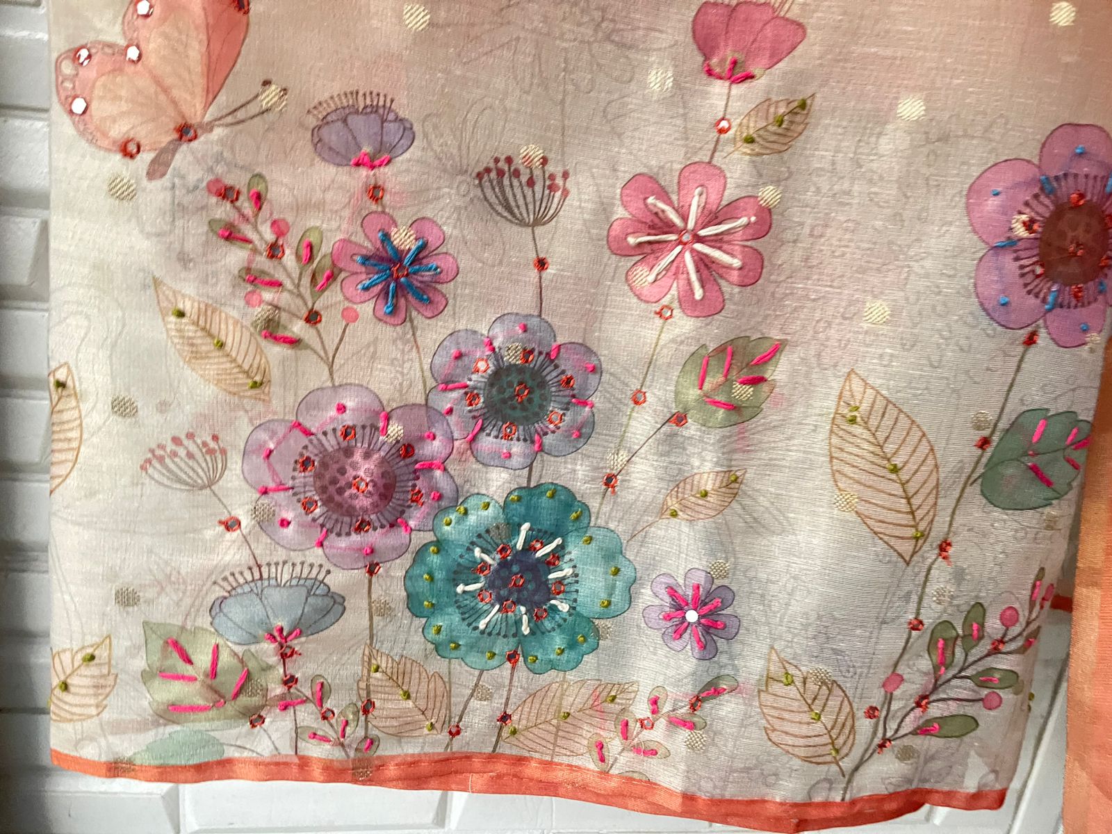π banarasi shimmer linen printed fabric unstitched shirt with mirror work resham embroidery