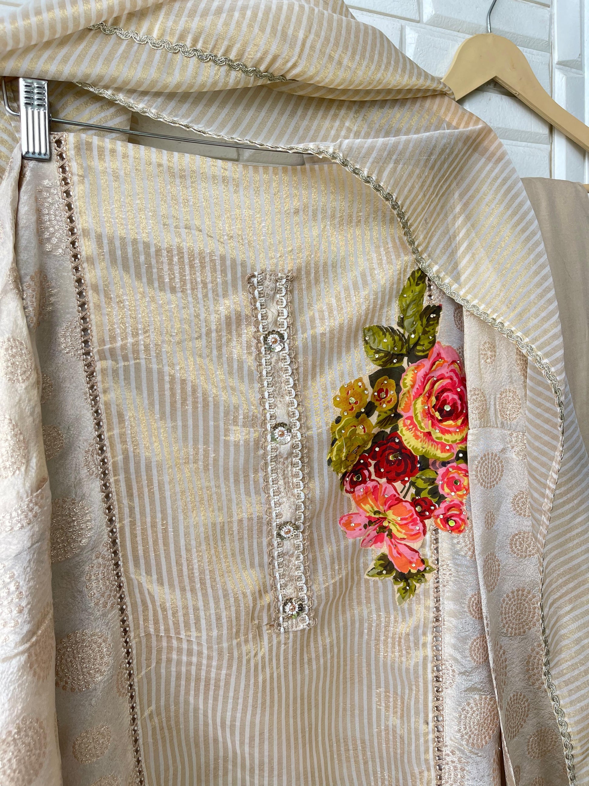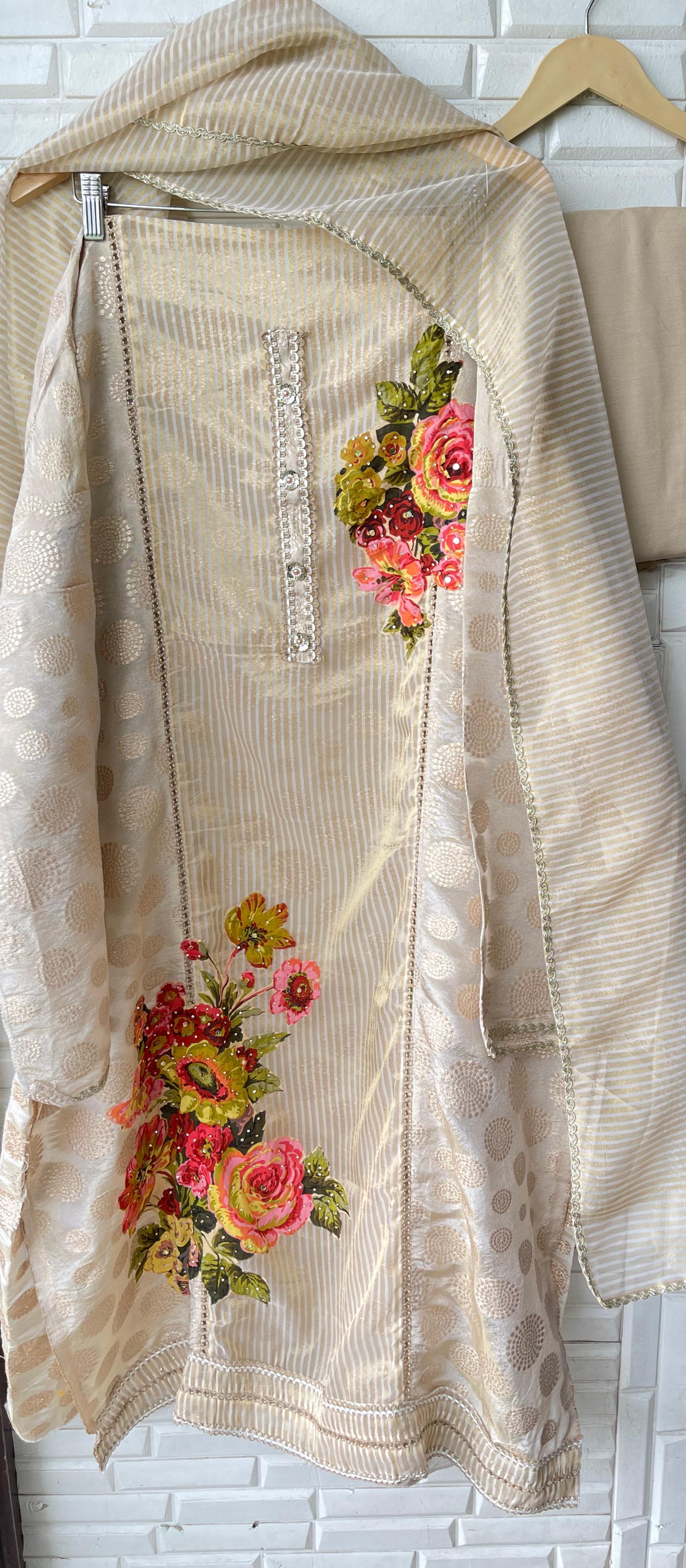 π banarasi shimmer silk woven fabric unstitched shirt with sequence mirror work highlighting on the patchwork