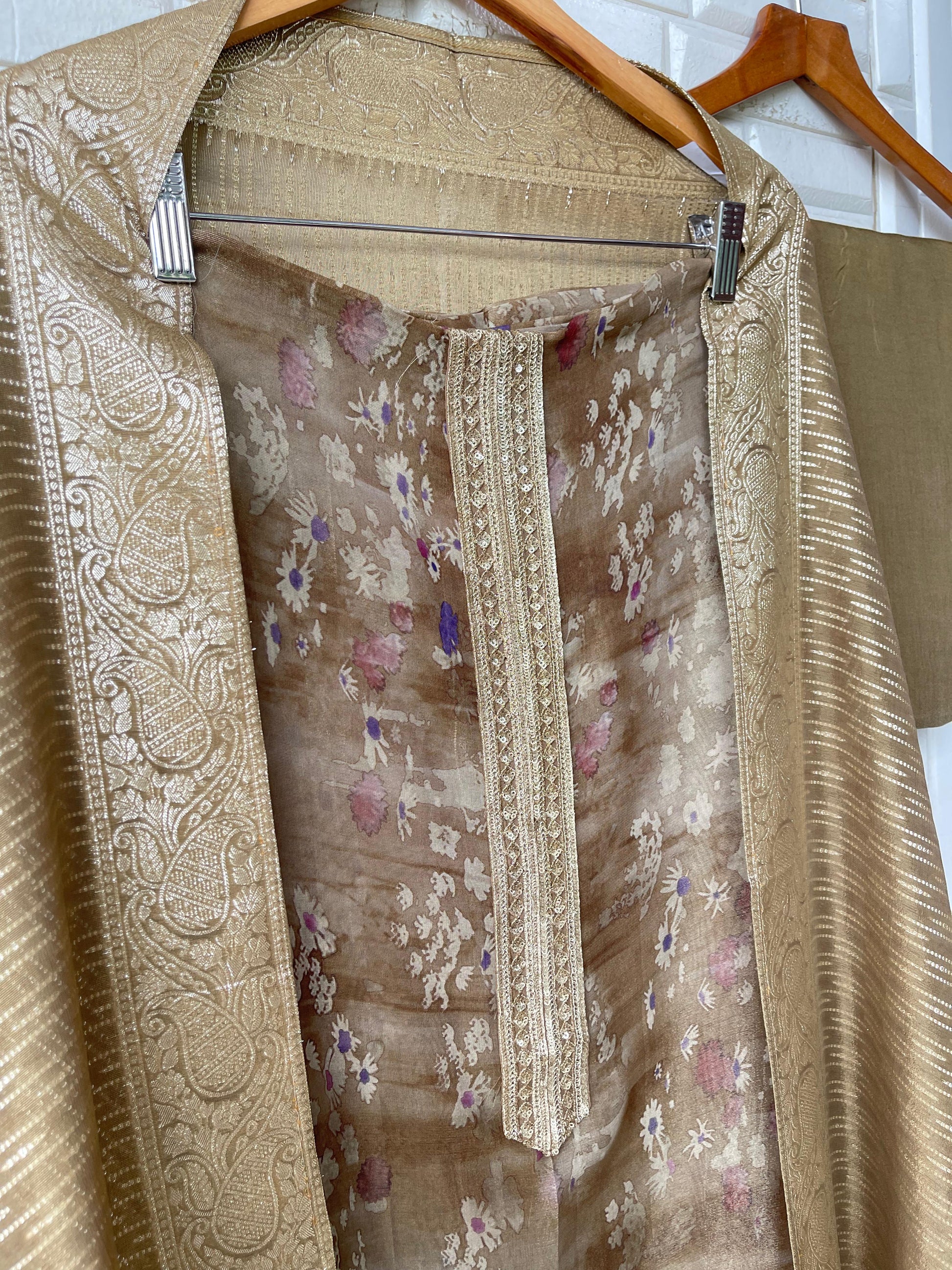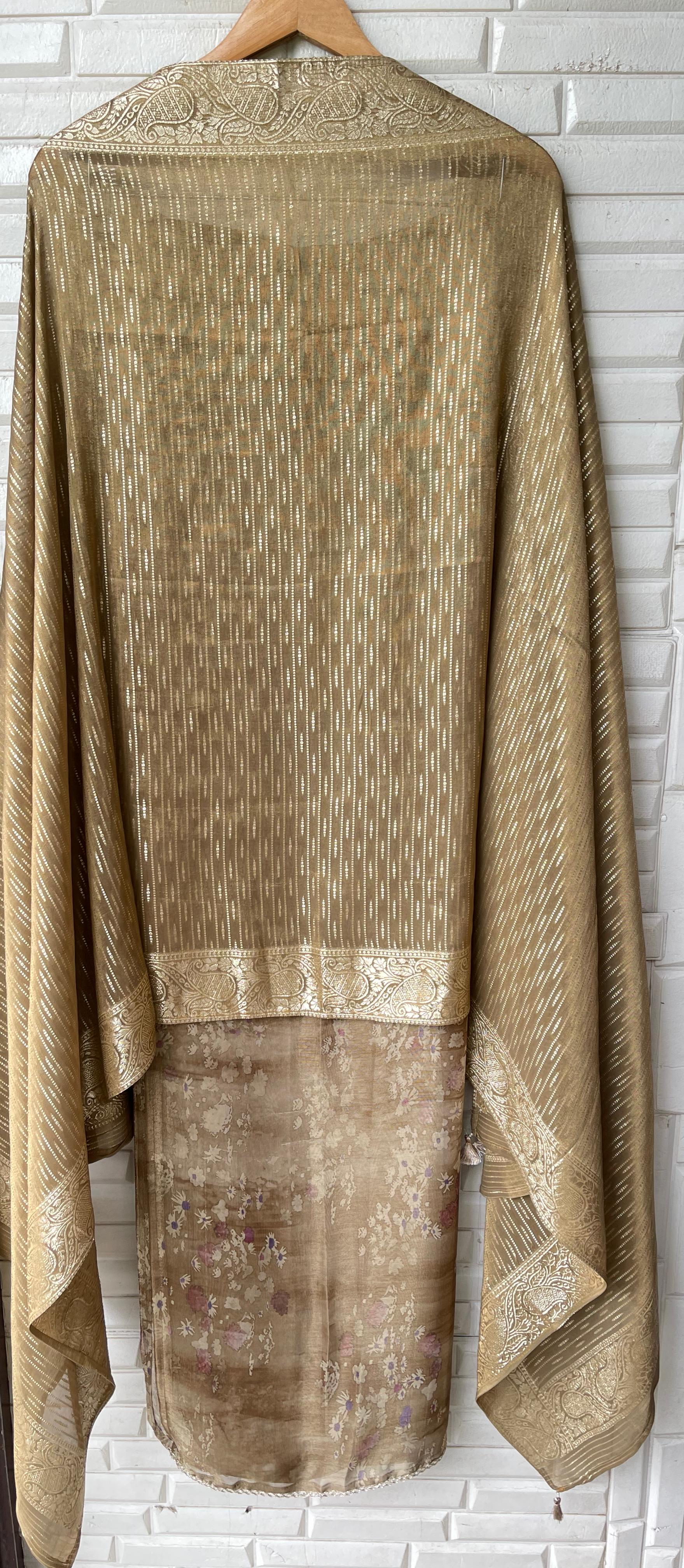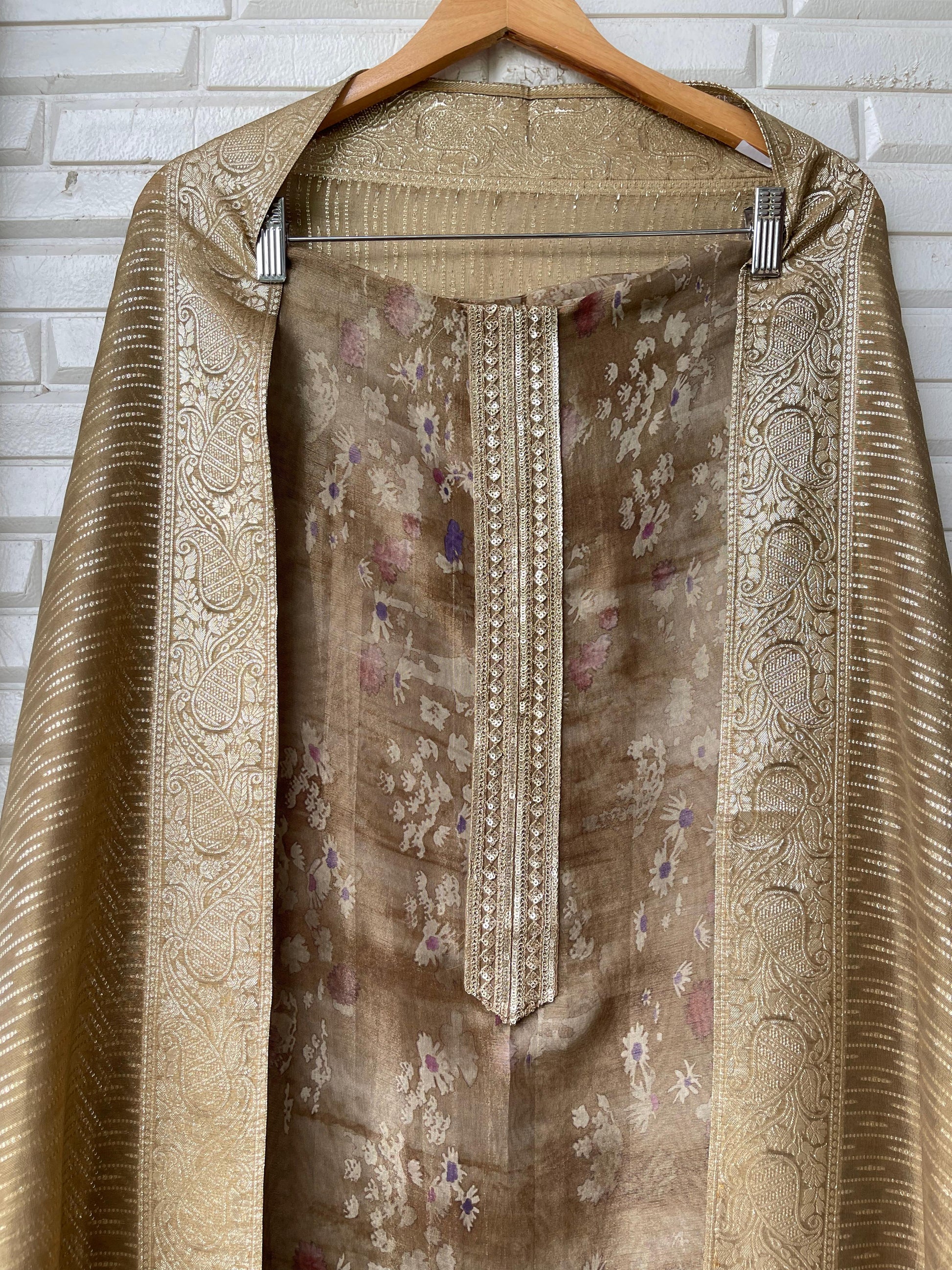 π shimmer silk Chinon printed fabric unstitched shirt with zari sequence embroidery and ghera lace