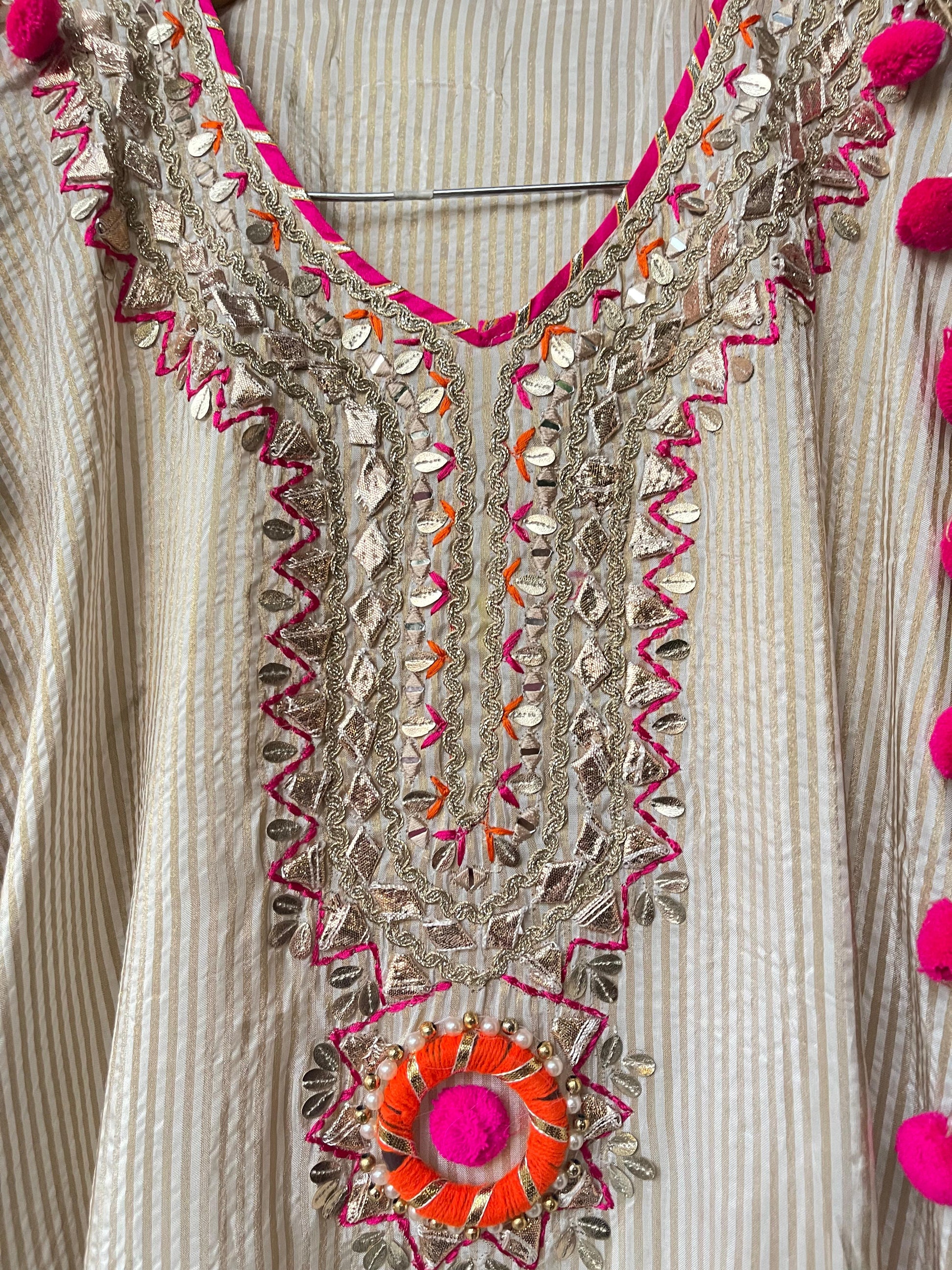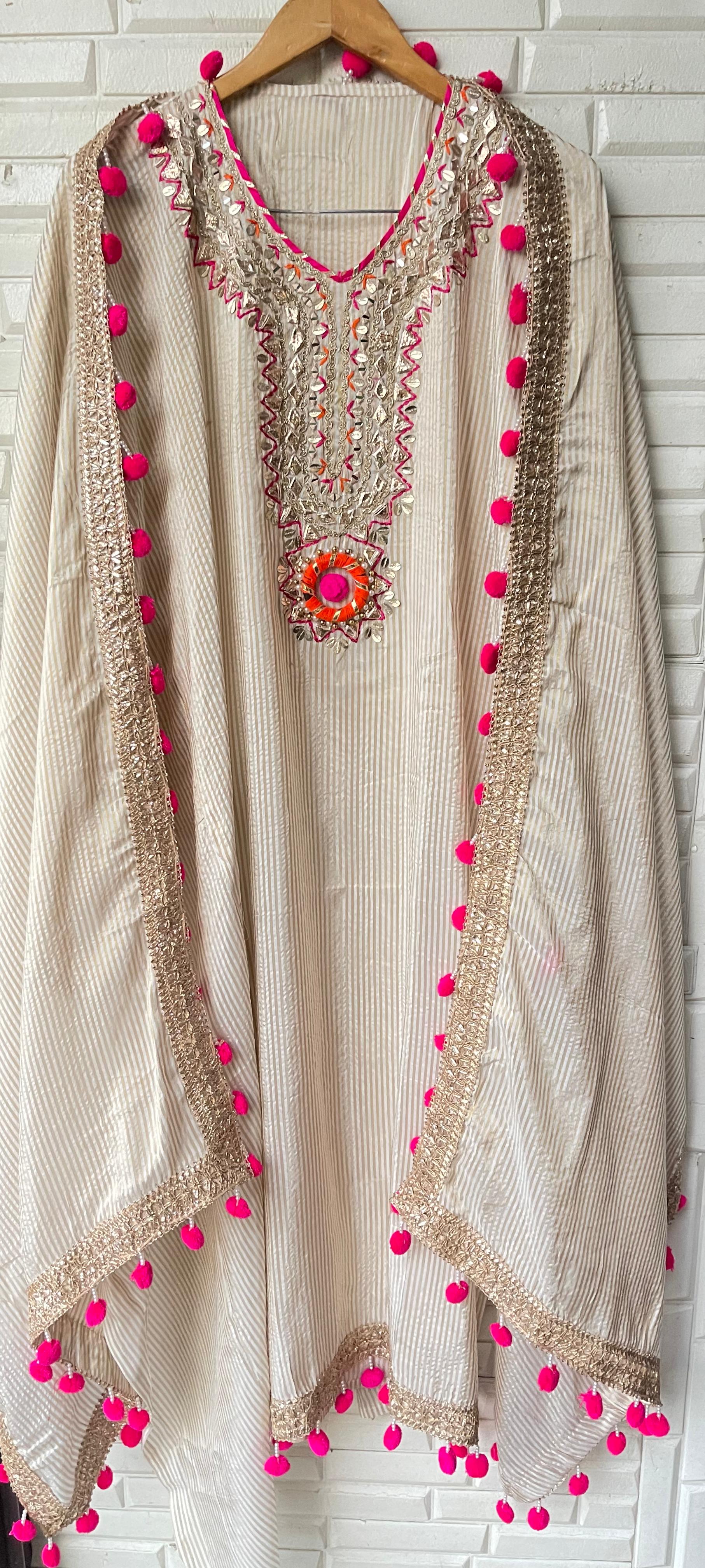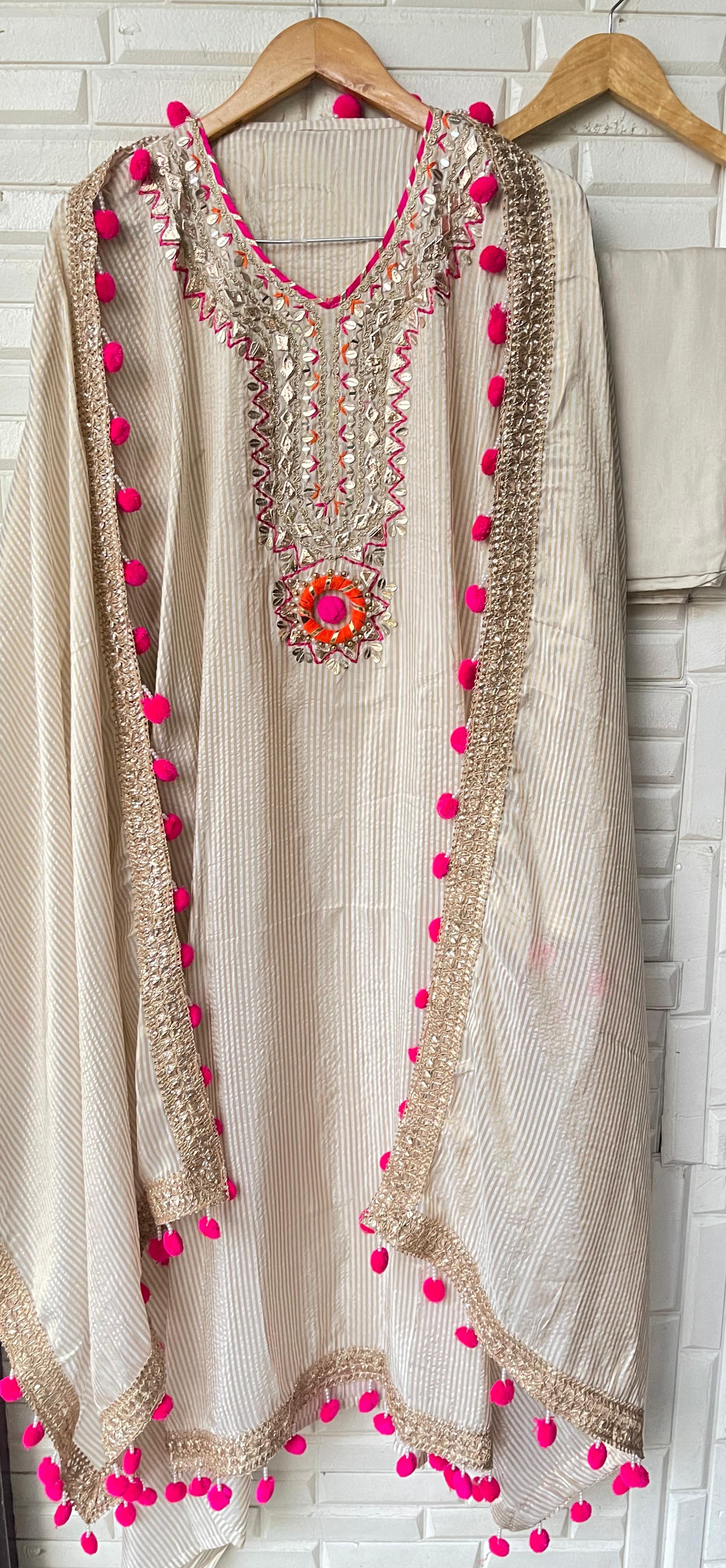 π pure banarasi shimmer weaving silk fabric unstitched shirt with gotta patti mirror work leather work zari embroidery plus Pom Poms