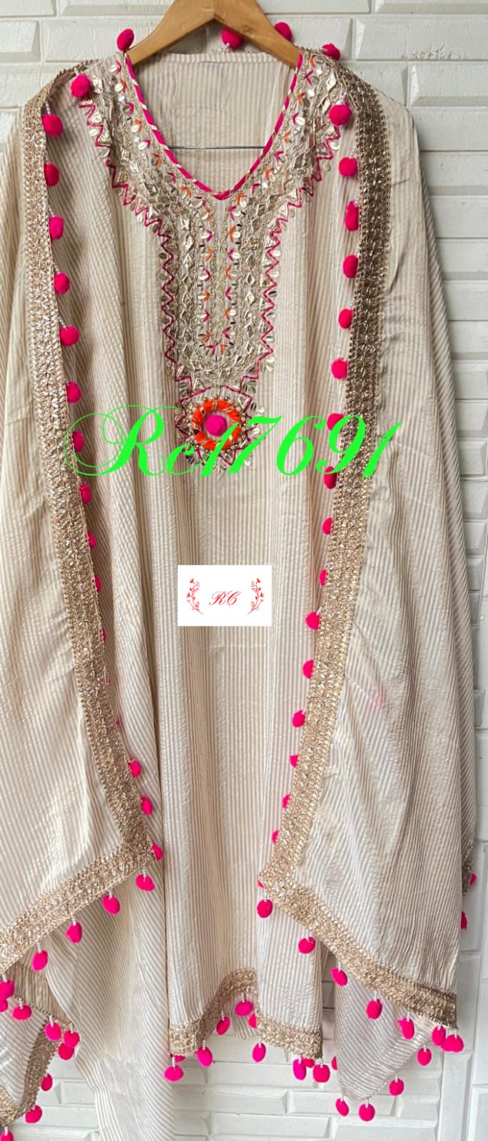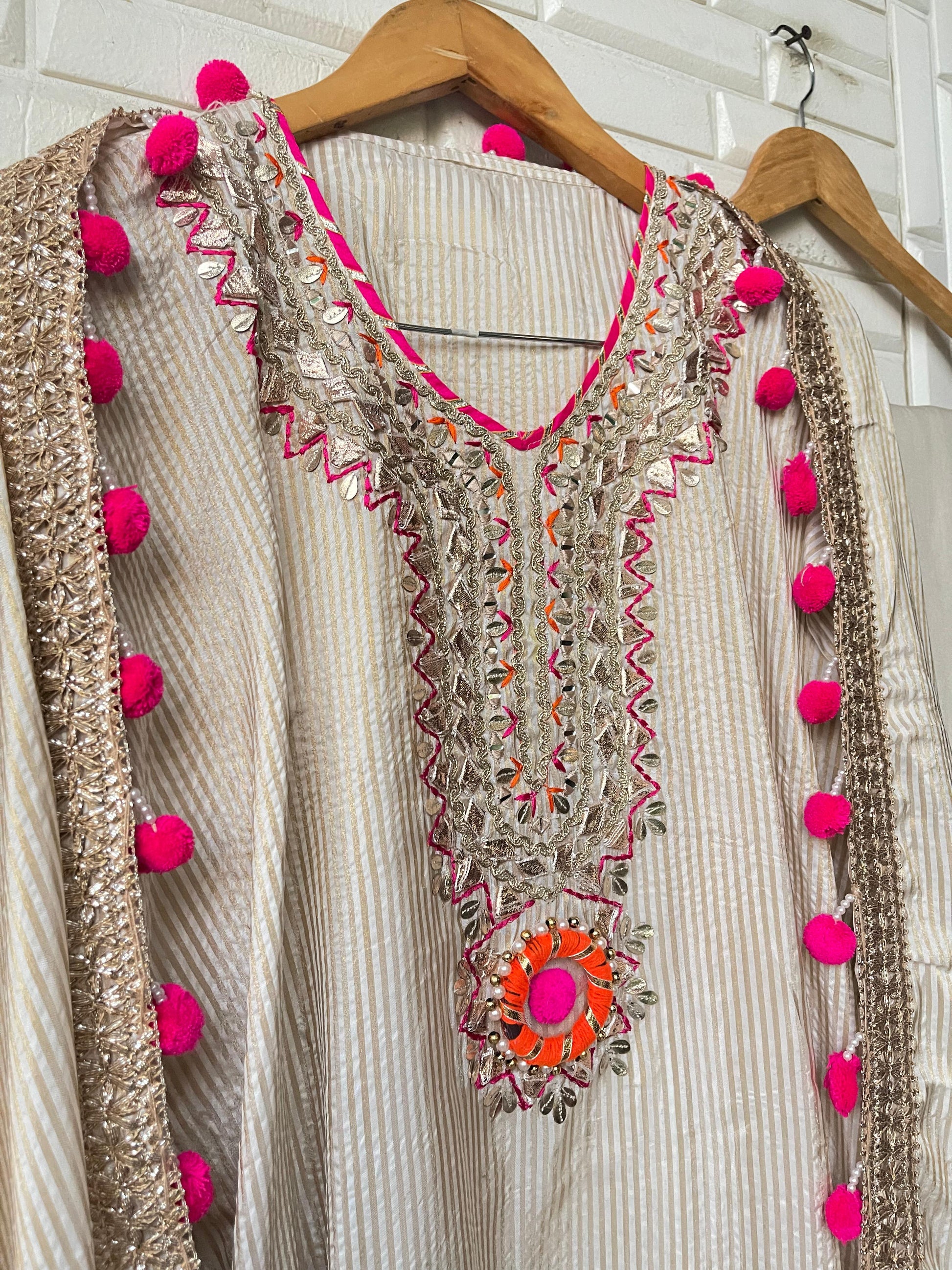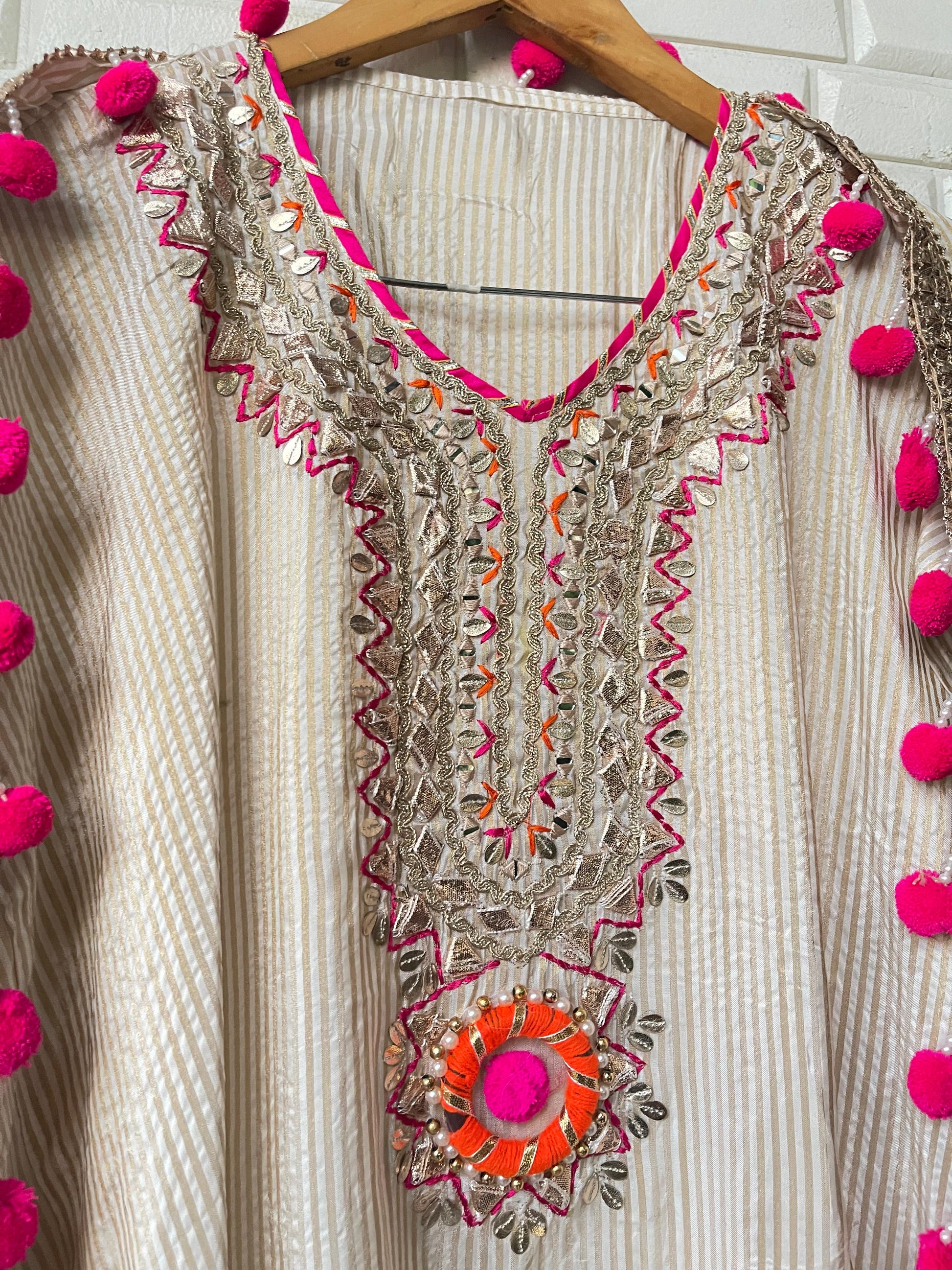 π pure banarasi shimmer weaving silk fabric unstitched shirt with gotta patti mirror work leather work zari embroidery plus Pom Poms