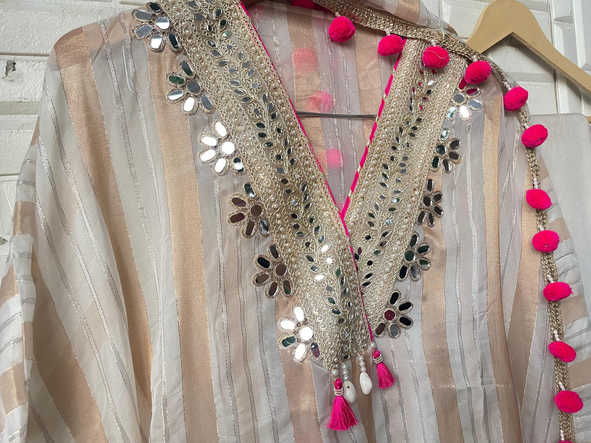 π banarasi shimmer organza fabric unstitched shirt with zari work on neck with mirror work paerl highlighting and pom pom lace on neck and ghera