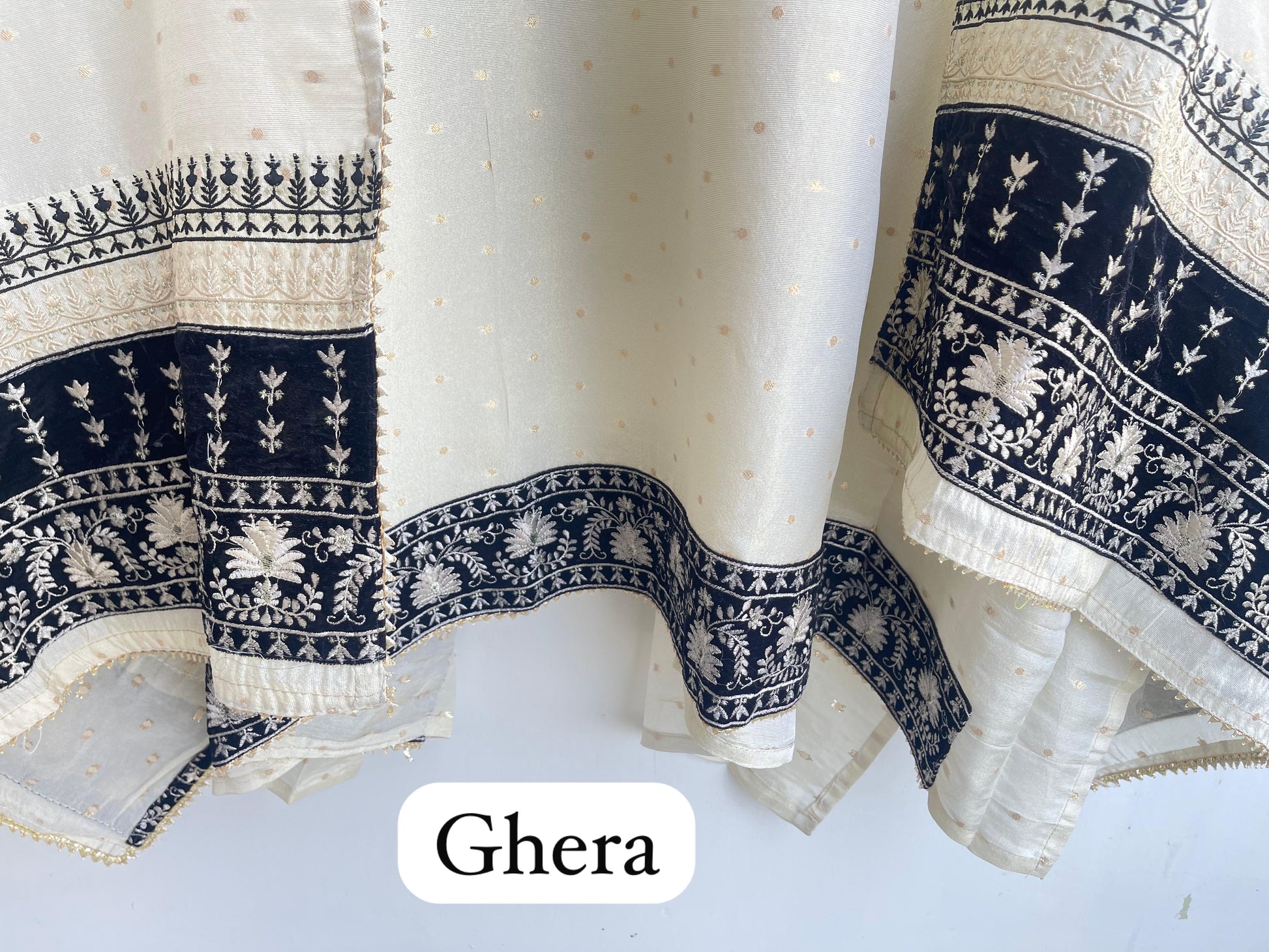 π banarasi pure shimmer silk fabric unstitched shirt with velvet borders zari resham embroidery and Moti hangings