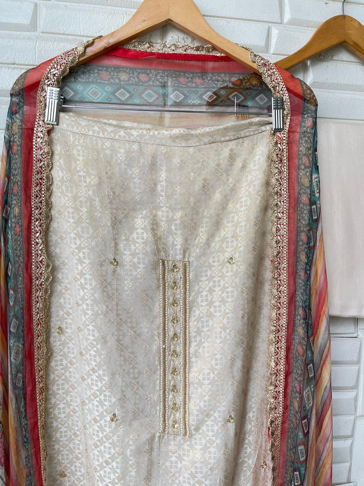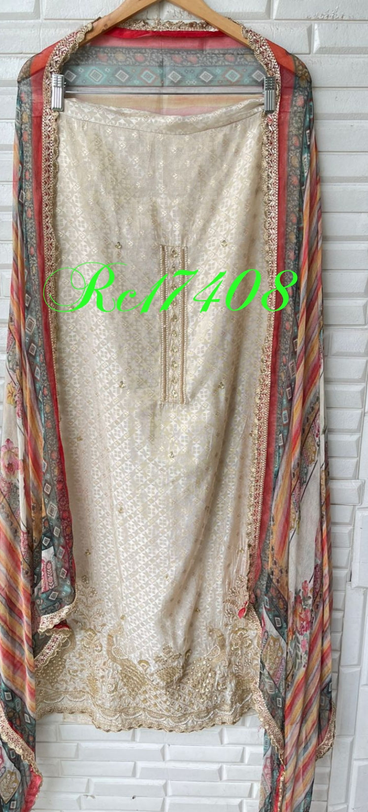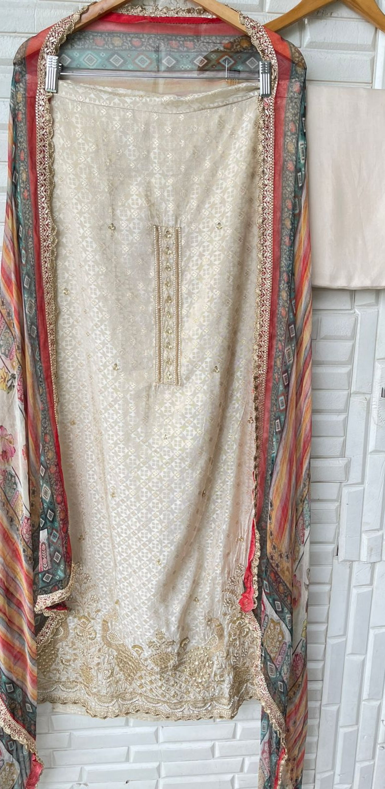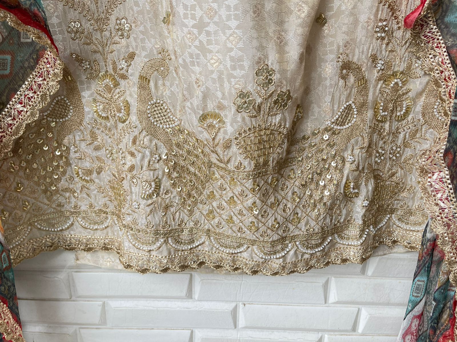 😊 self banarasi silk fabric unstitched shirt with stunning peacocks in zari kutdanna dabka sequence pearl embroidery and ghera border lace