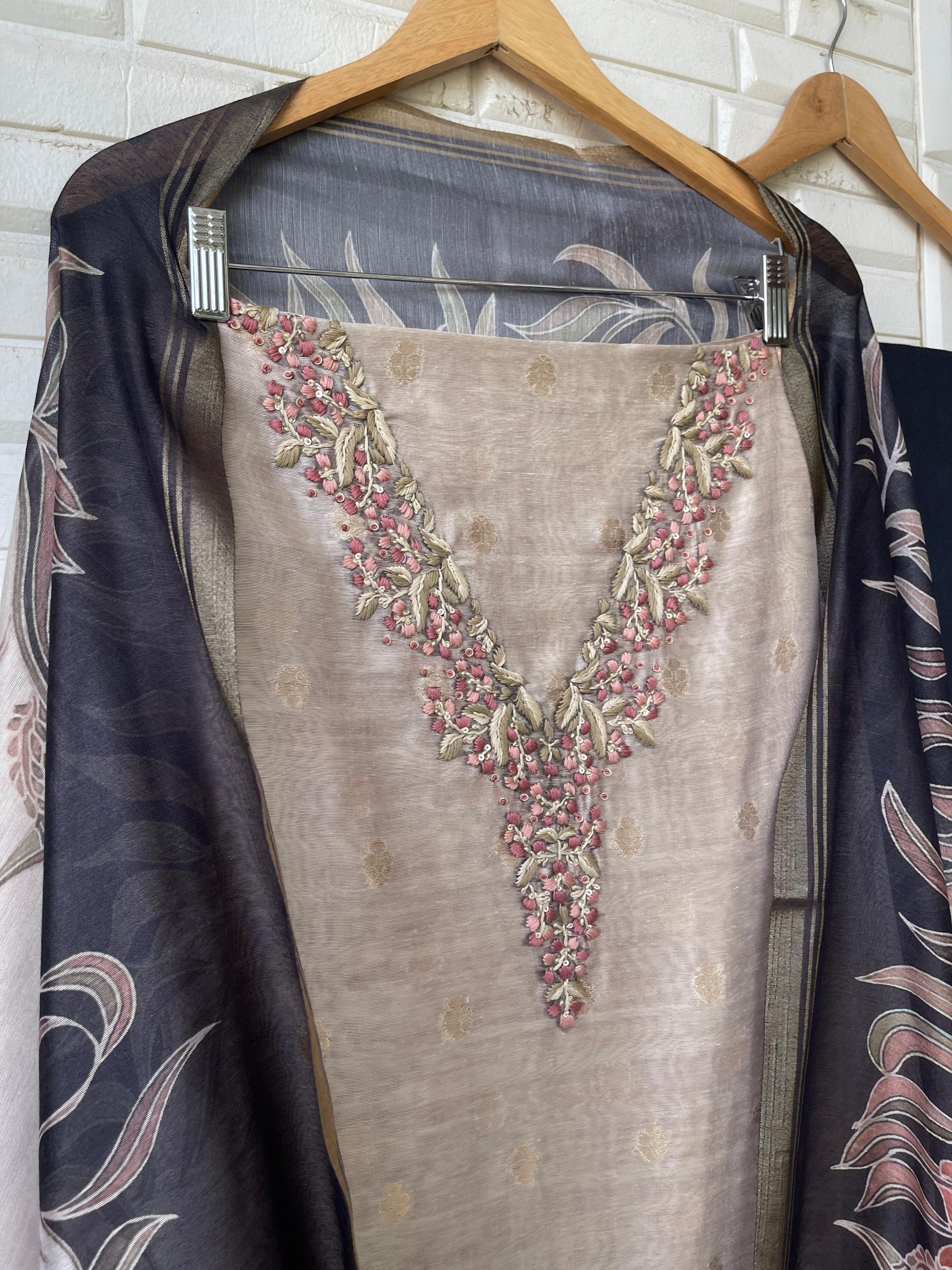 π pure banarasi soft linen silk printed fabric unstitched shirt with resham knots sequence embroidery