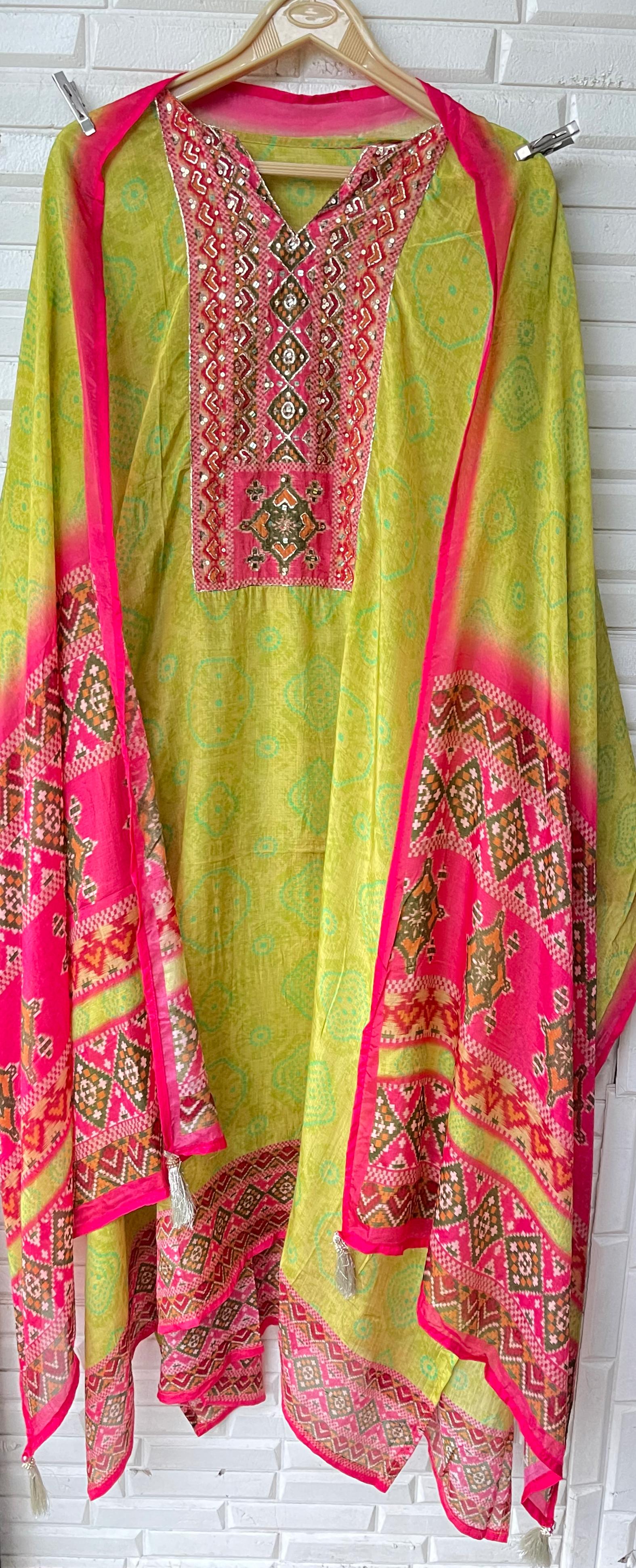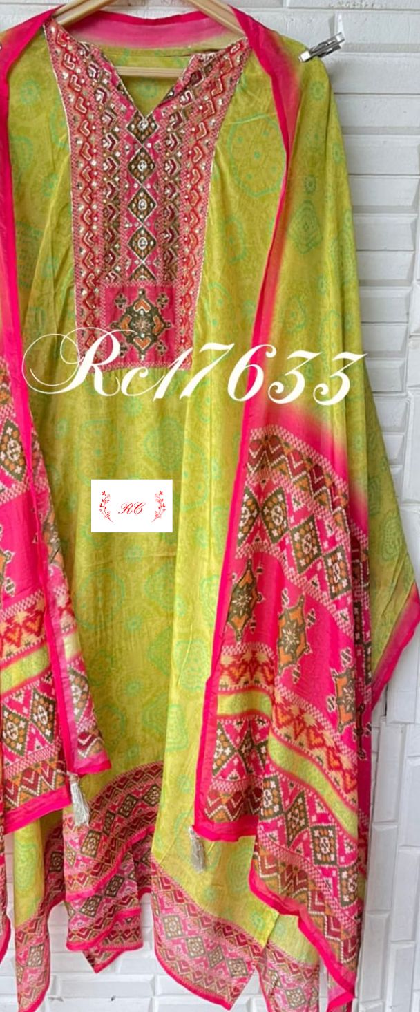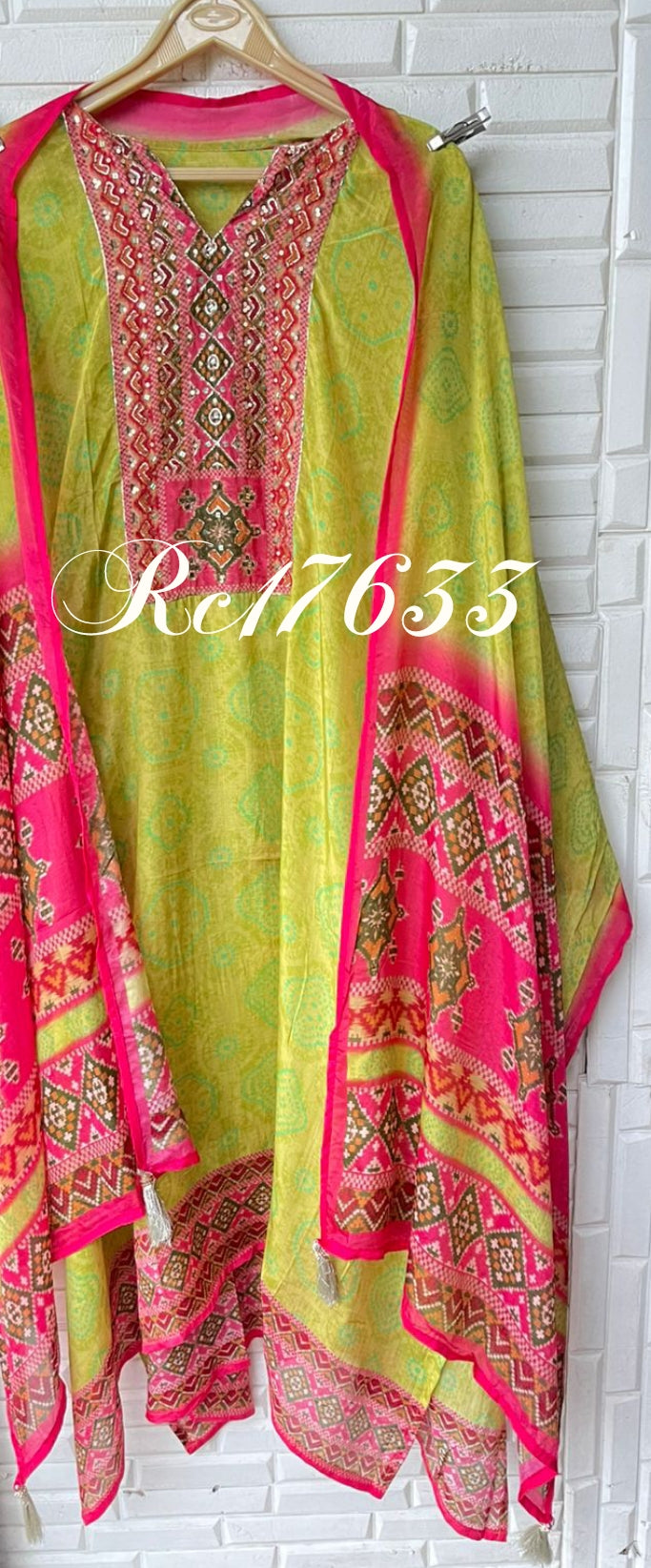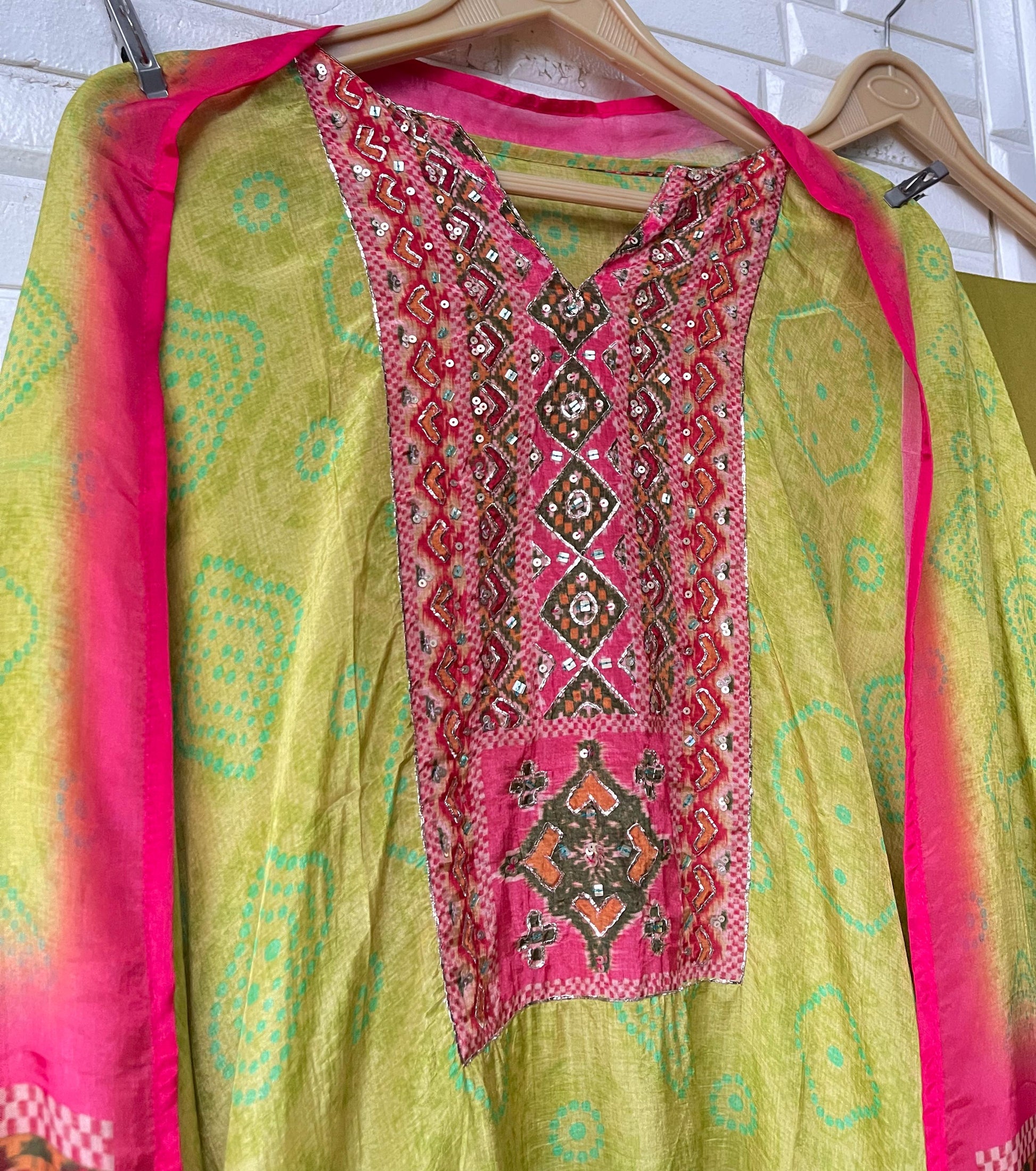 😊 bhandani paper silk printed fabric unstitched shirt with pitta work embroidery, sequence gotta lace work