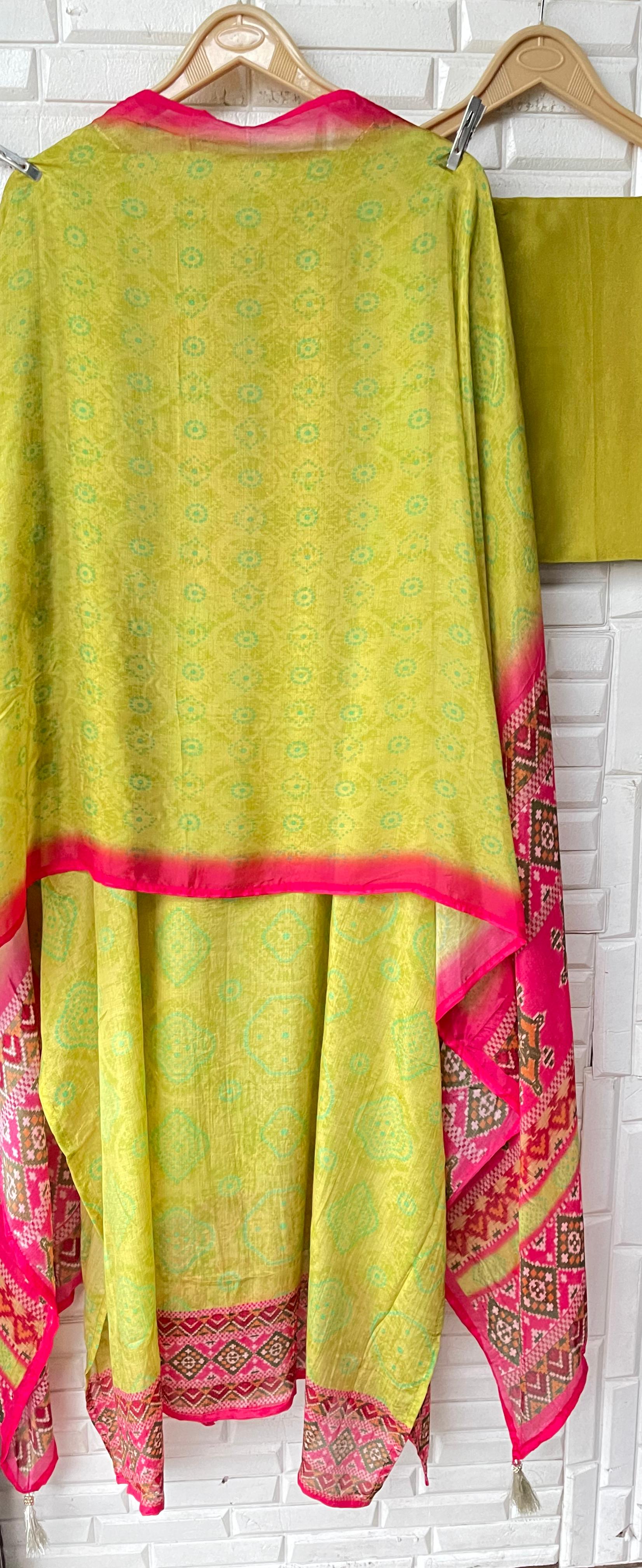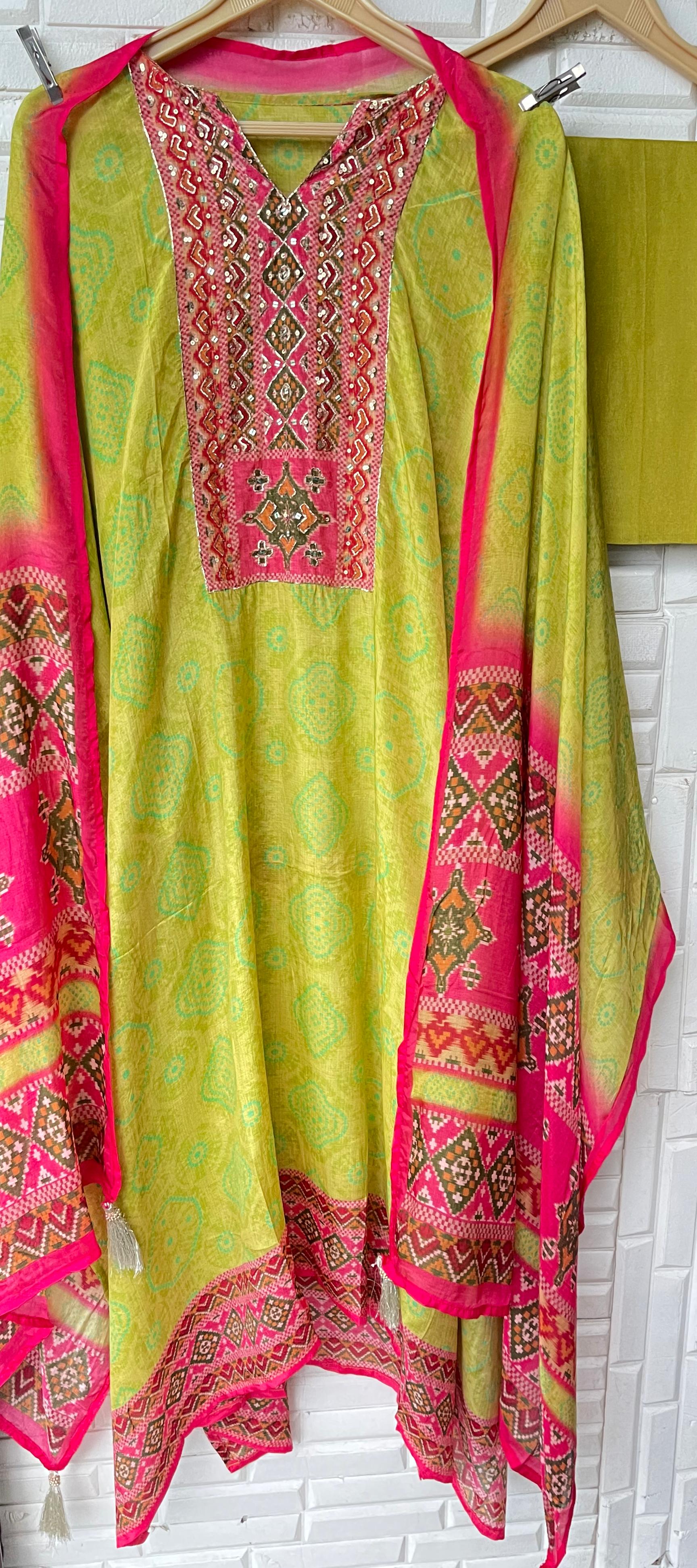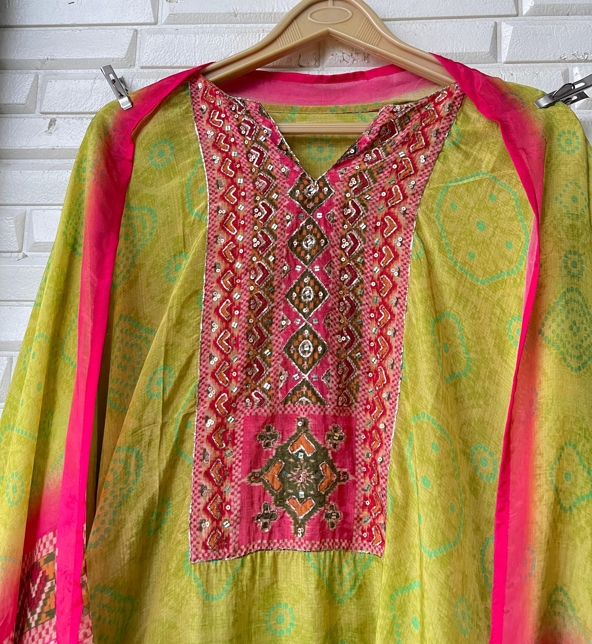 😊 bhandani paper silk printed fabric unstitched shirt with pitta work embroidery, sequence gotta lace work
