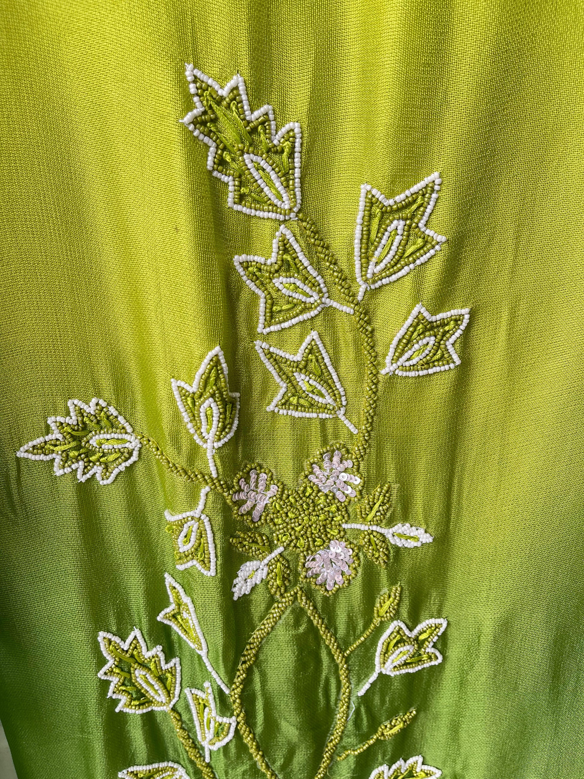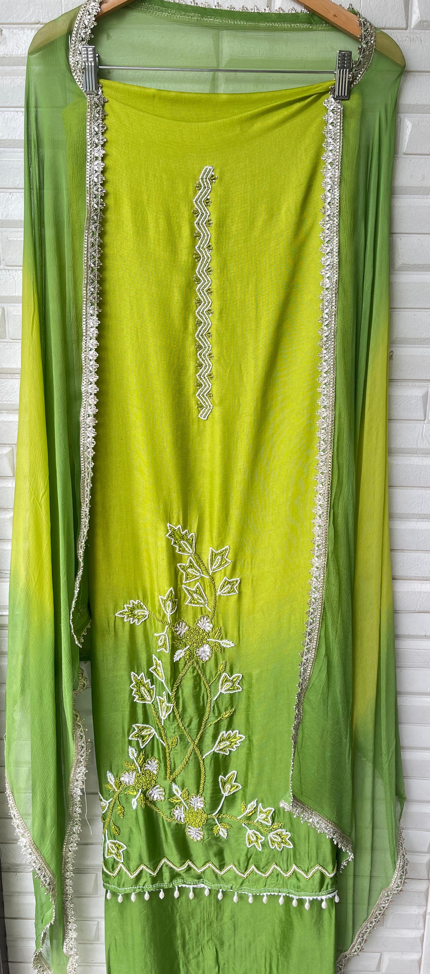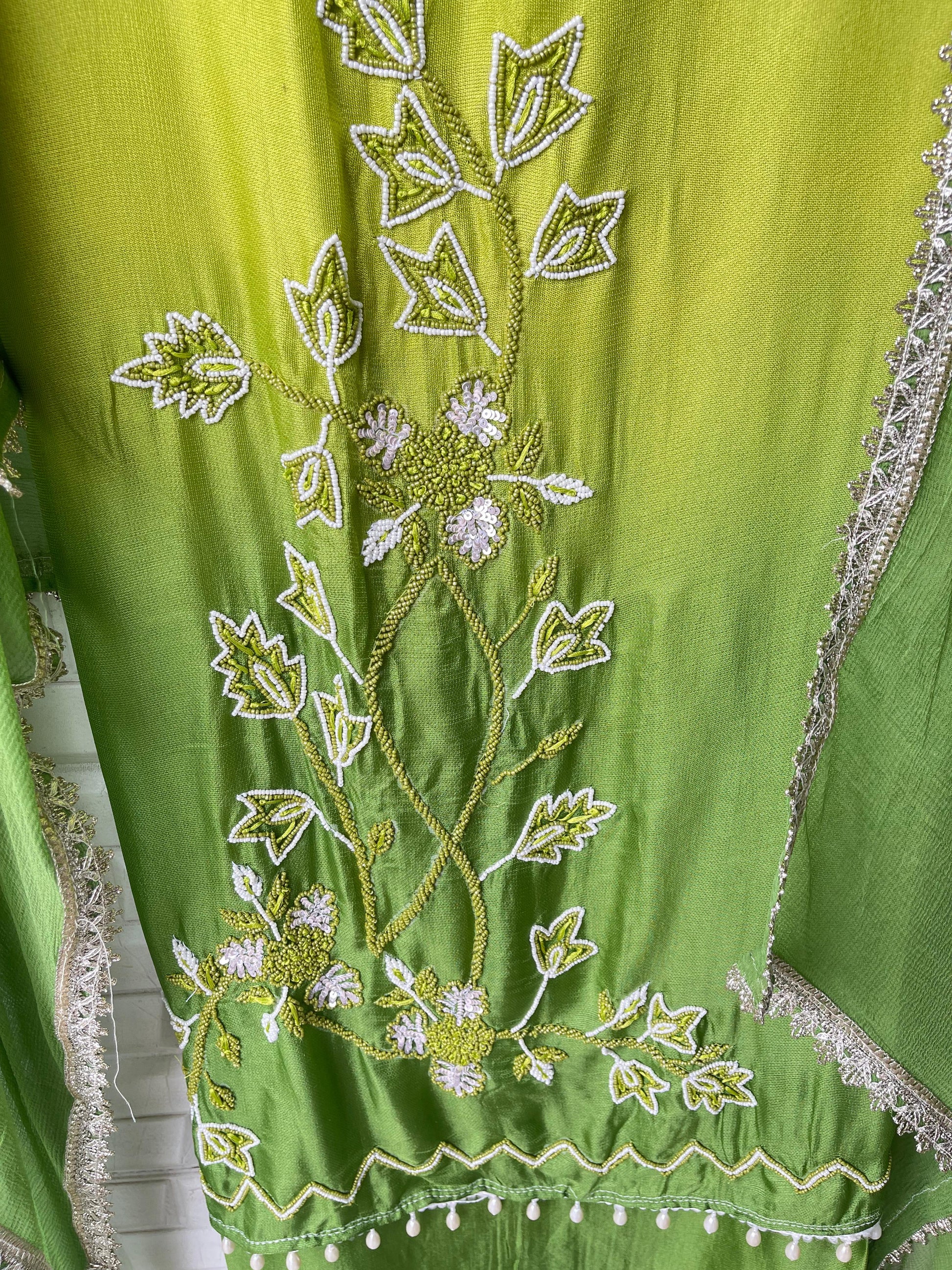 😊 Burberry shimmer linen shaded fabric unstitched shirt with sequence pearl embroidery and pearl hnging ghera lace