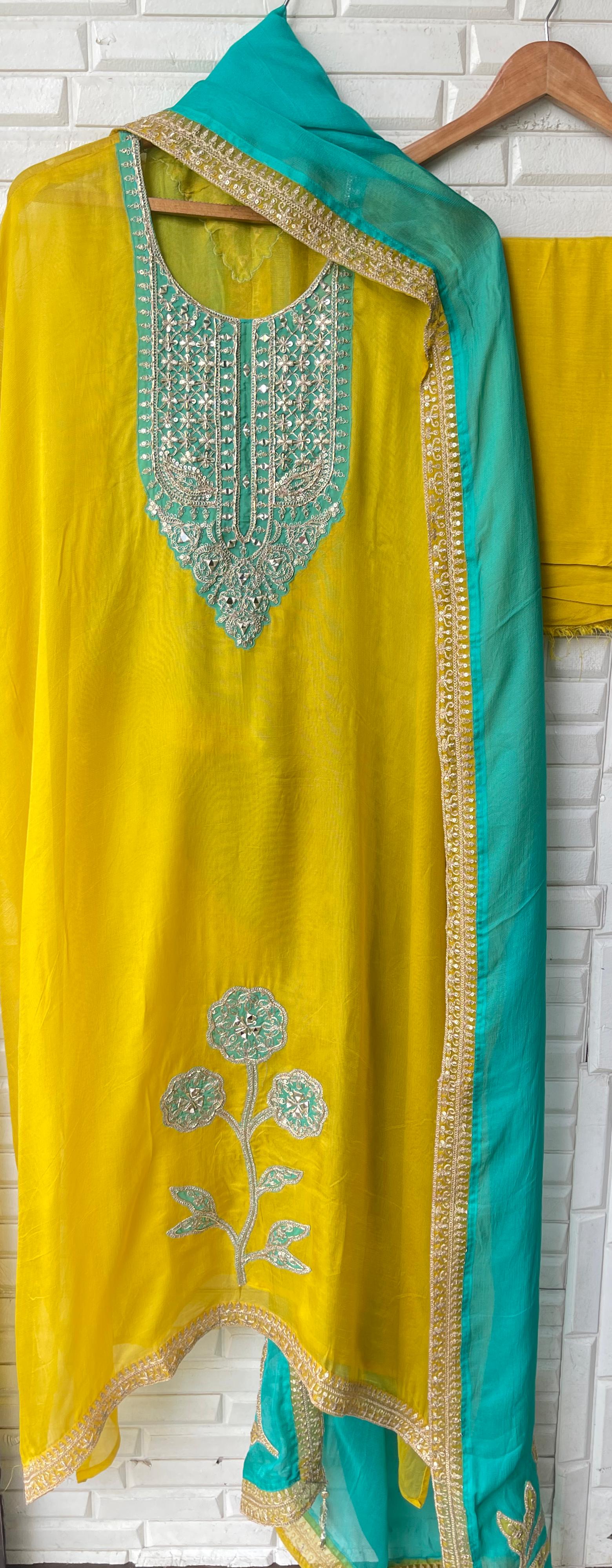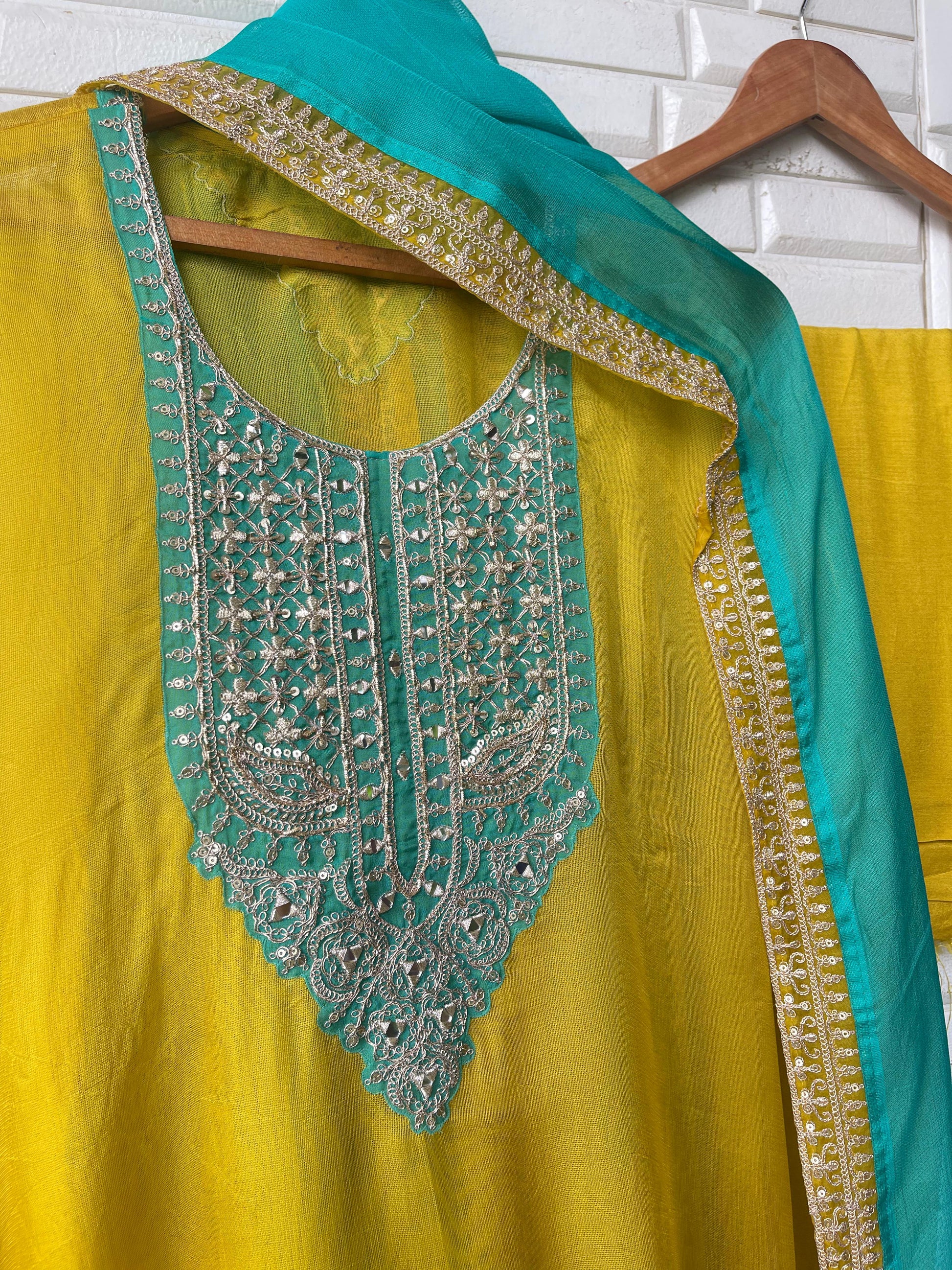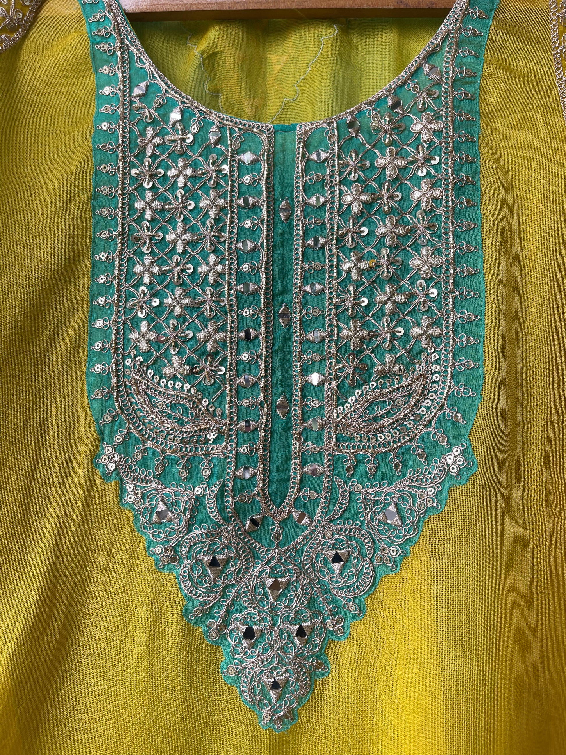 π burberry fabric unstitched shirt with actual mirror work zari sequence embroidery on contrasting color patches