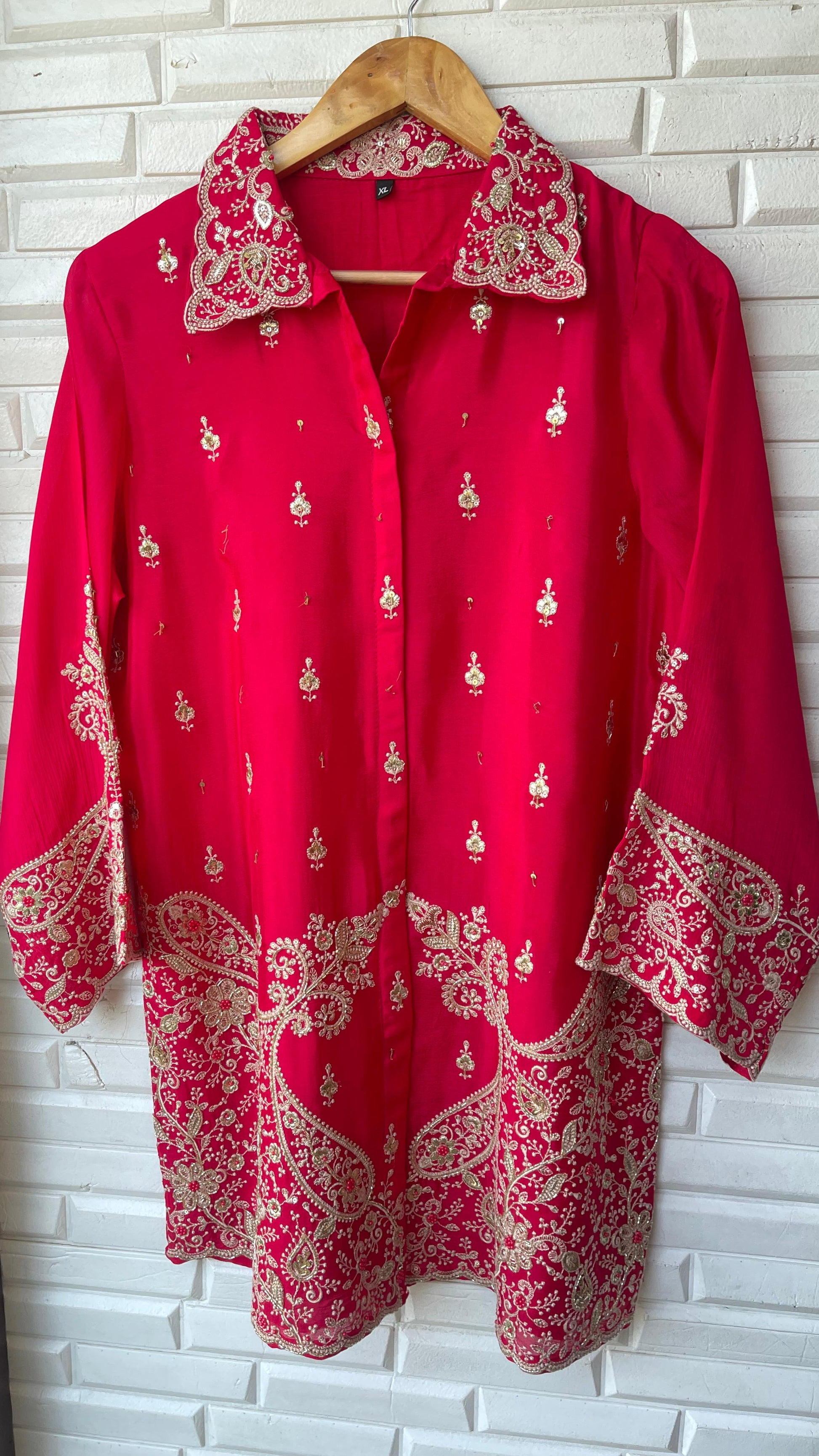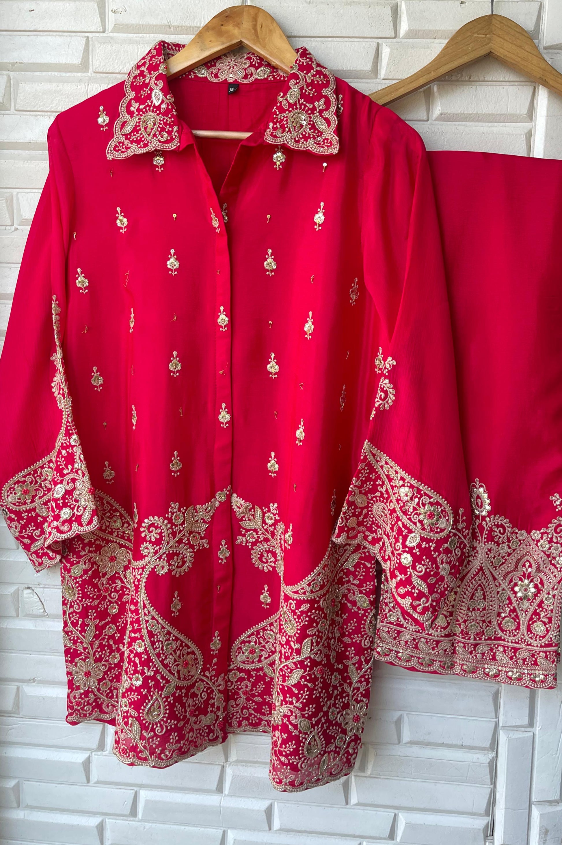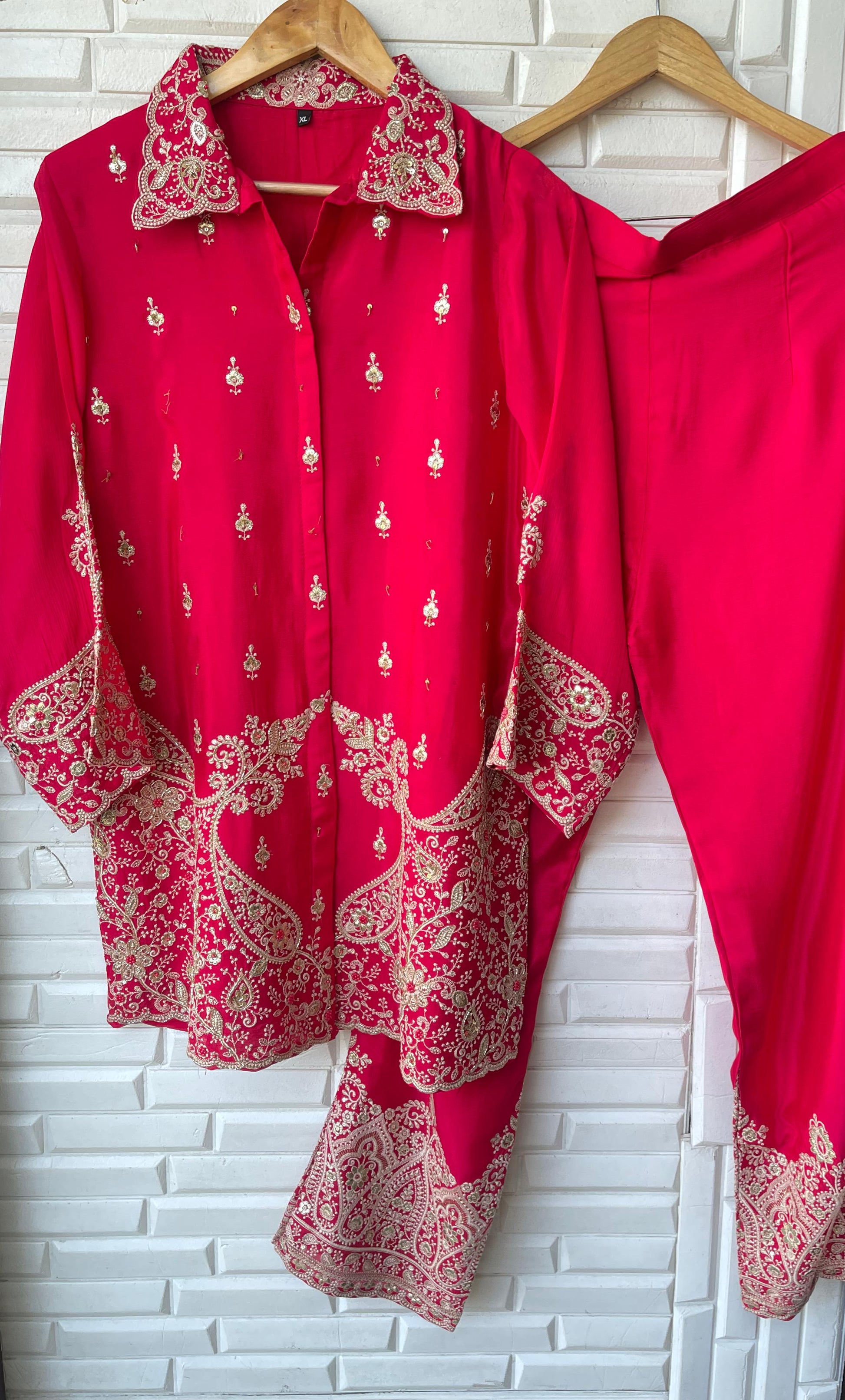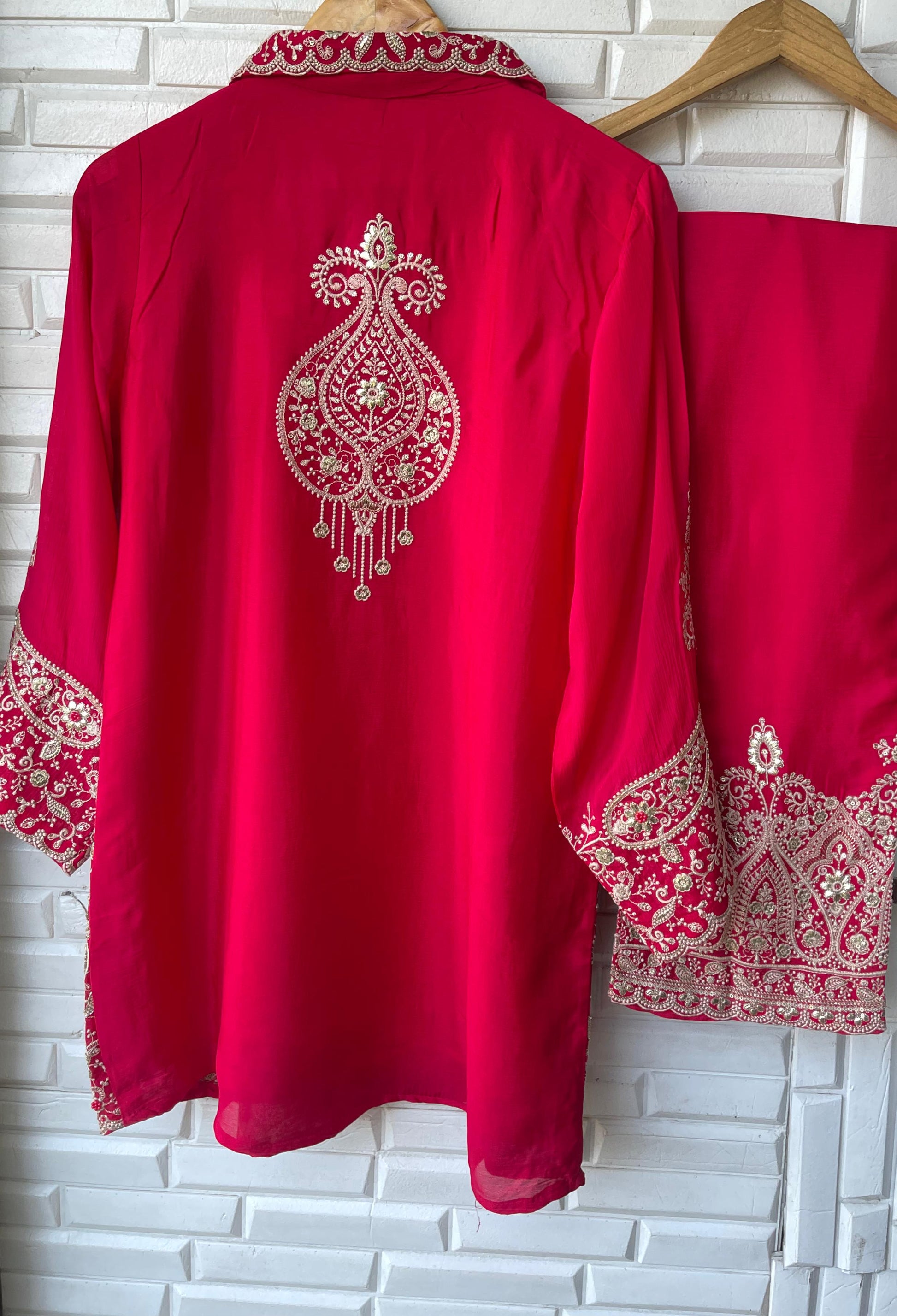 😊 pure chinon fabric stitched coord set shirt with attached lining and kutdanna zari sequence resham dabka embroidery