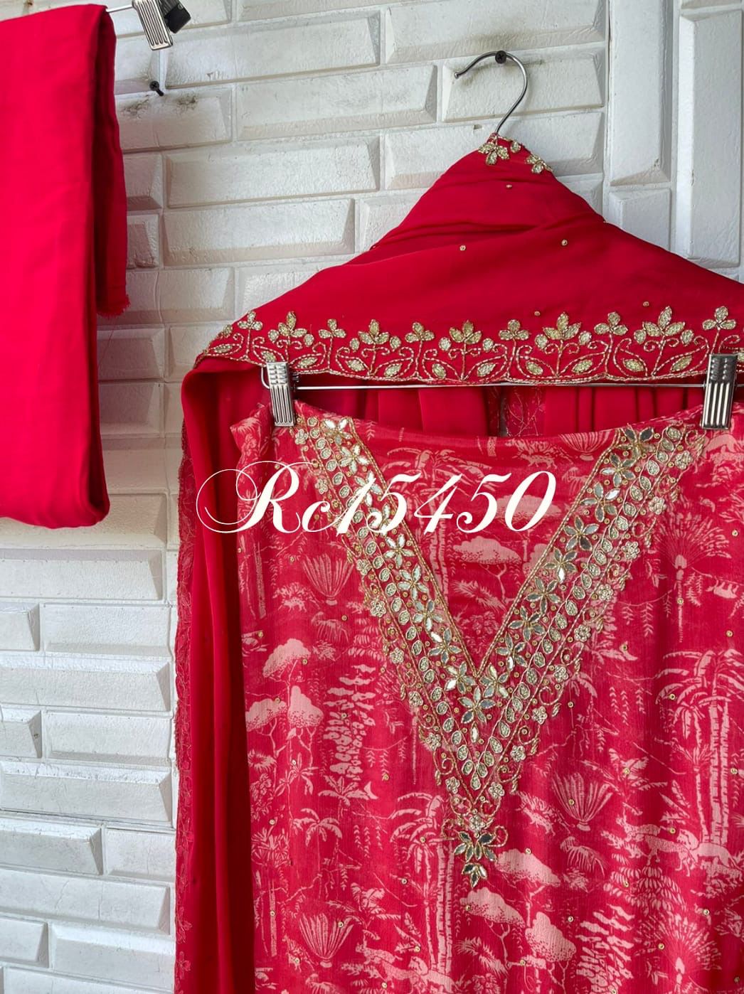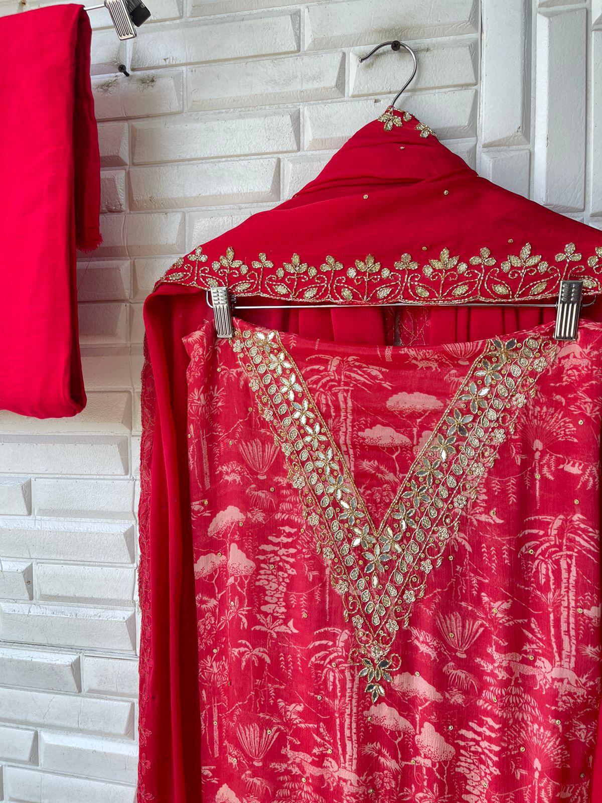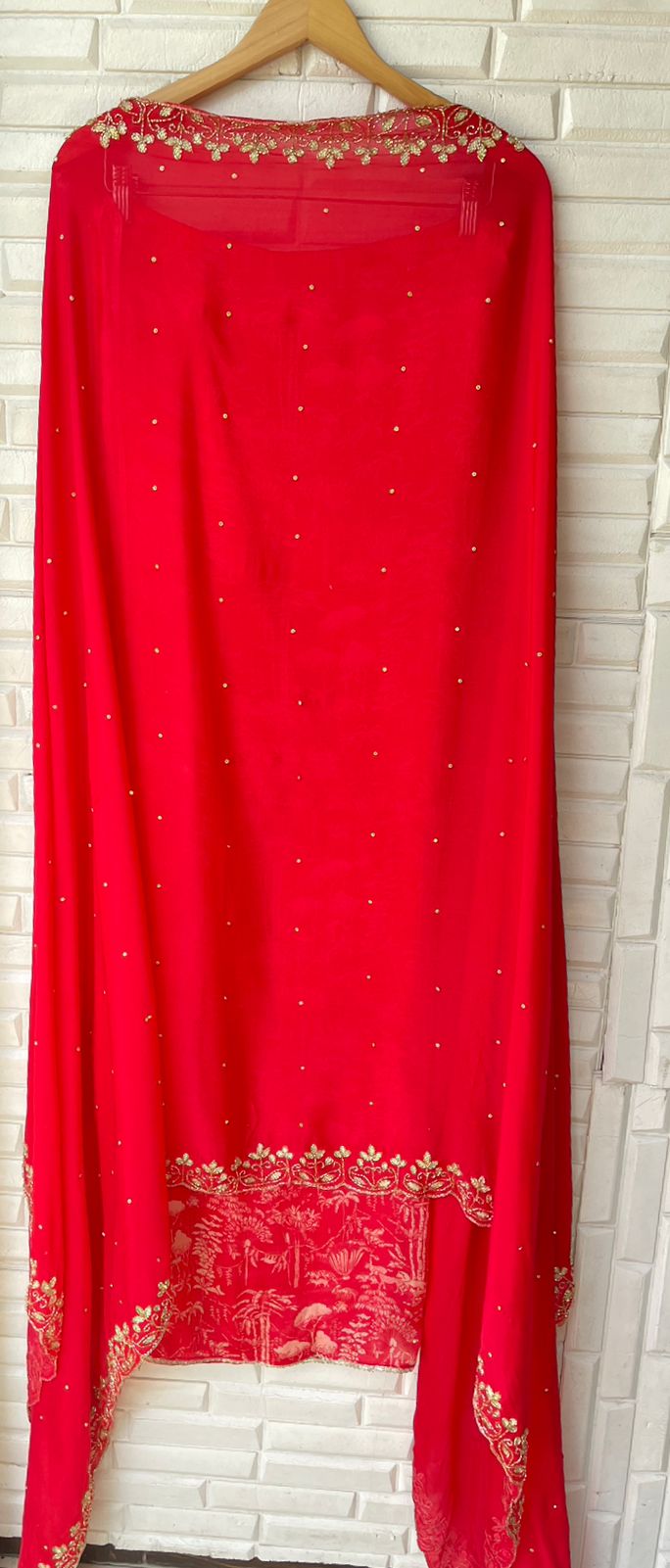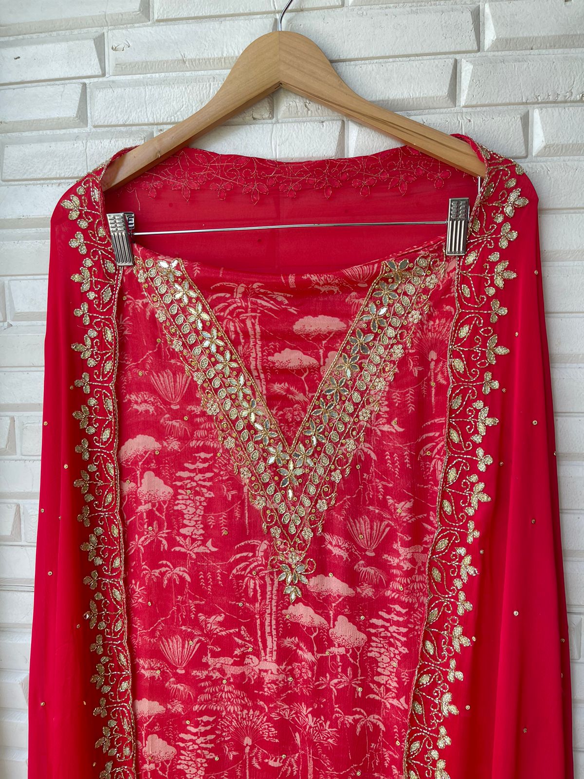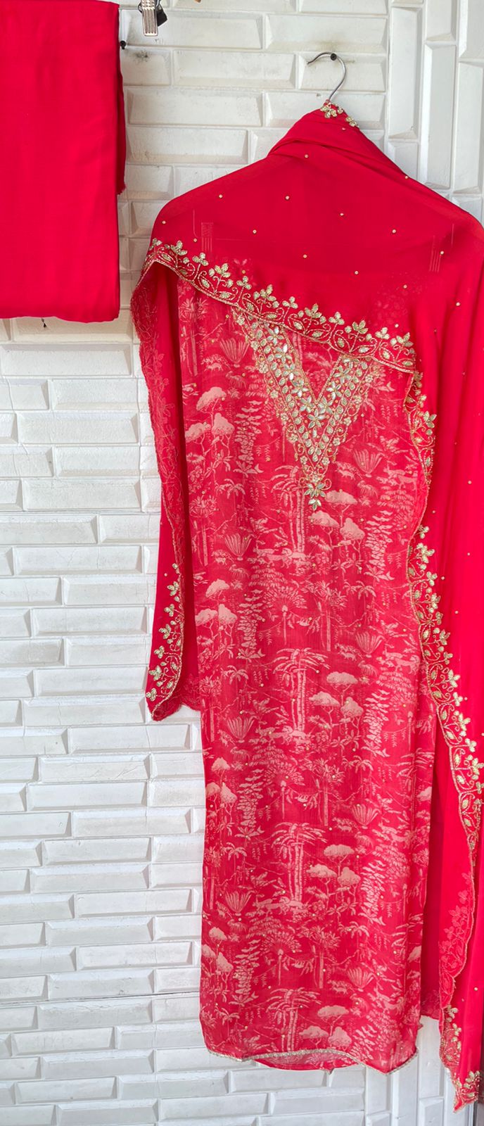 😊 pure chinnon silk printed fabric unstitched shirt with mirror work kutdanna swarowski pearl zari embroidery