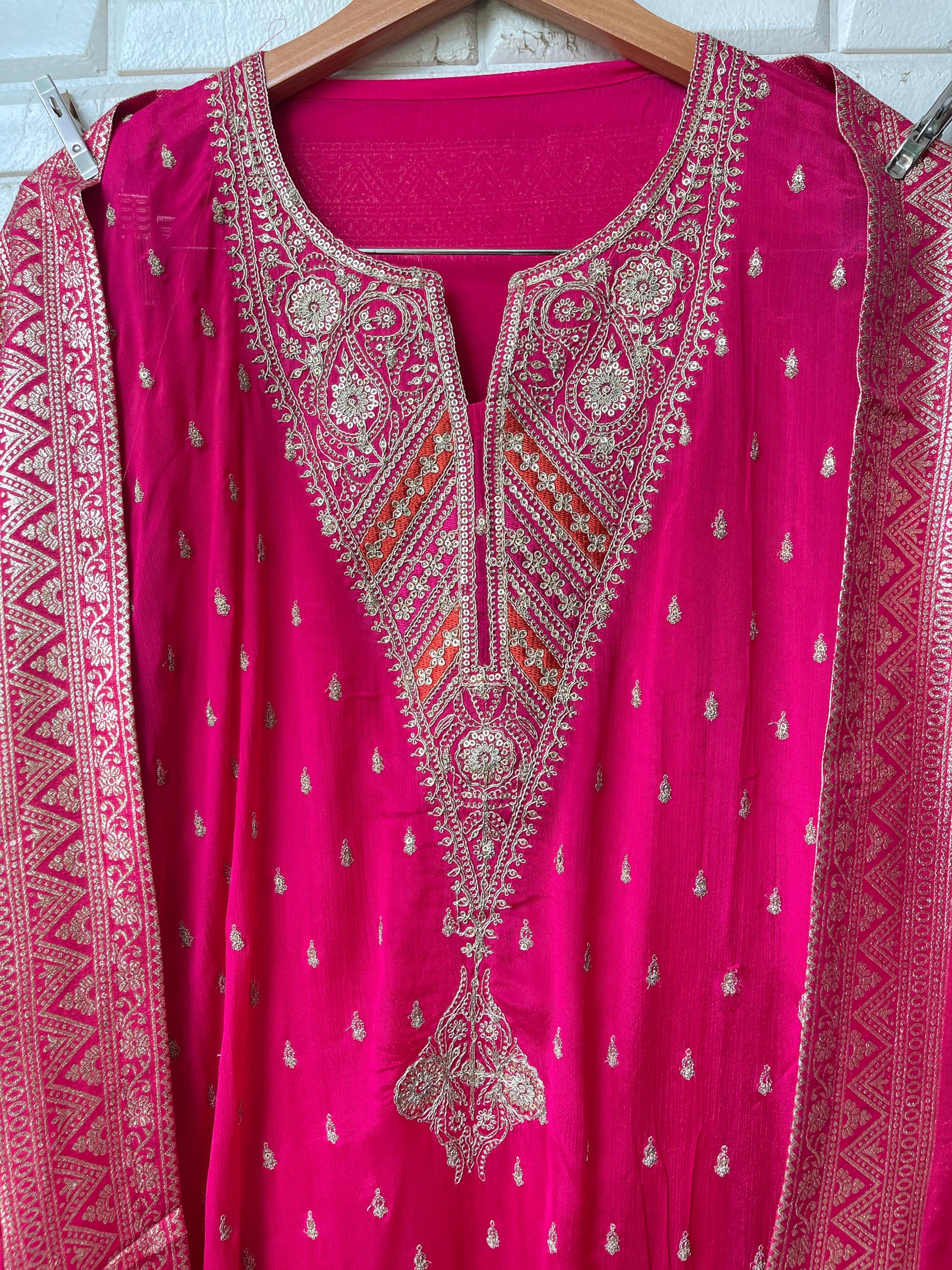 ☺ pure chinnon fabric unstitched shirt with and zari sequence embroidery
