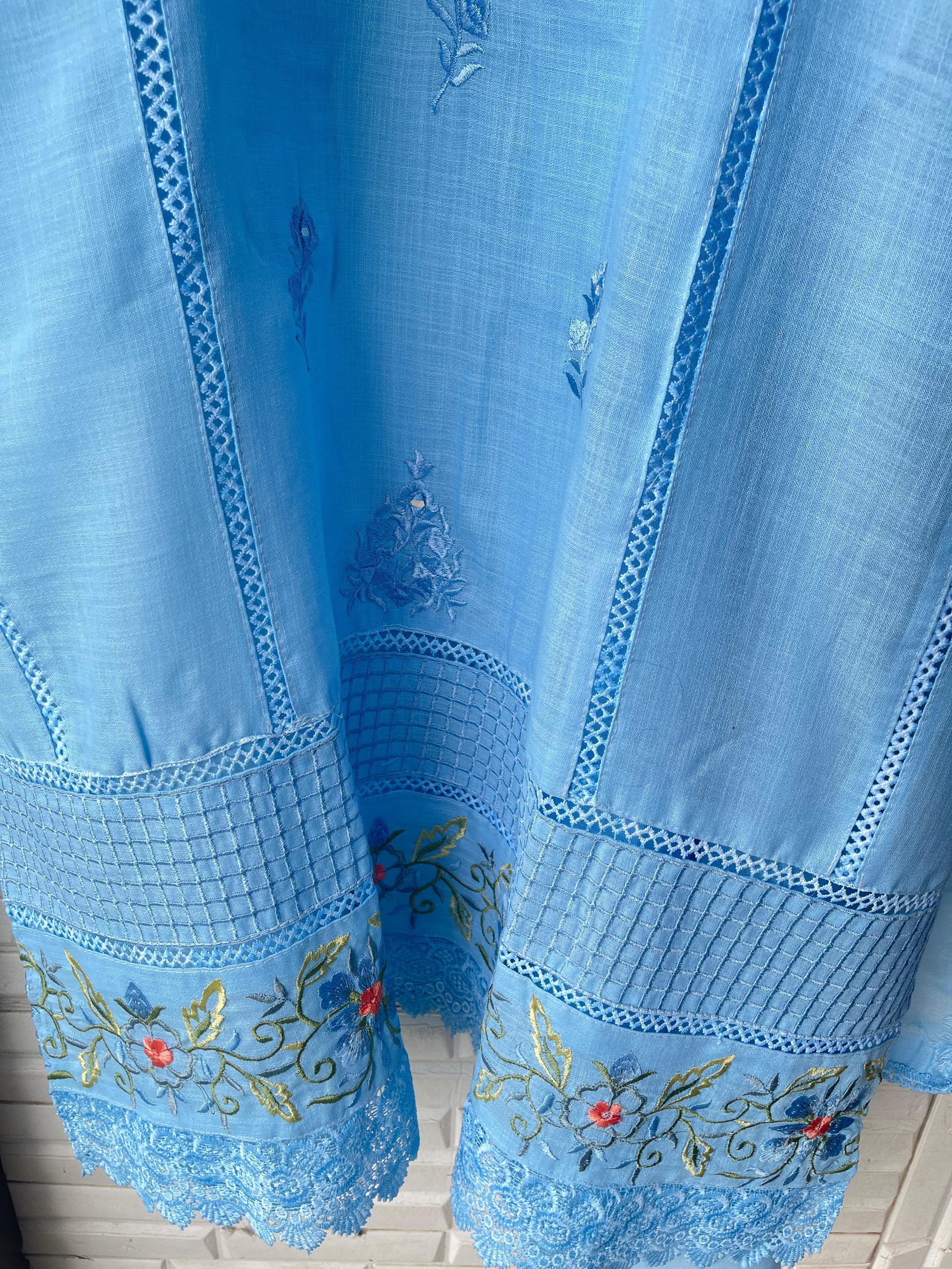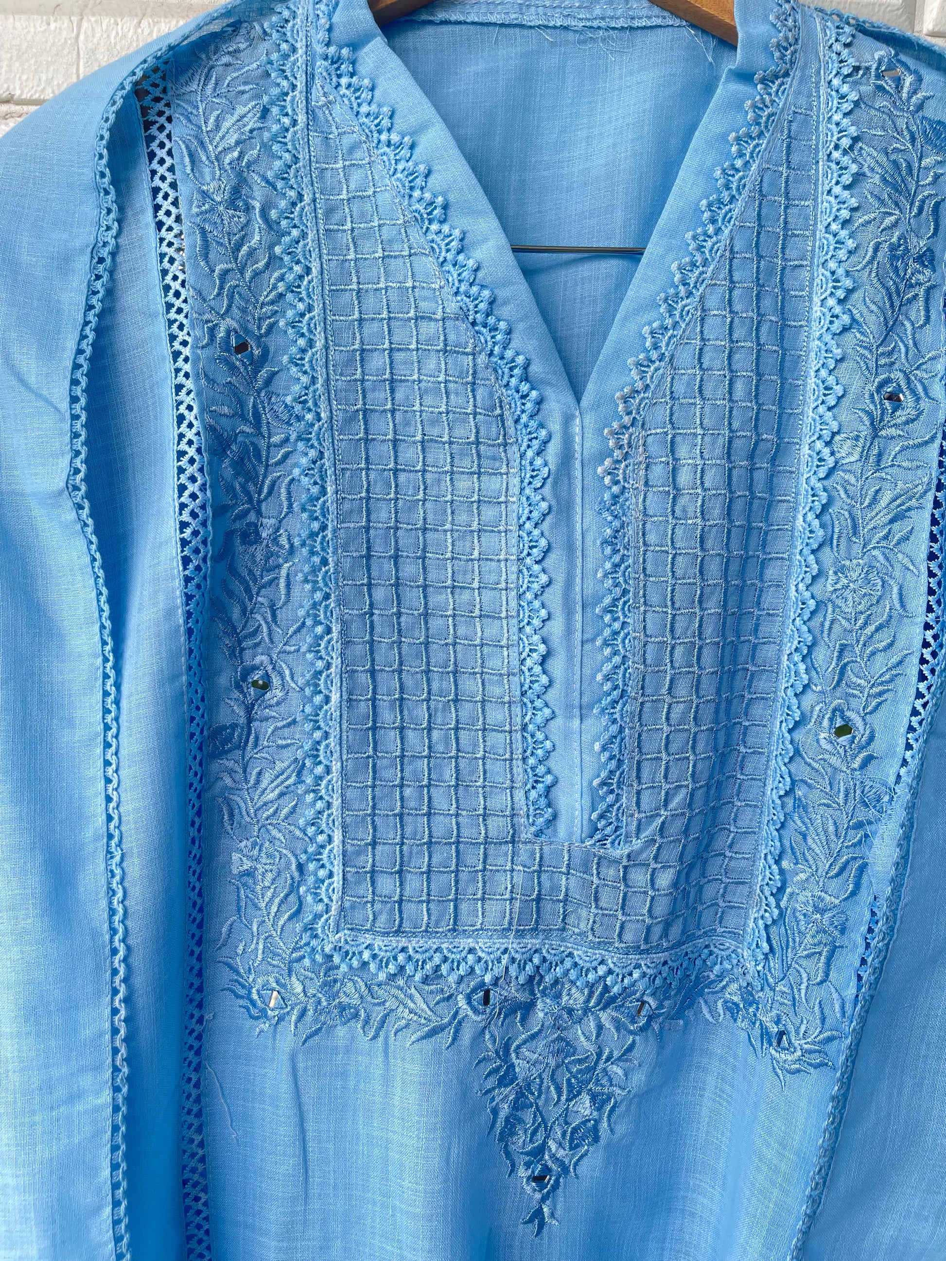 😊 cotton linen fabric unstitched shirt with crotia neck ghera work and insertions resham mirror work embroidery