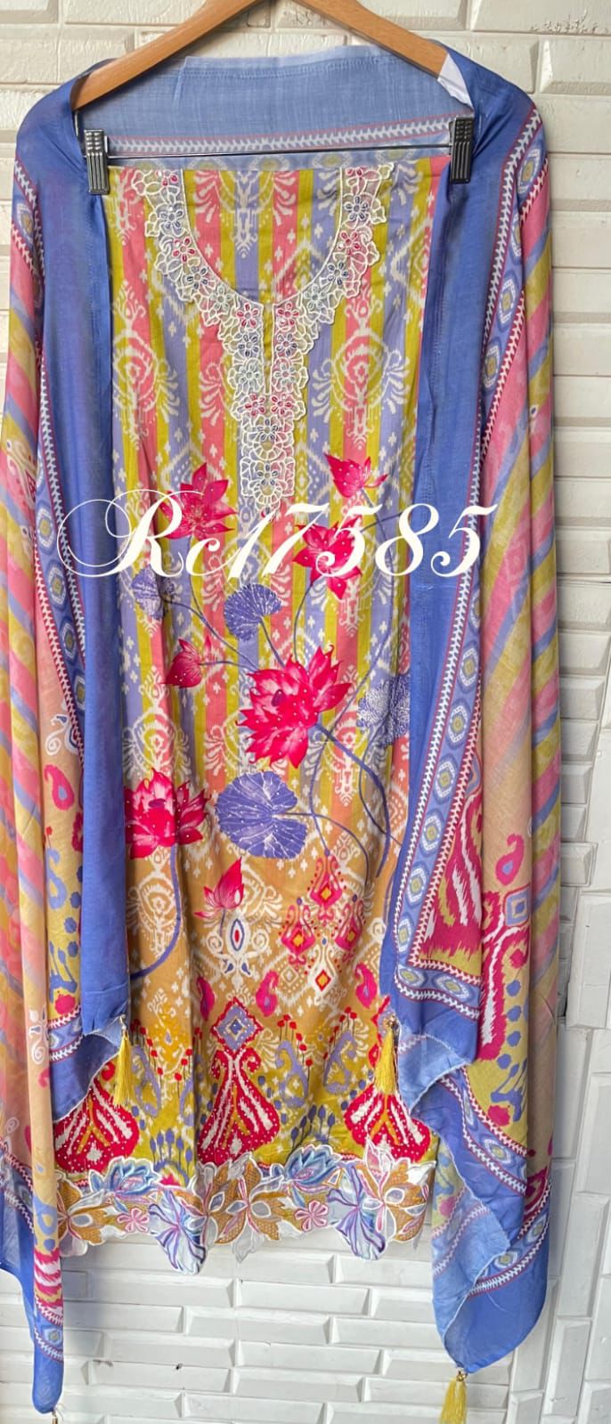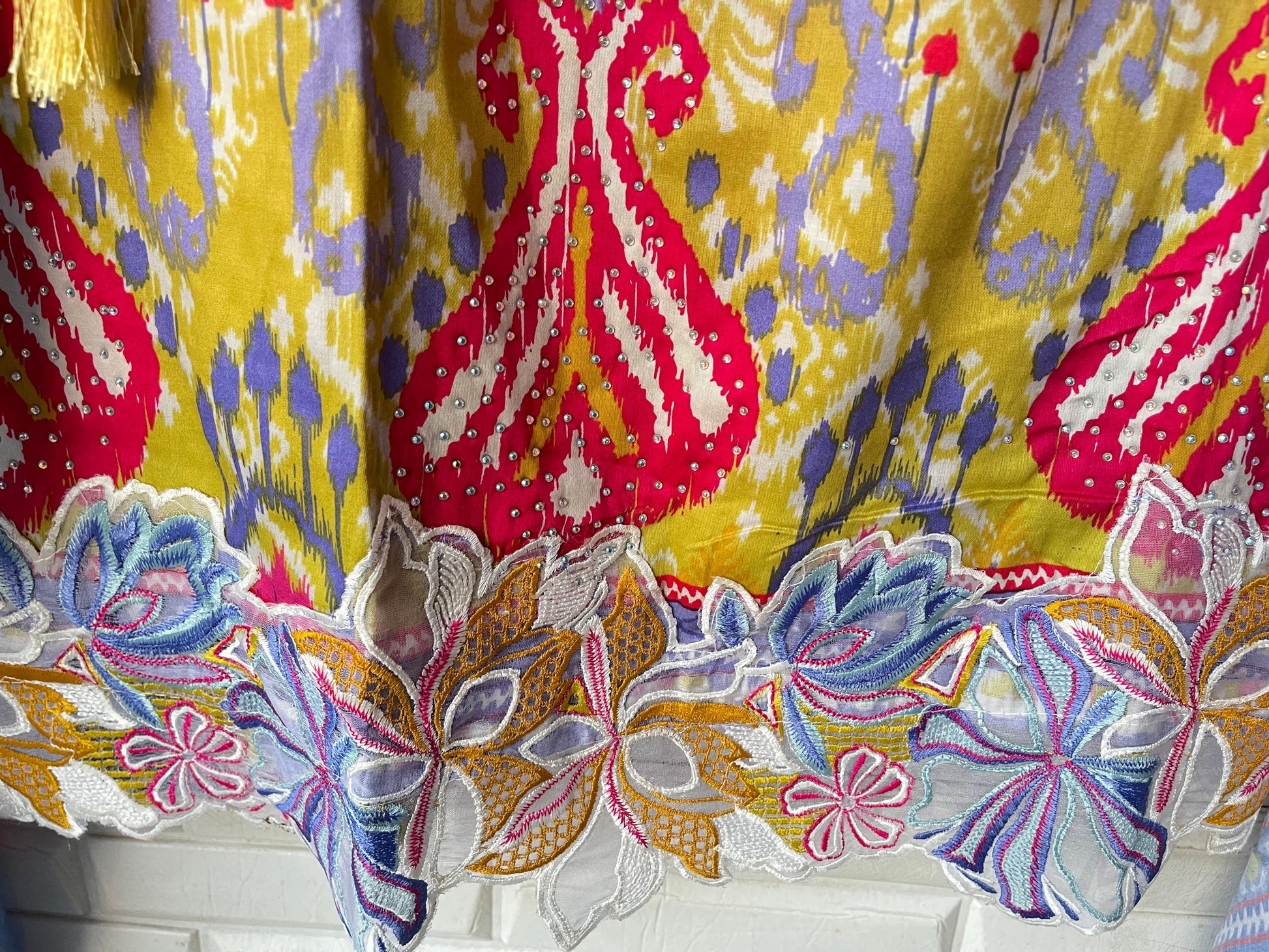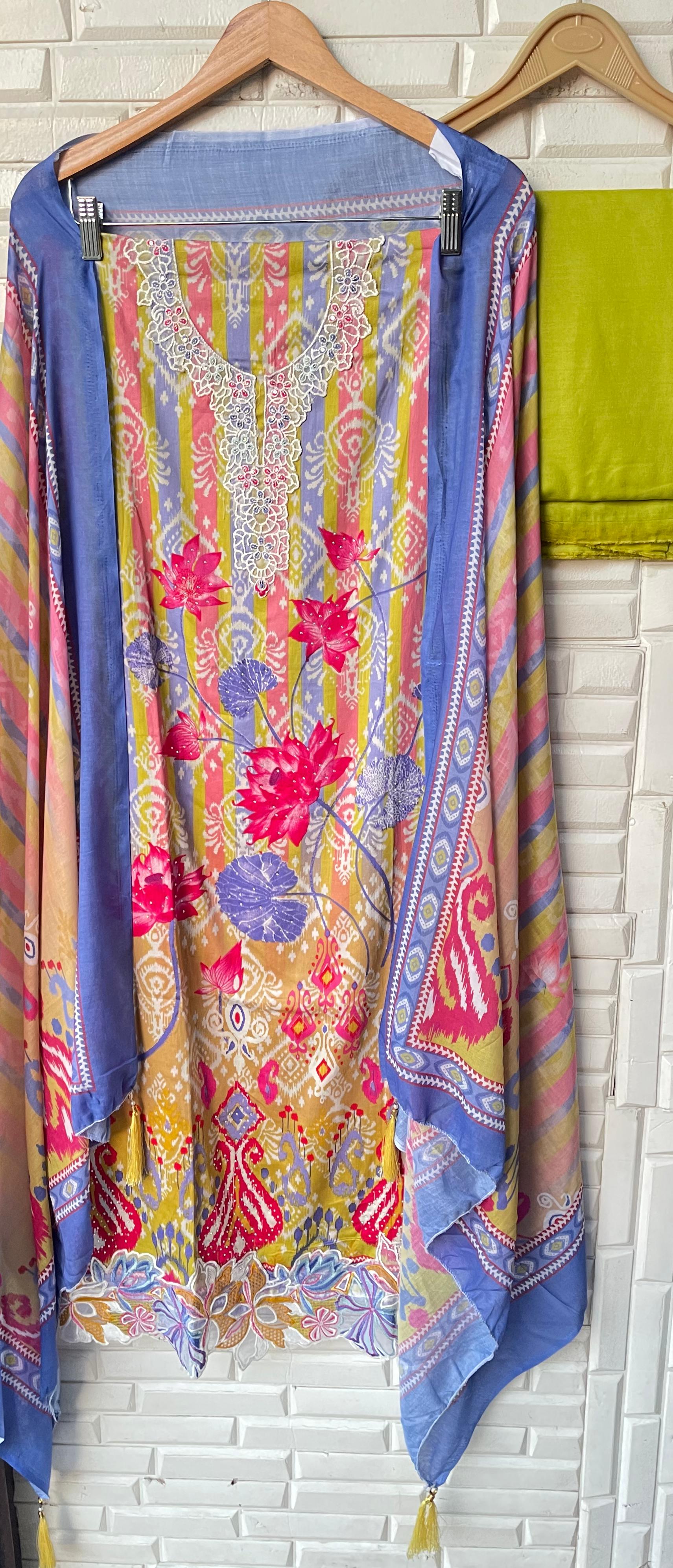๐ pure cotton printed fabric unstitched shirt with scattered swarowski highlighting crotia resham cutwork patchwork lace on neck and ghera