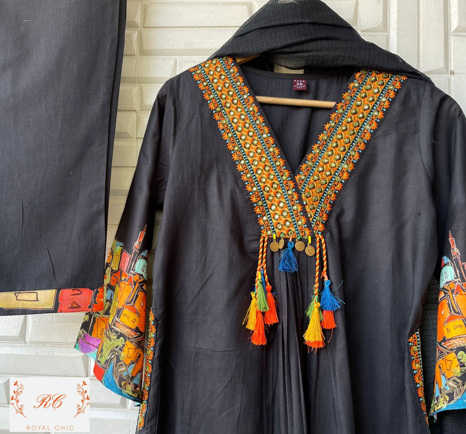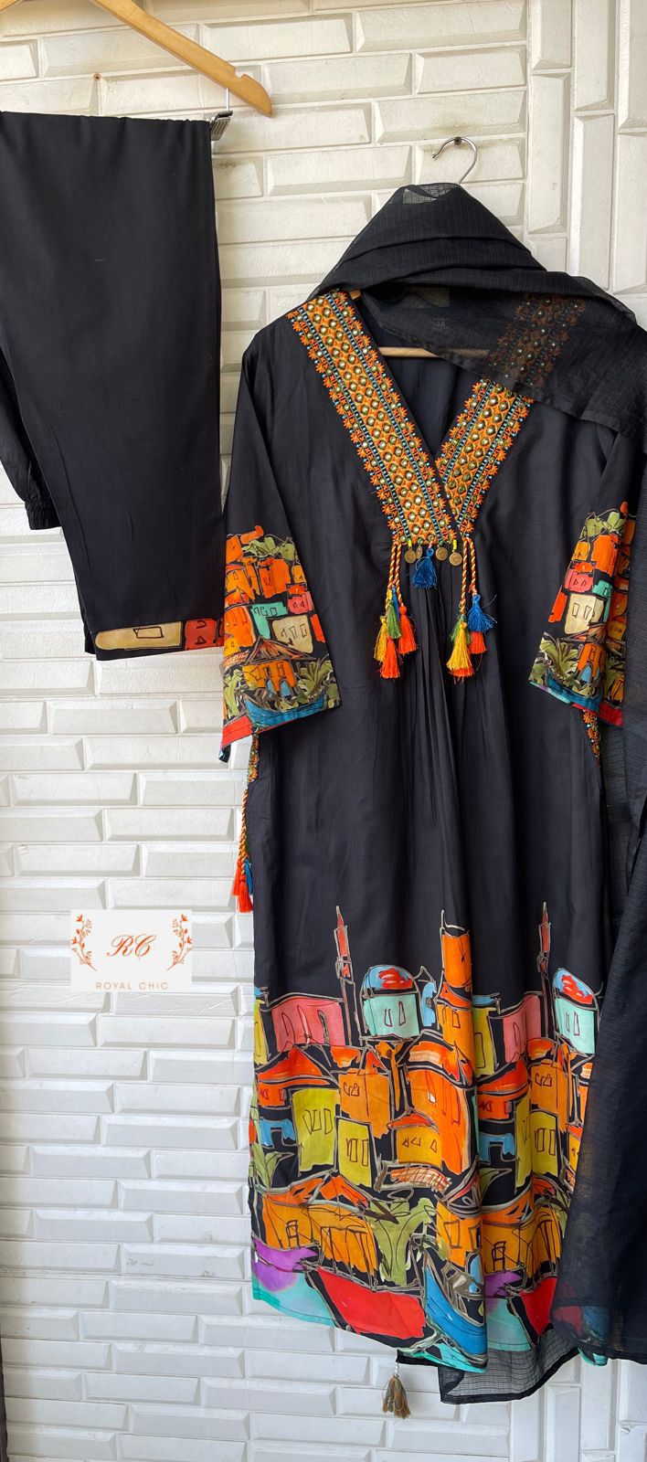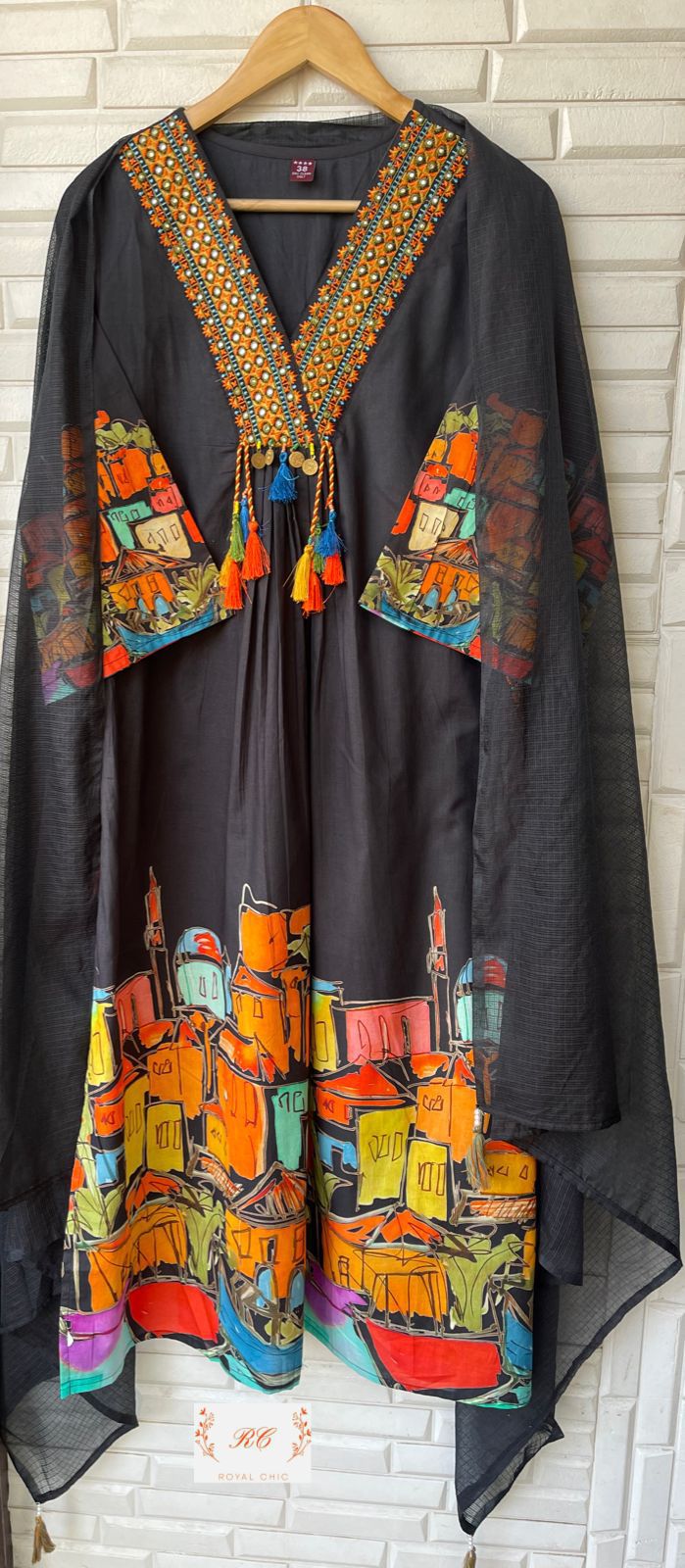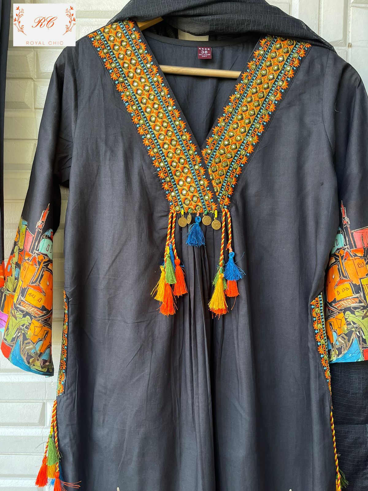 😊 find cotton printed fabric stitched shirt with gotta mirror pathri work reshan embroidery and tassels on the slits