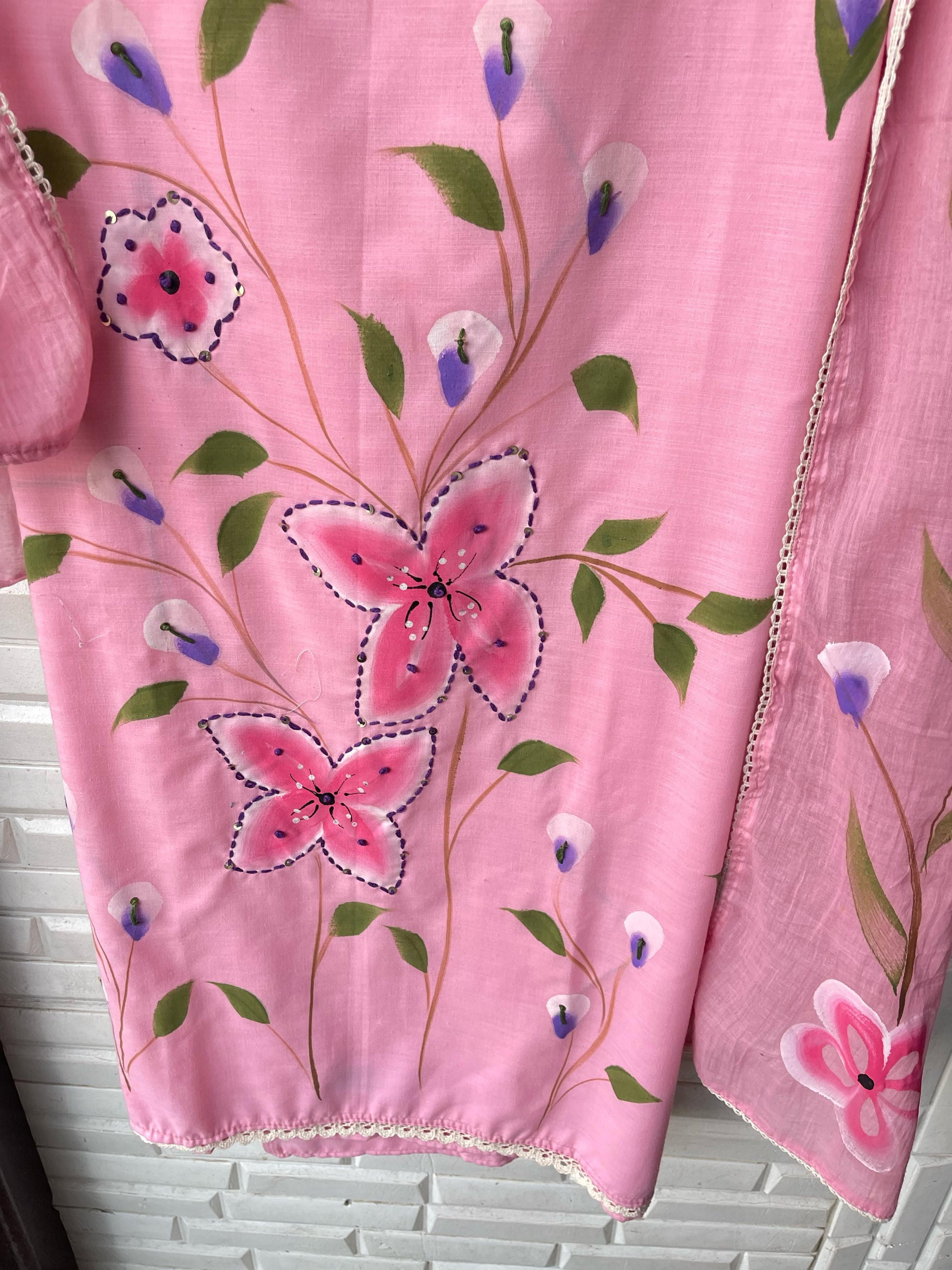 😊 cotton brush painted fabric unstitched shirt with crotia lace sequence resham knots embroidery