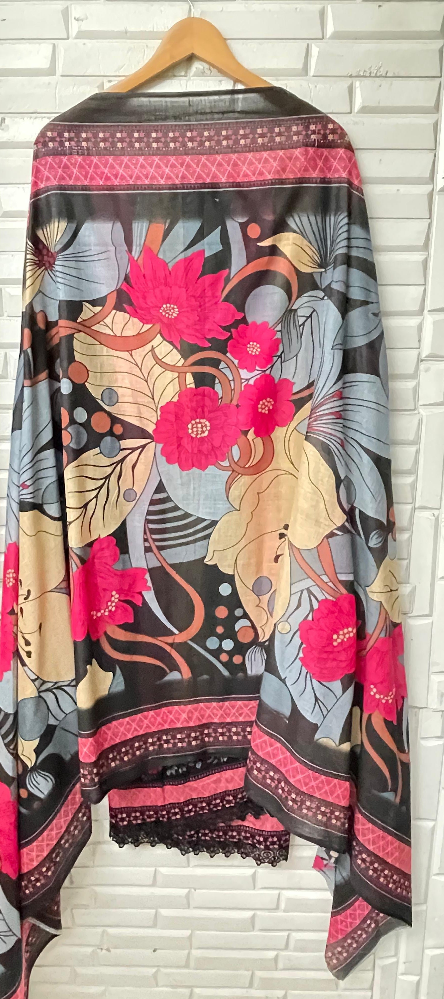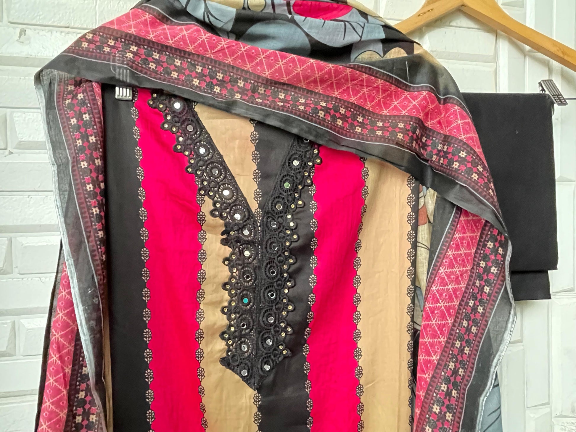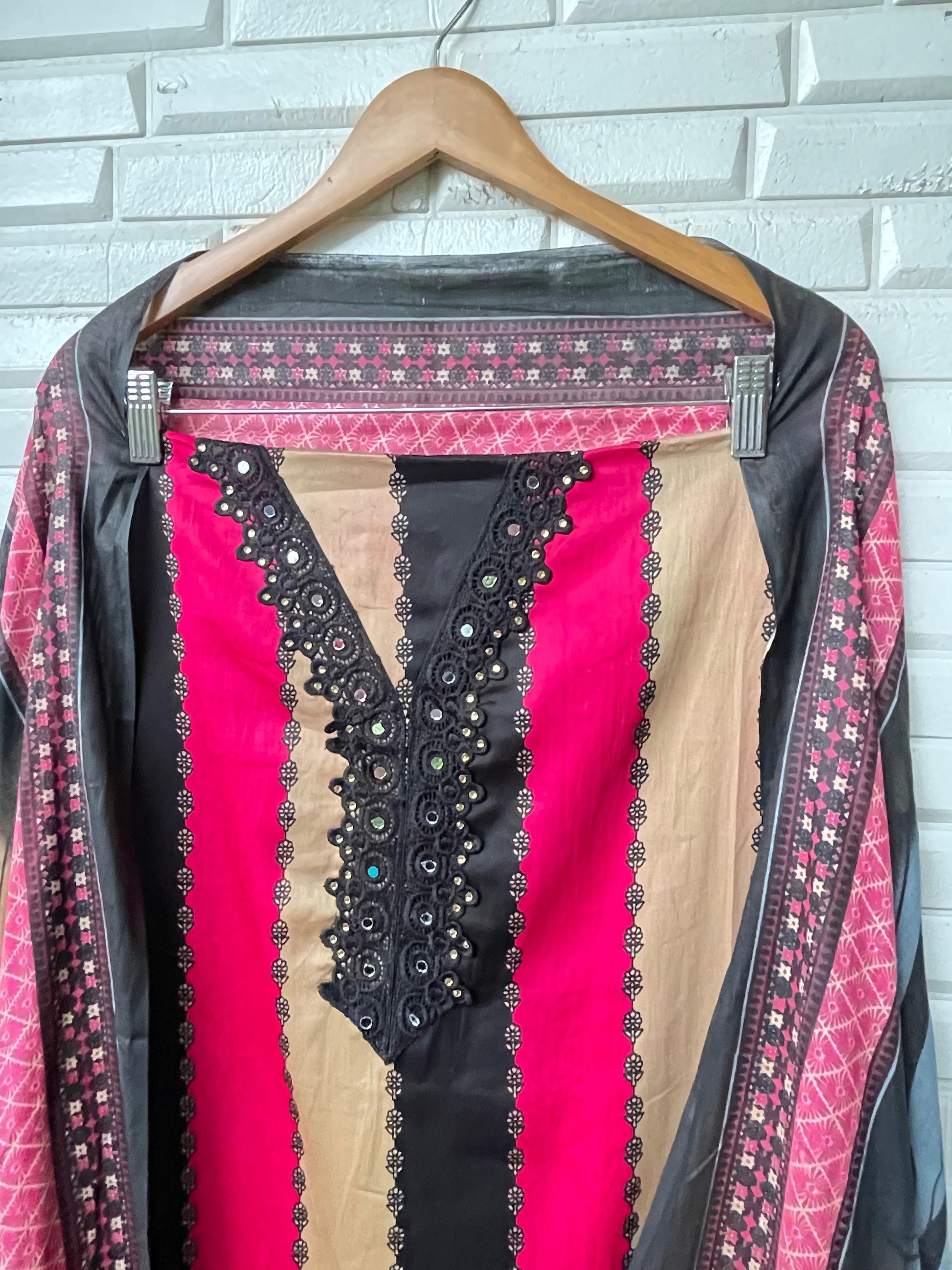 😊 soft cotton printed fabric unstitched shirt with crotia kurta patti with scattered swarowski mirror work highlighting and crotia ghera lace