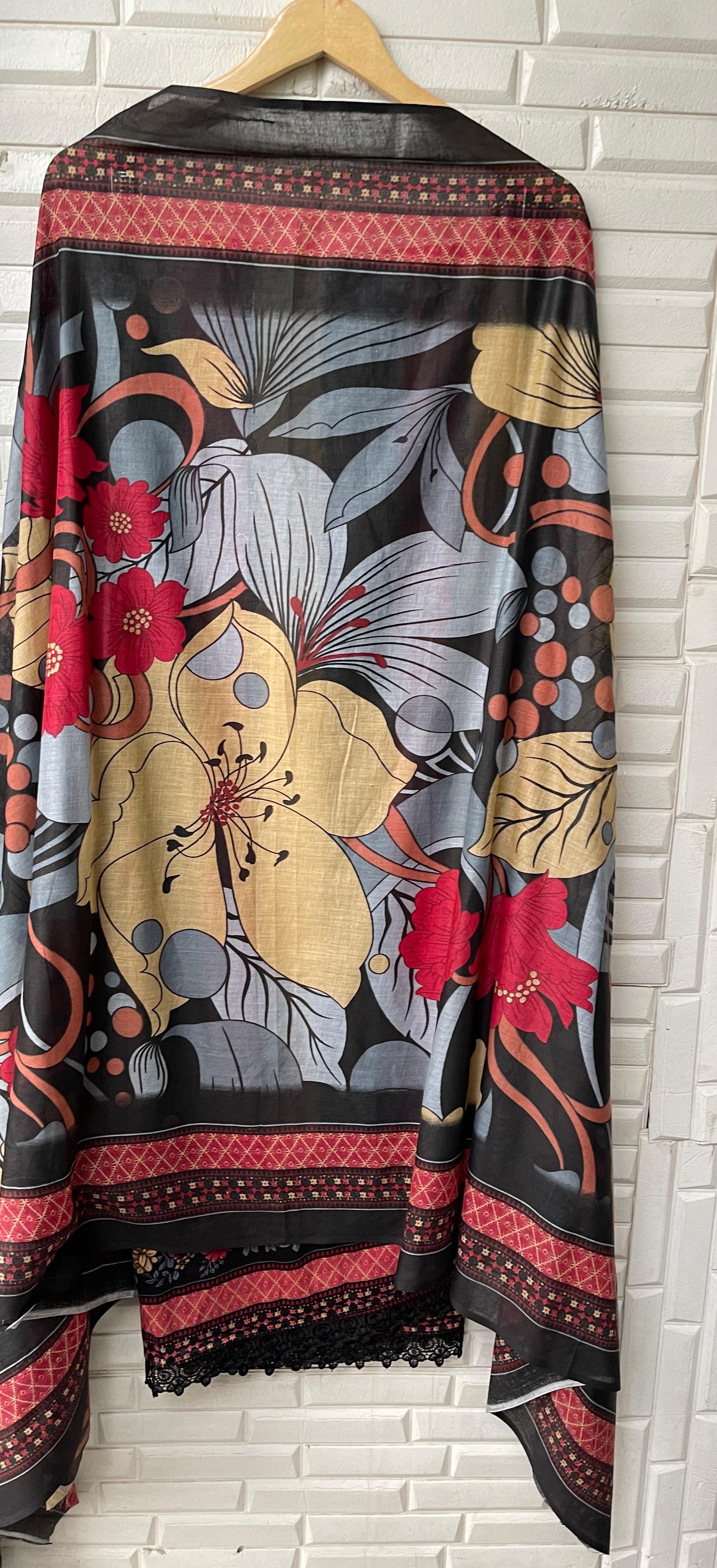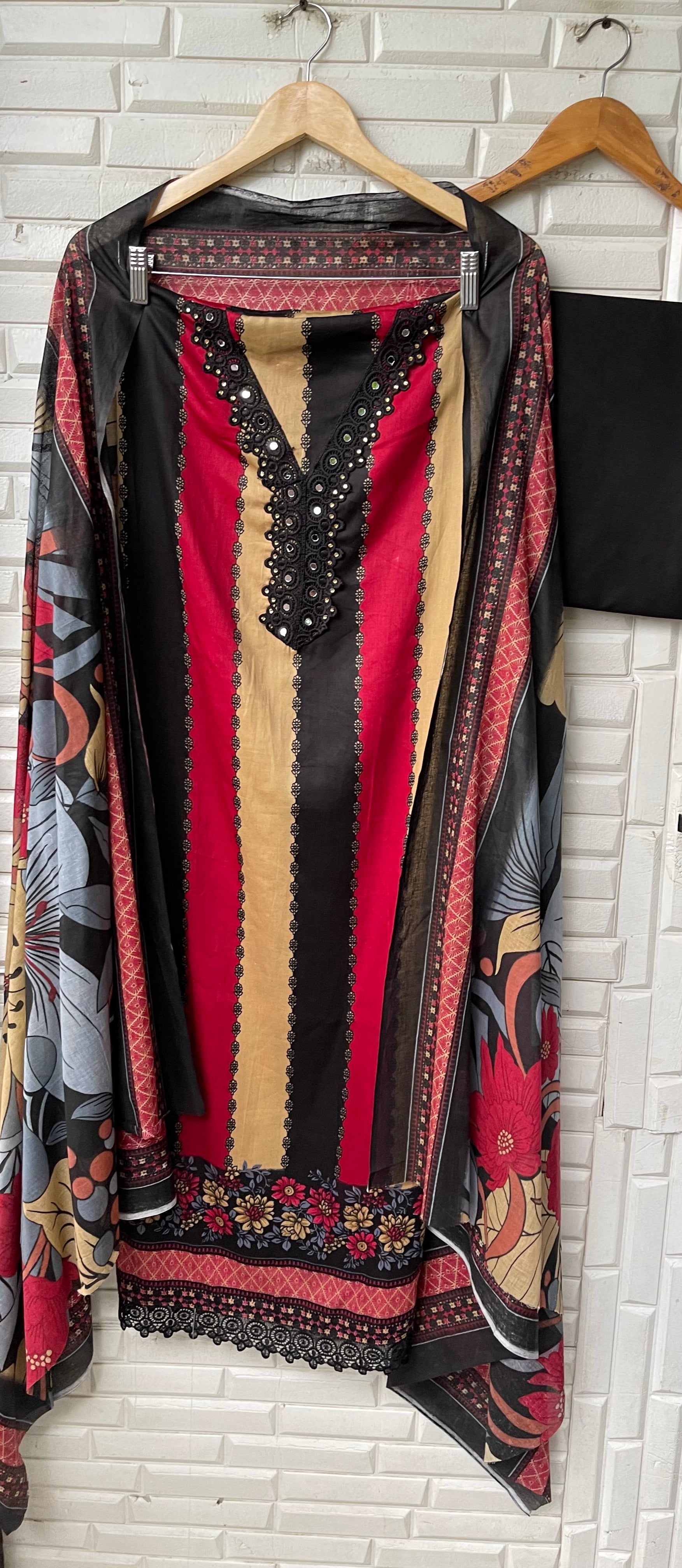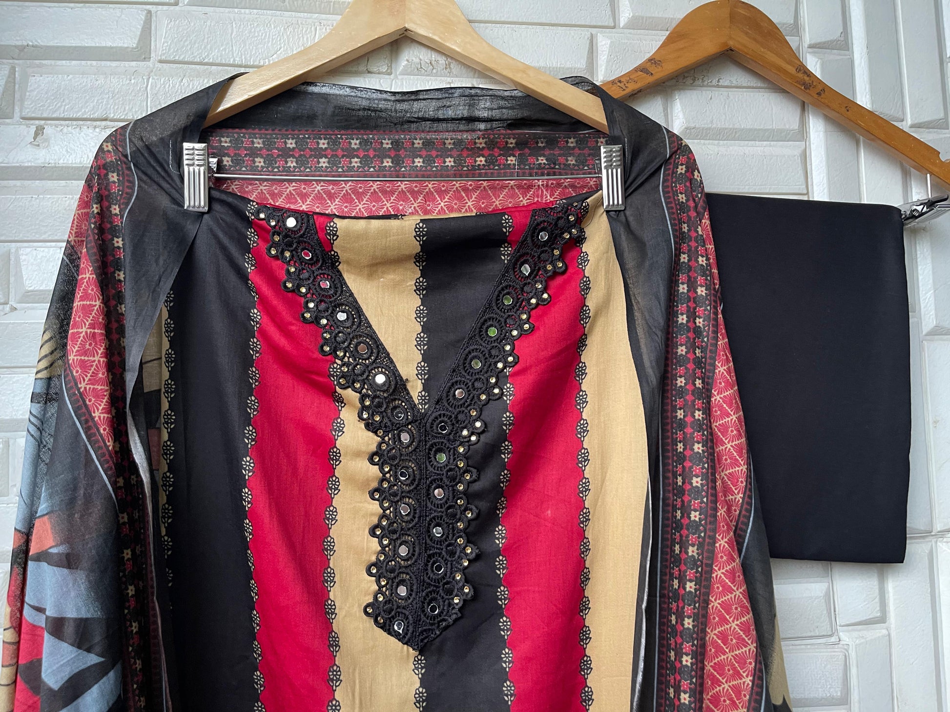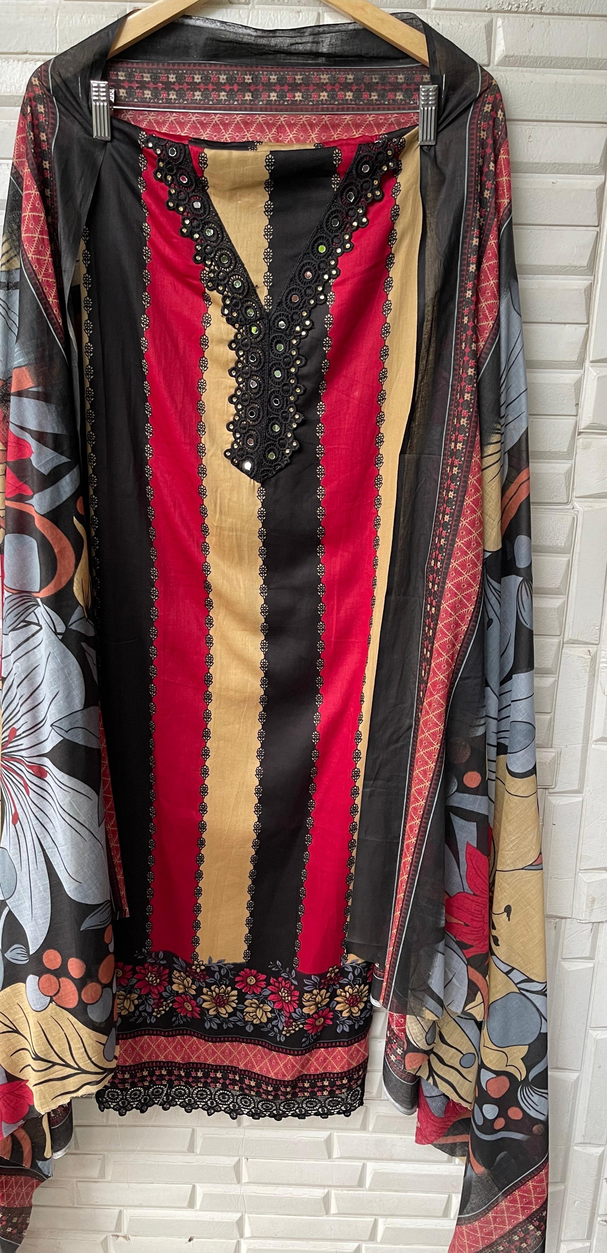 π soft cotton printed fabric unstitched shirt with crotia kurta patti with scattered swarowski mirror work highlighting and crotia ghera lace
