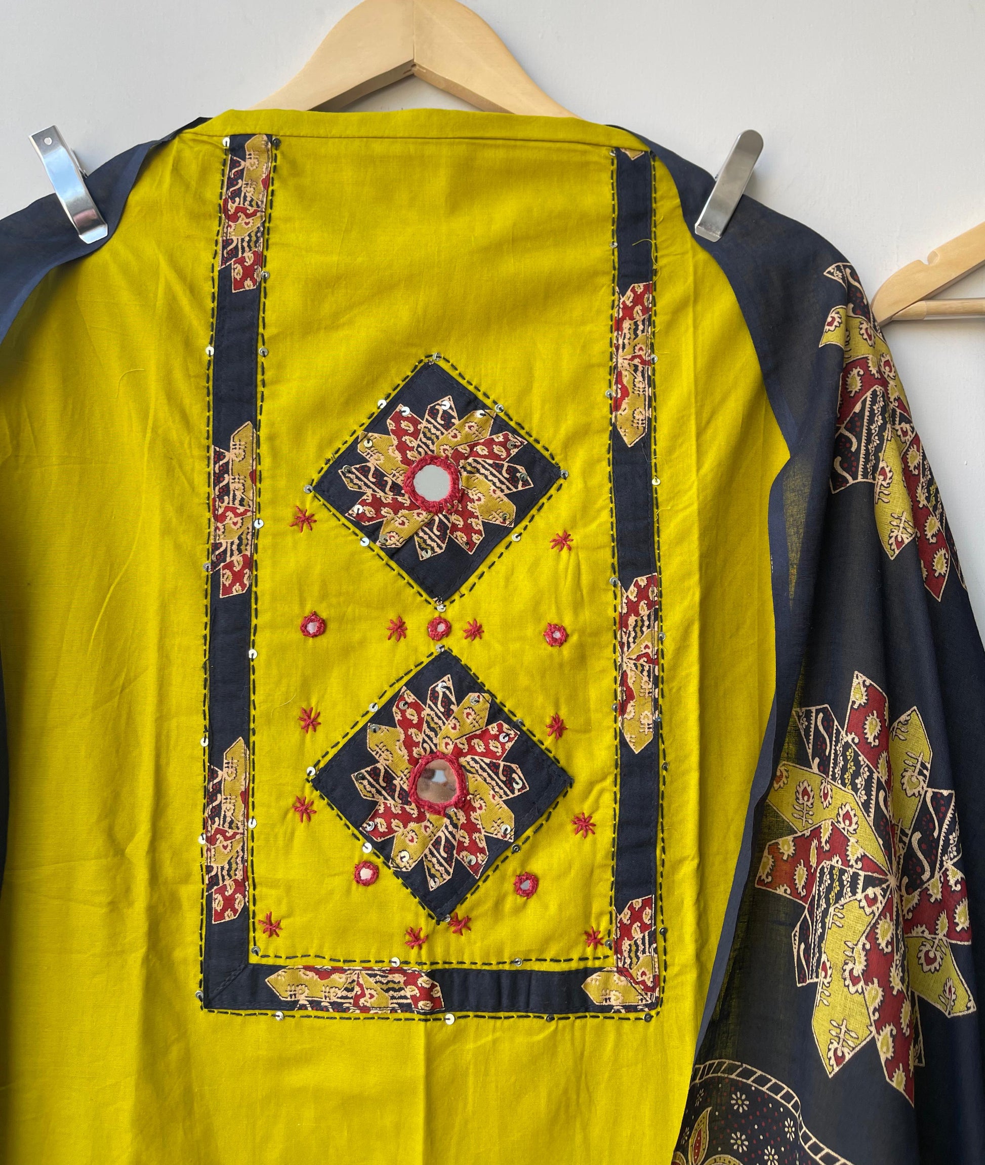 😊 cotton fabric unstitched shirt with printed patches on neck n ghera with resham mirror work sequence embroidery