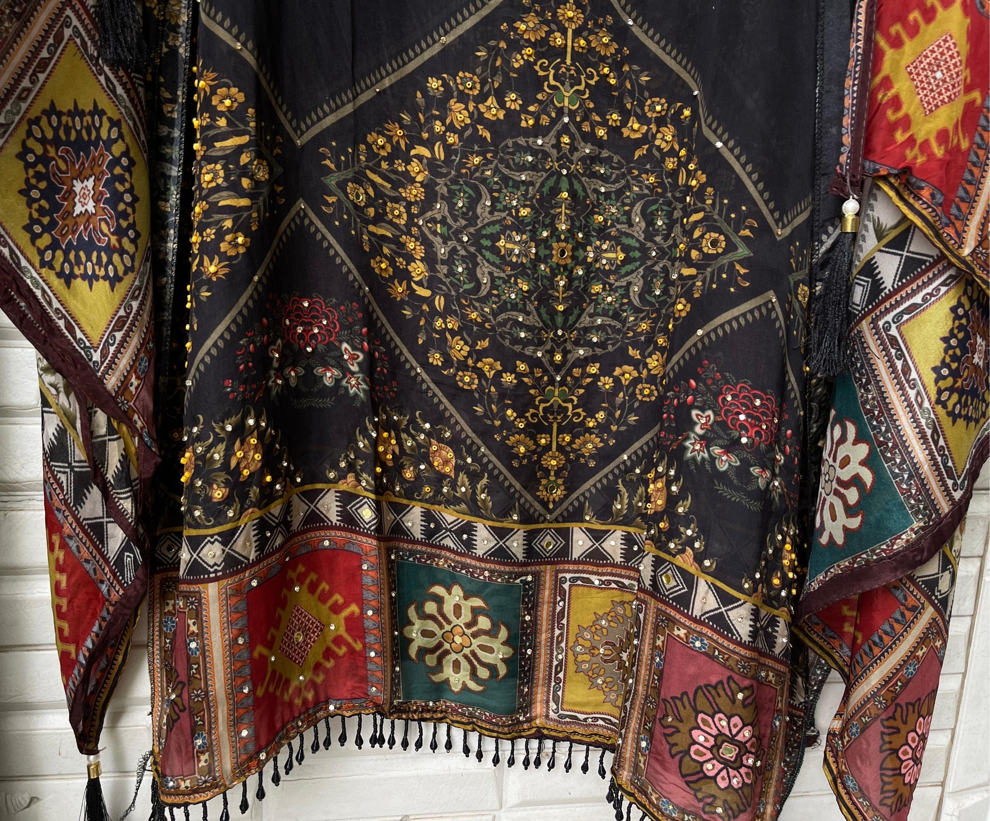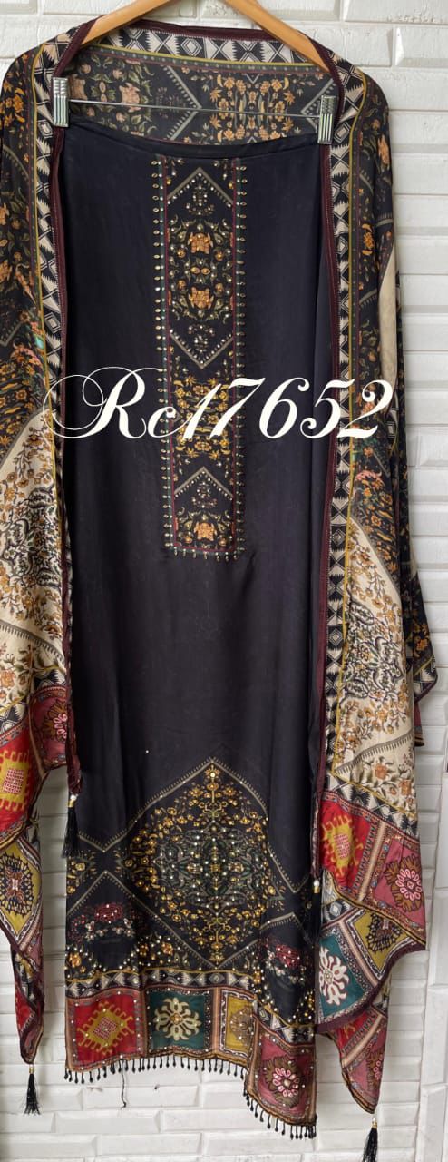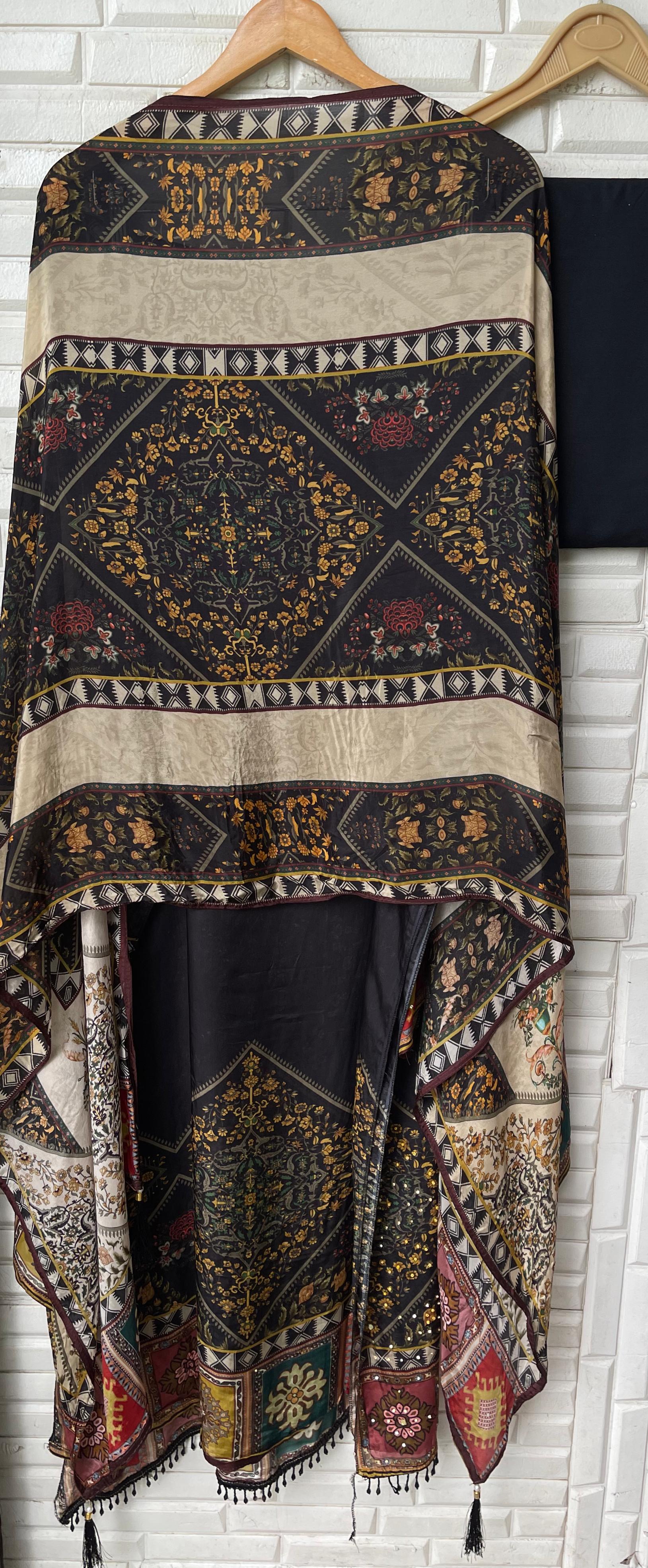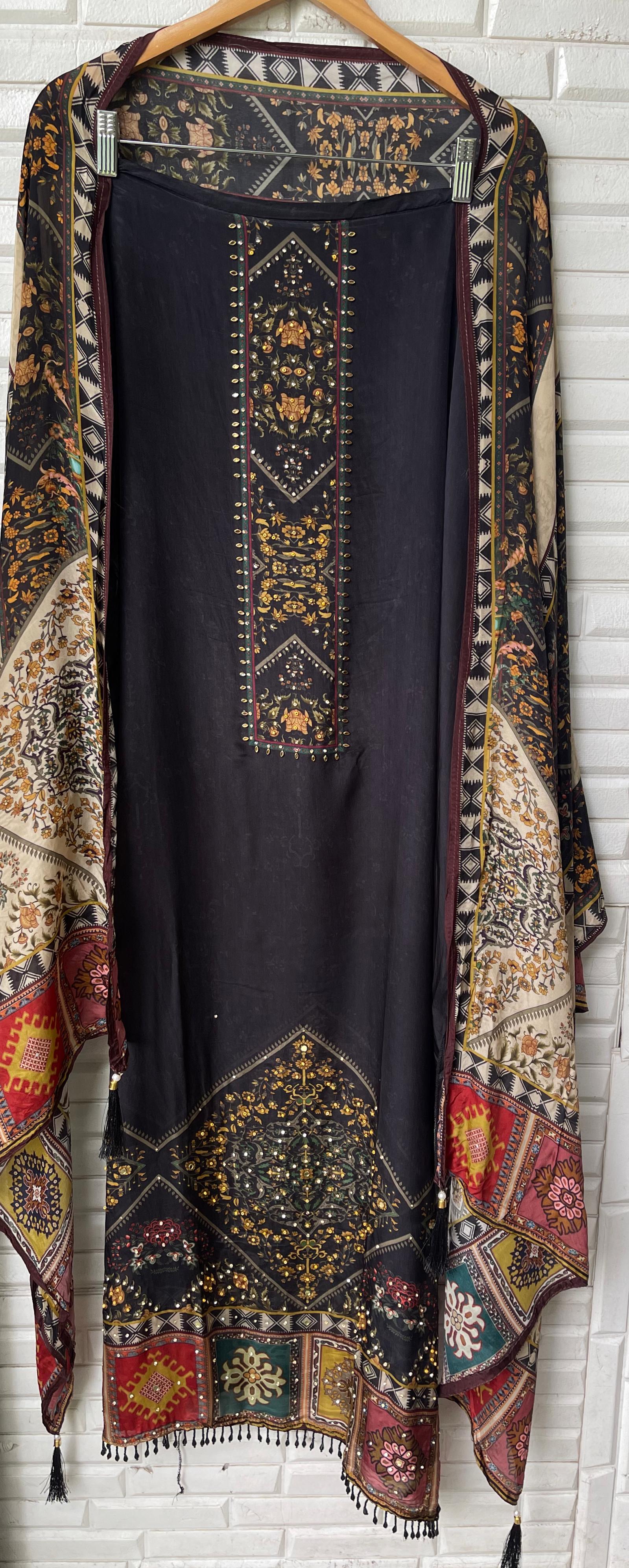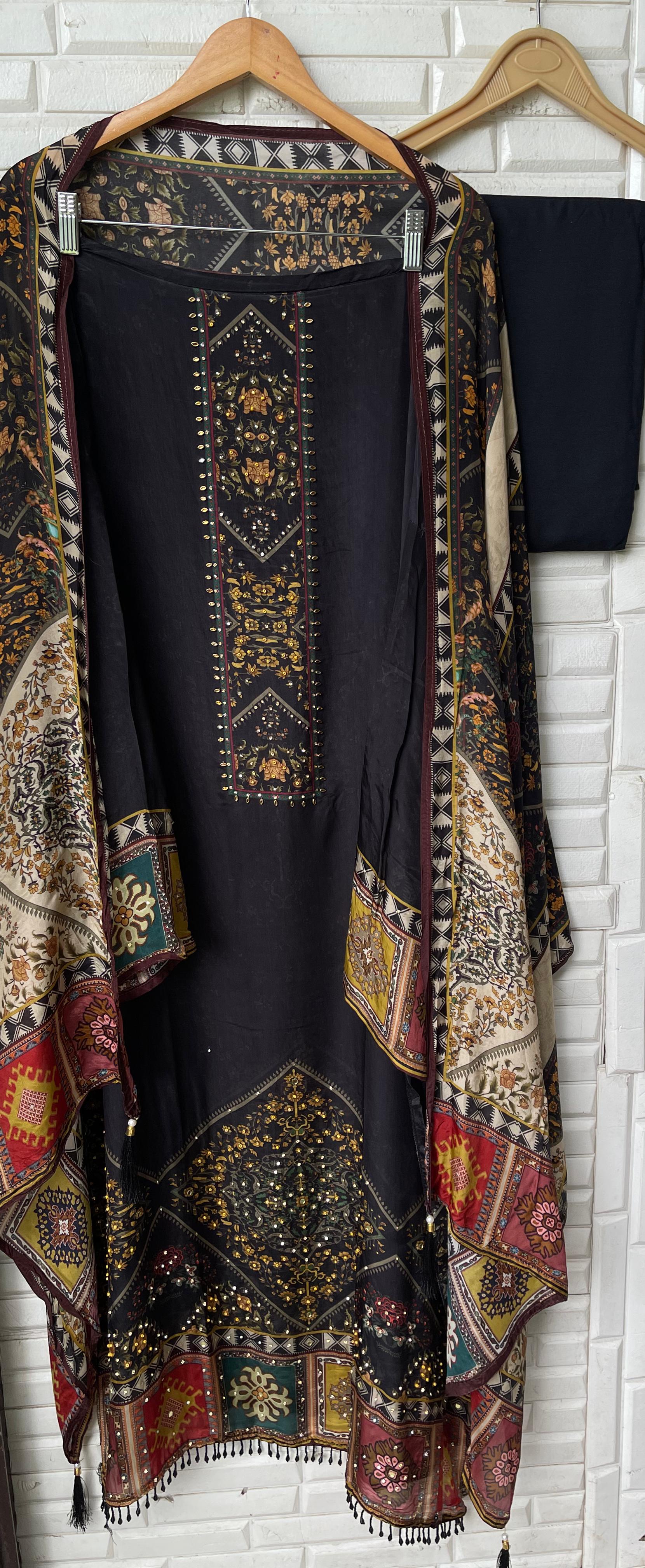 π crape satin fabric unstitched shirt with kundan beads Swarowski embroidery and paerl hanging lace on ghera