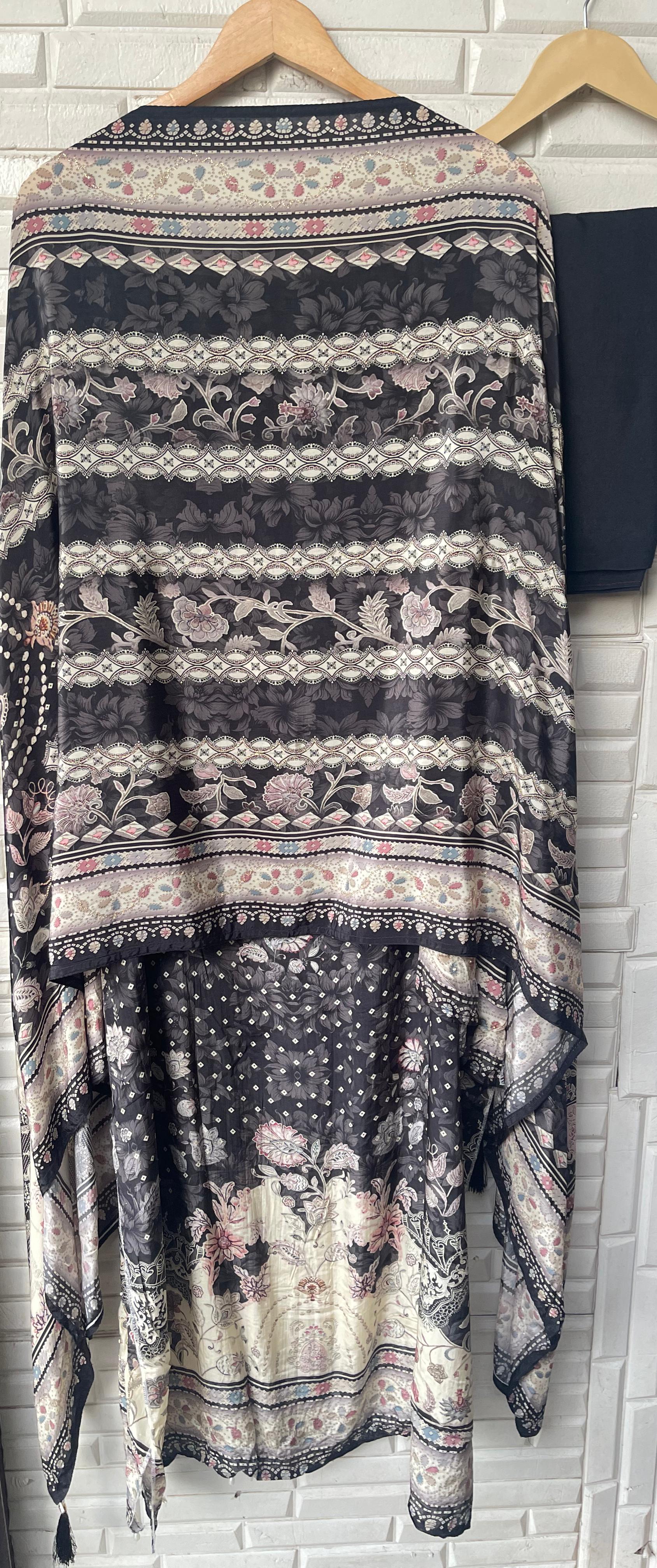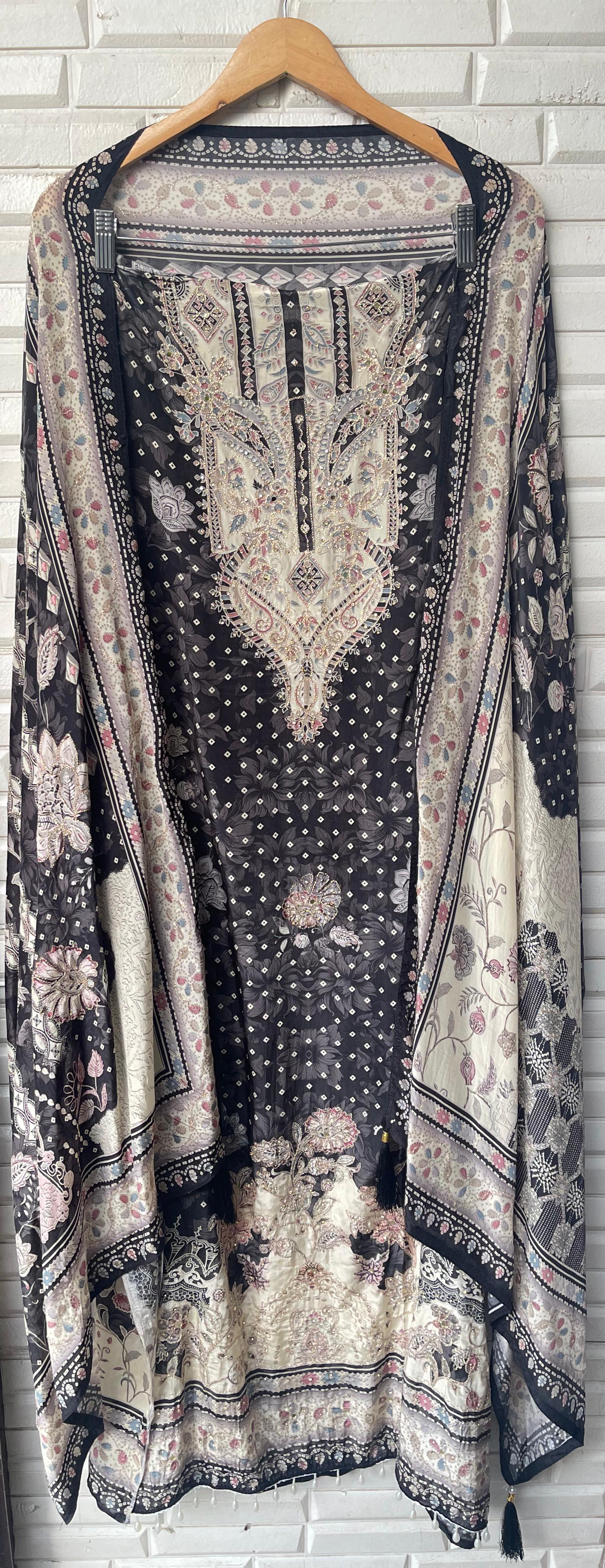 ๐ crape Satan printed fabric unstitched shirt with mirror work swarowski zari embroidery