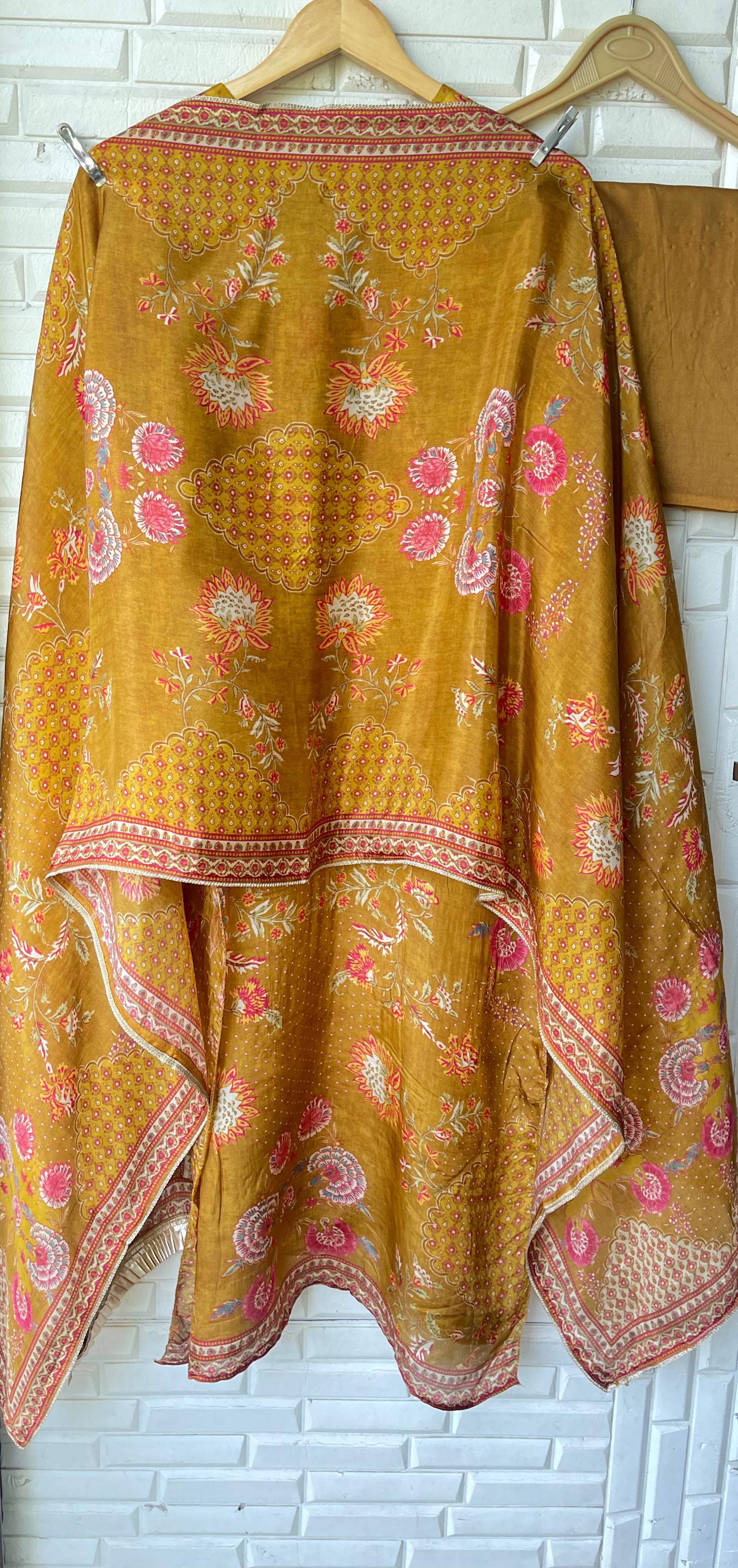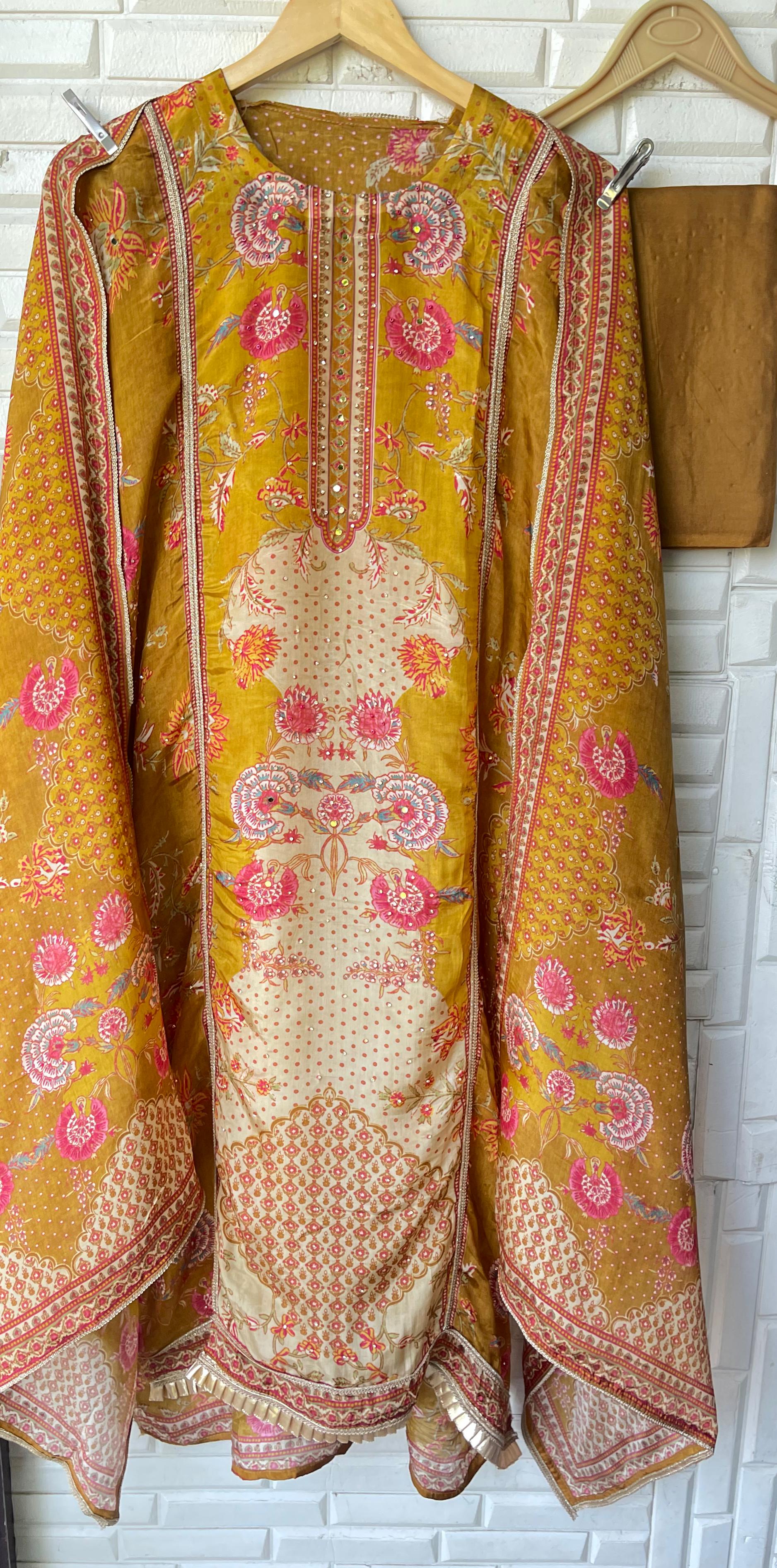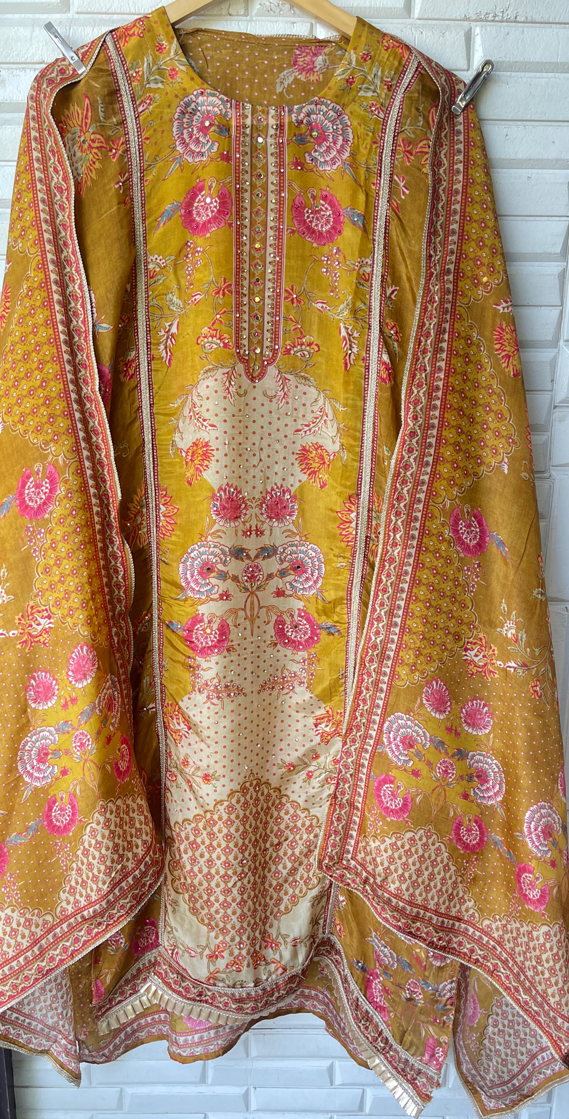 π crape satin silk fabric unstitched shirt with mirror work swarowski highlighting and zari lace
