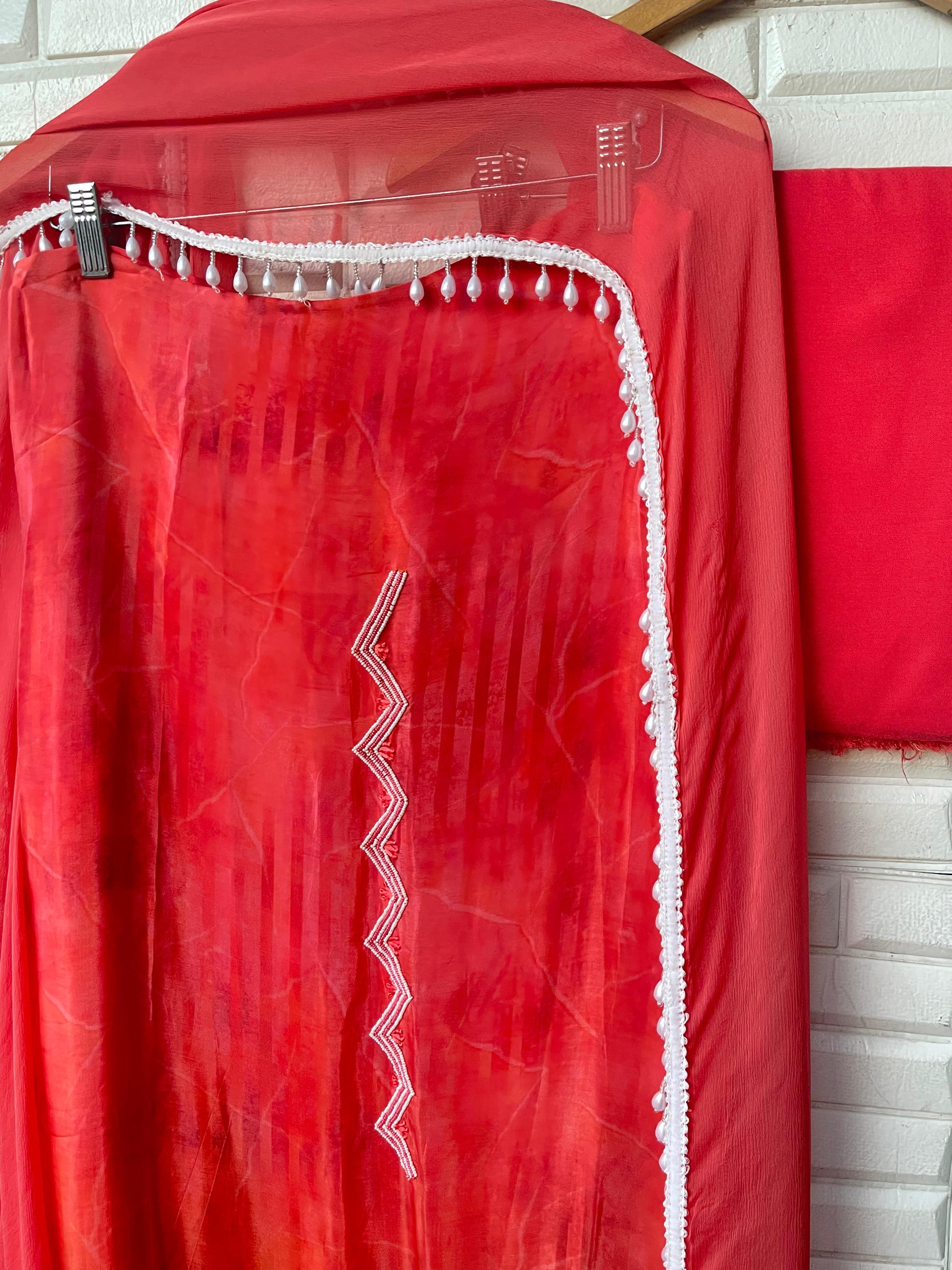 π crape silk print shaded fabric unstitched shirt with kutdanna pearl sequence resham embroidery and pearl hanging ghera lace