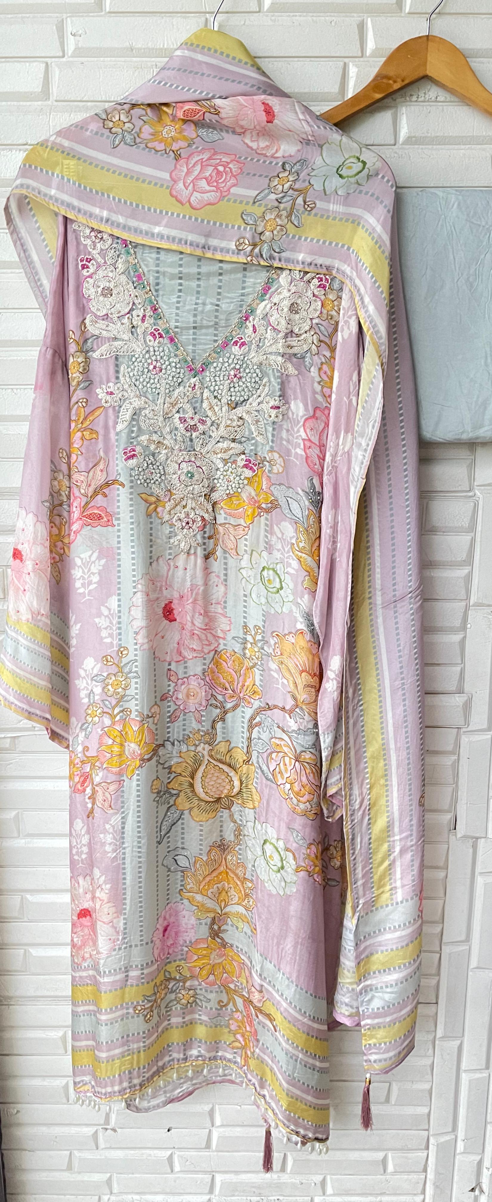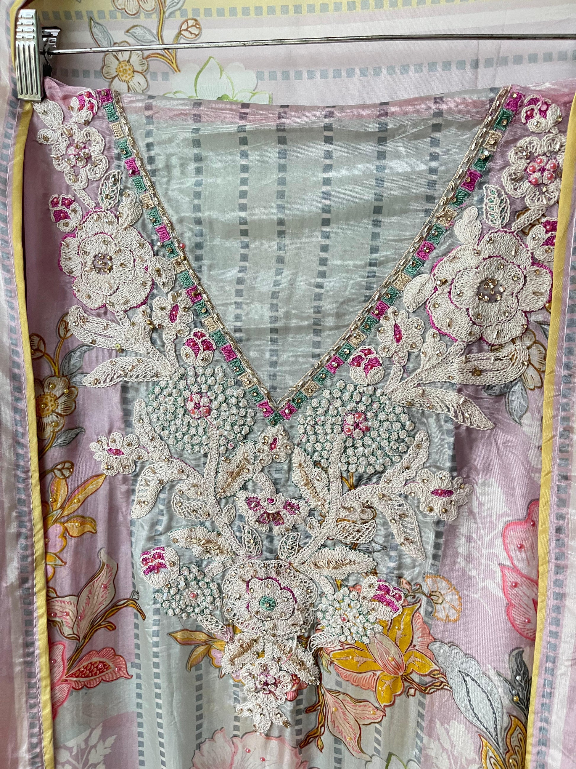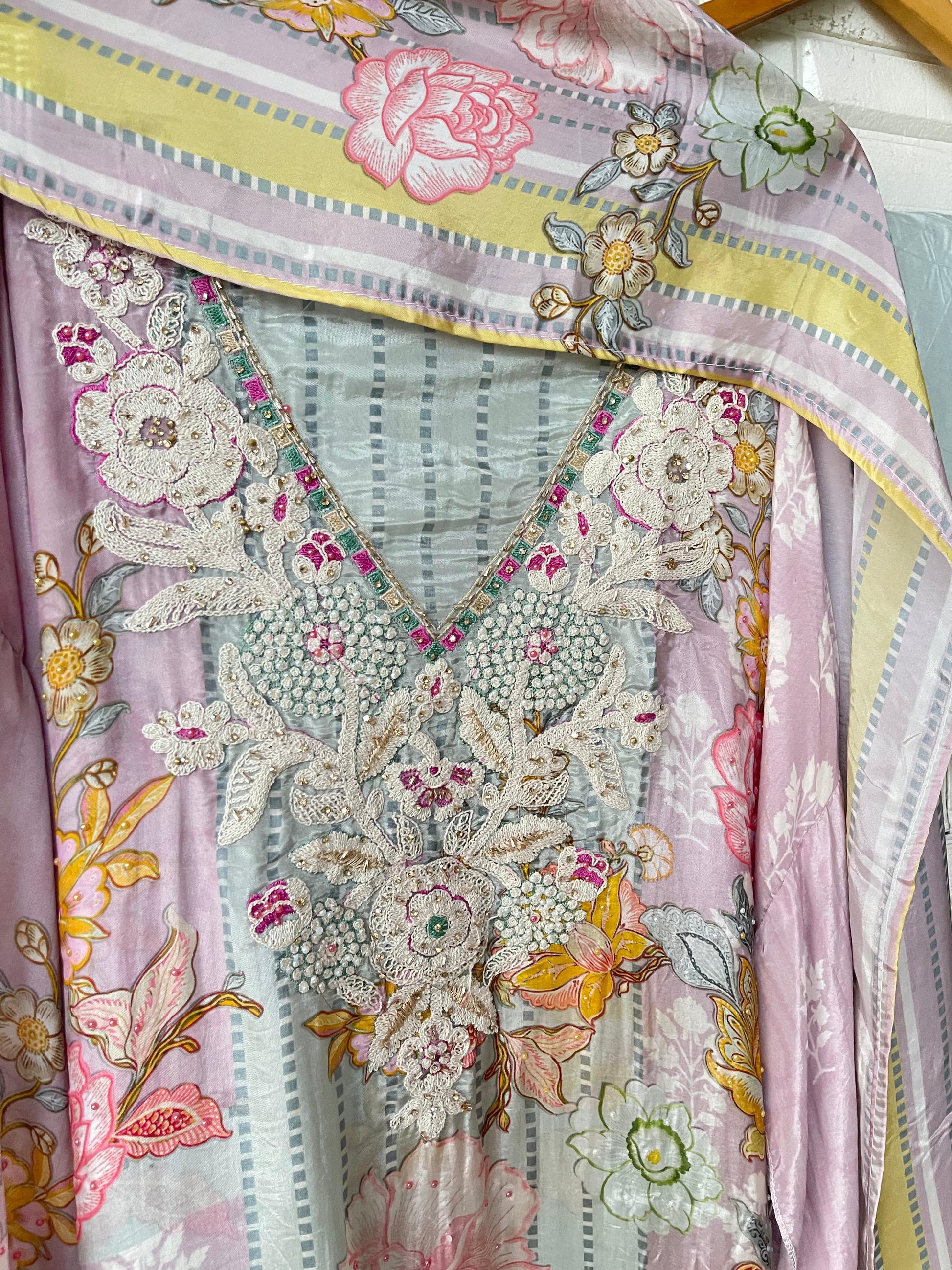 π crape satan printed fabric unstitched shirt with swarowski resham pearl Dabka embroidery