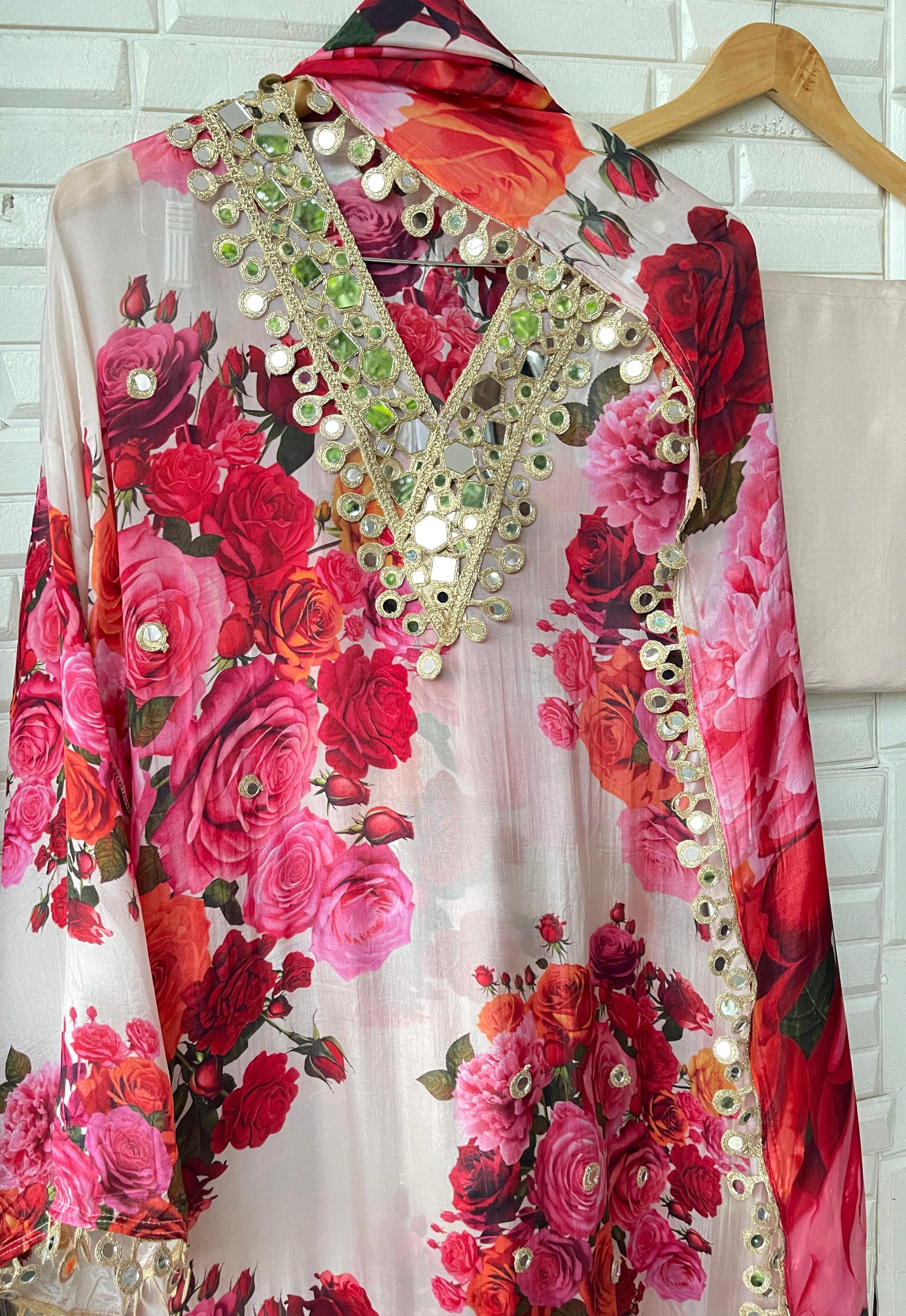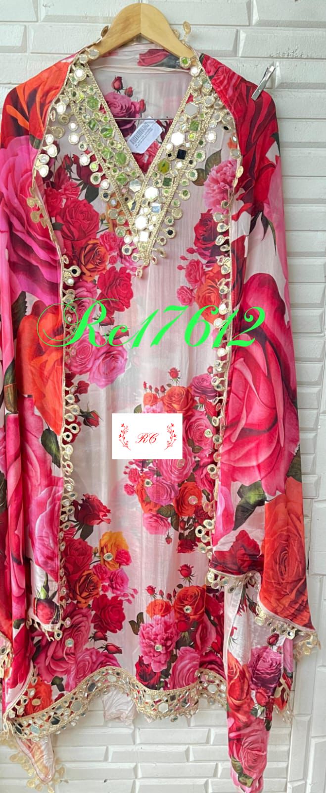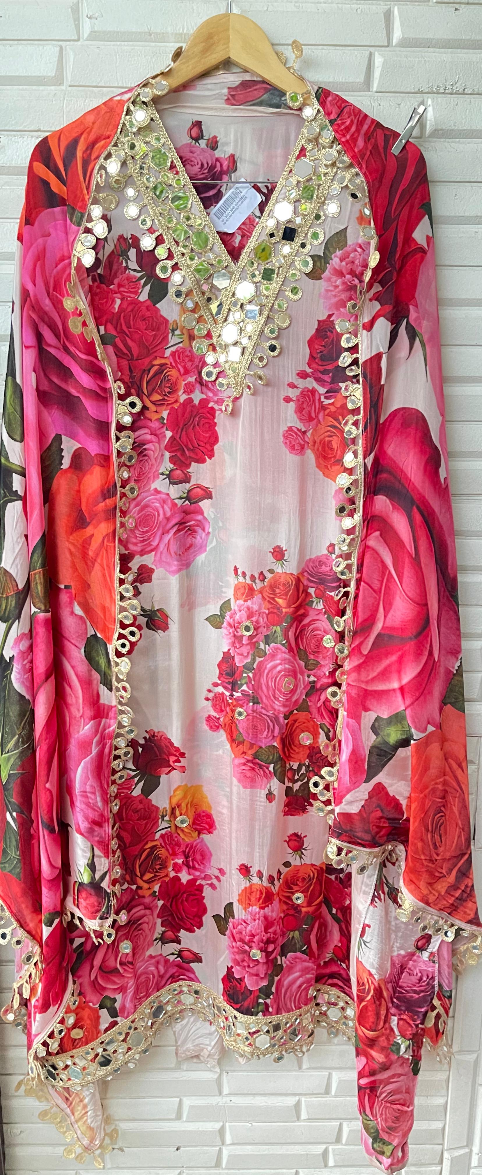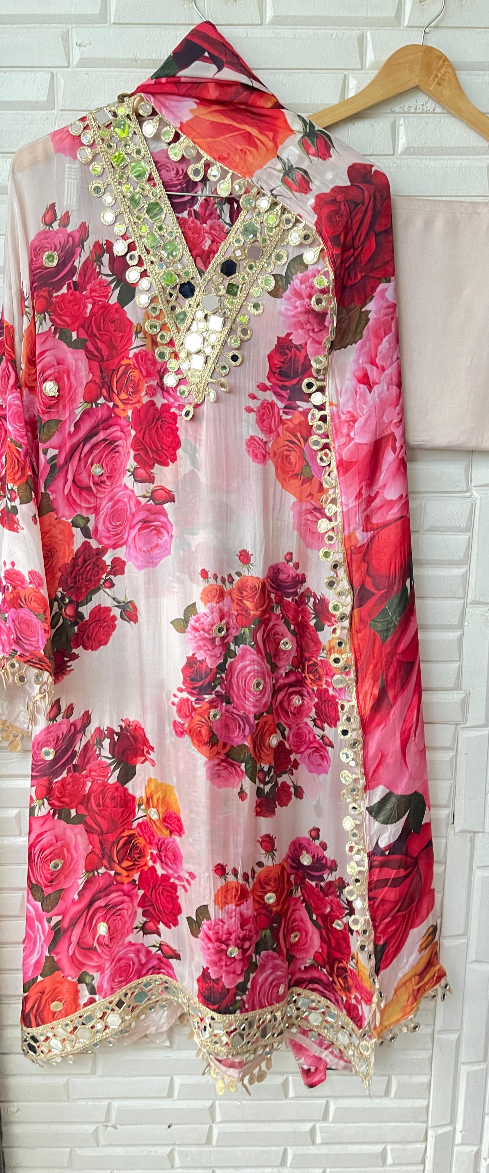 π crape silk printed fabric unstitched shirt with zari real mirror work lace on neck