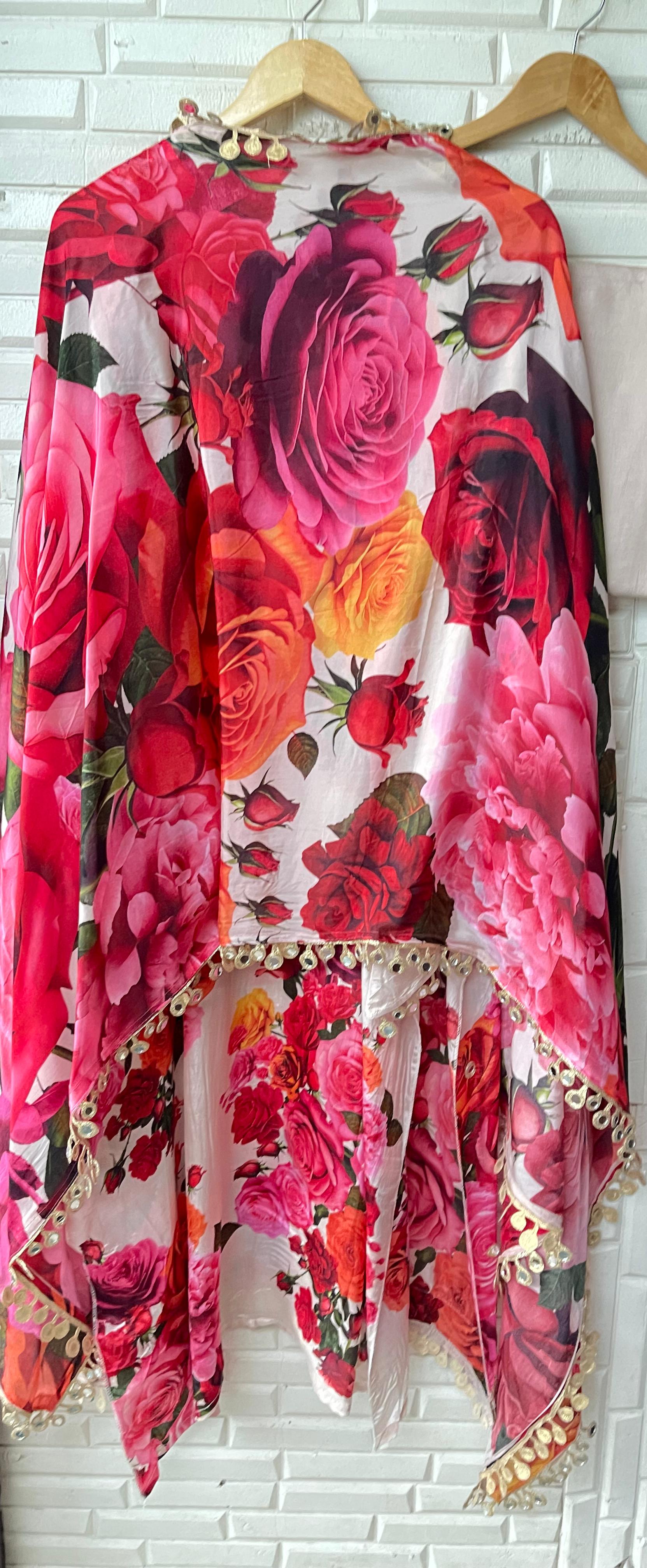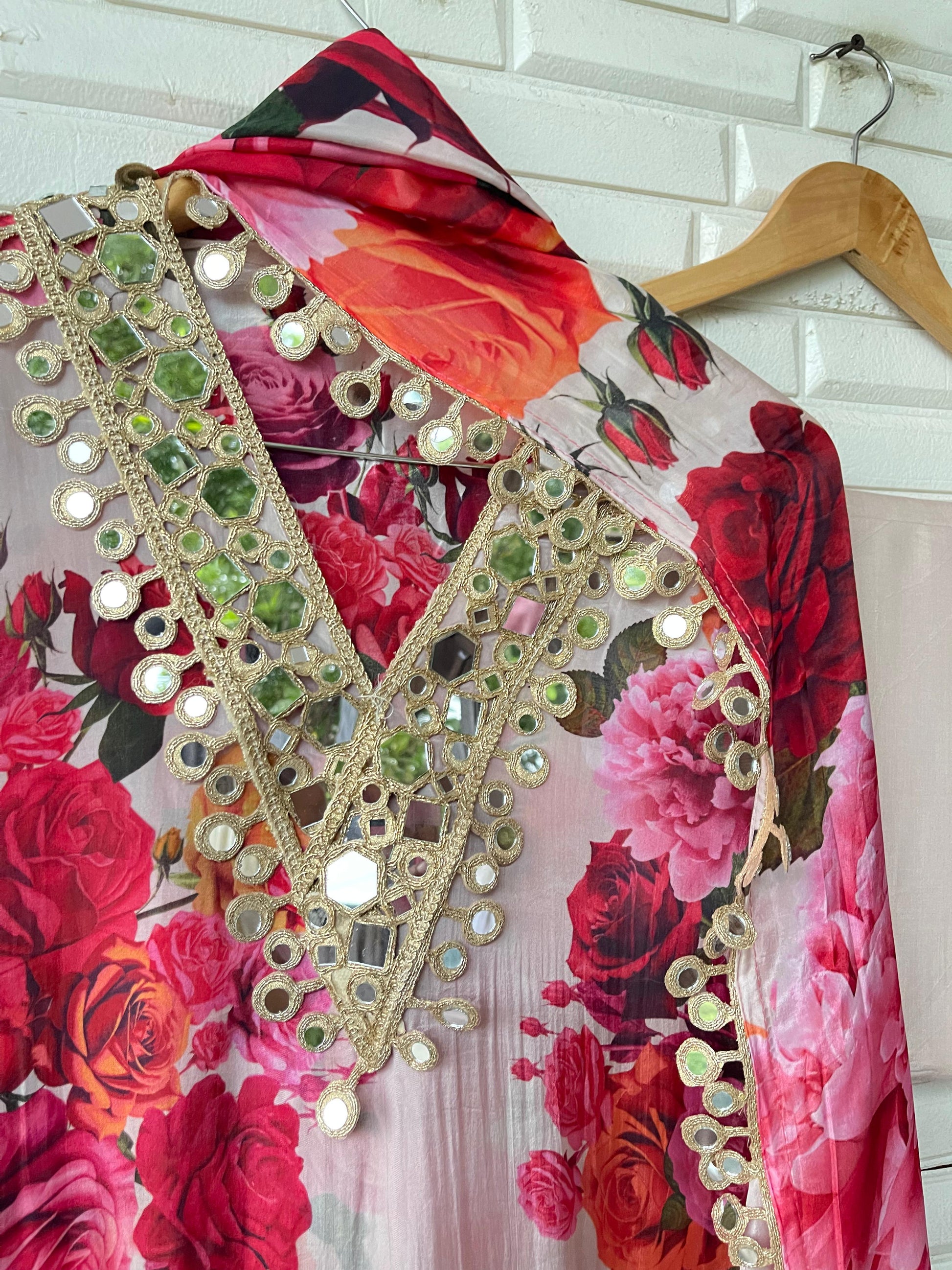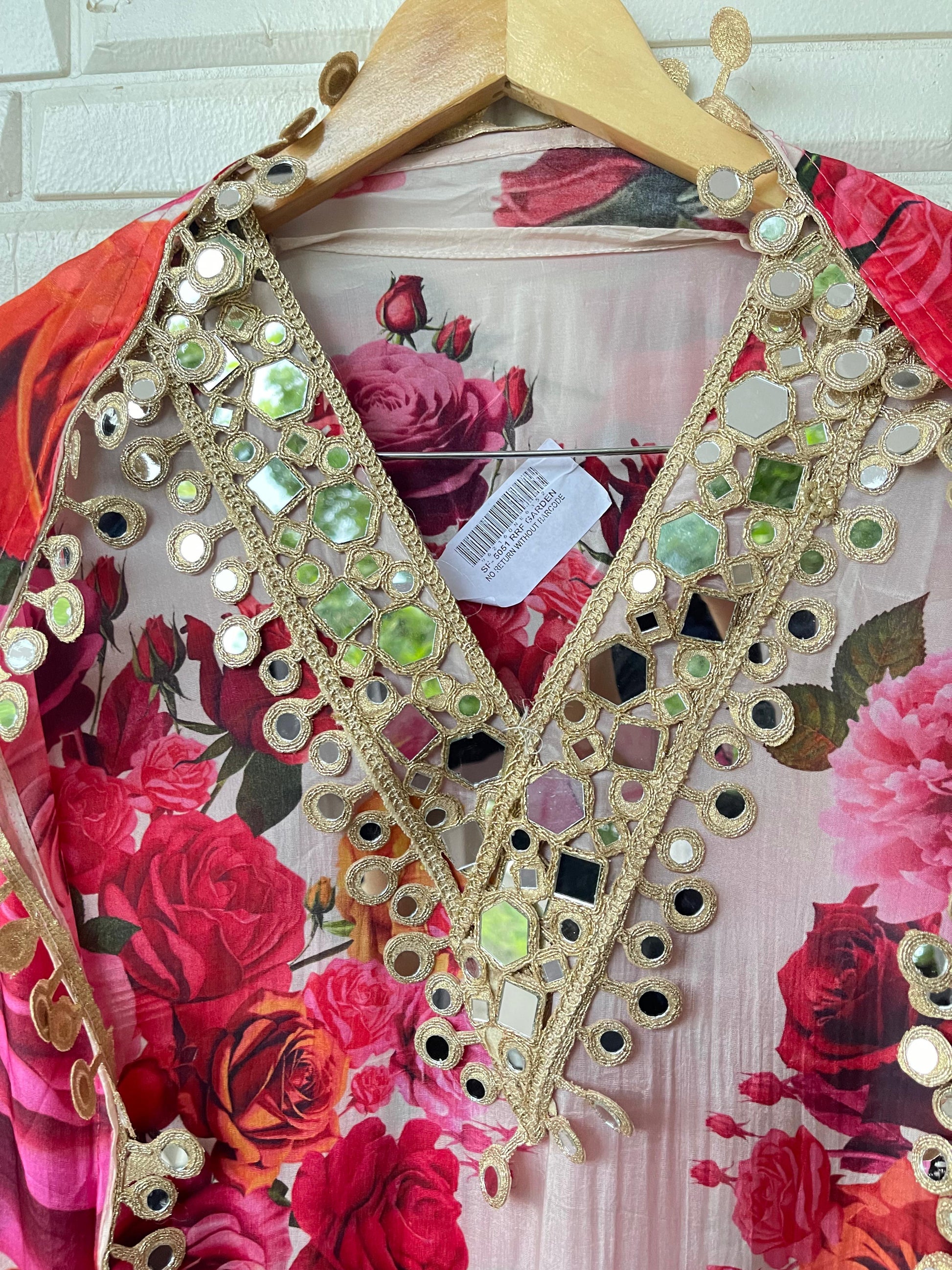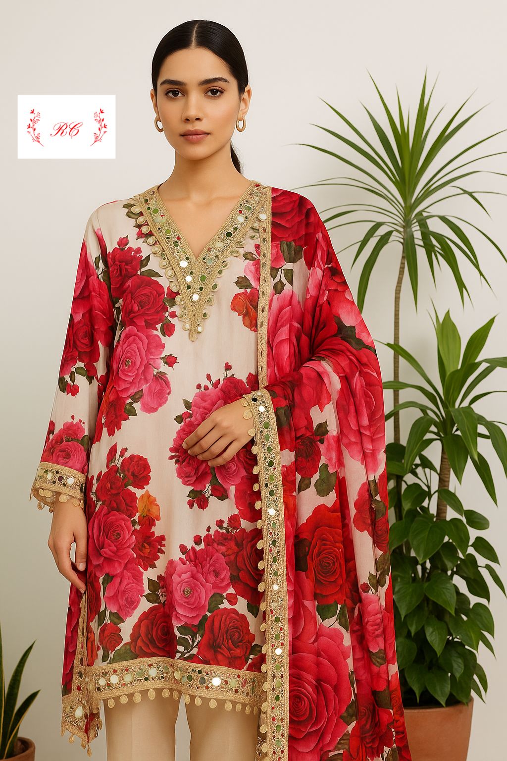π crape silk printed fabric unstitched shirt with zari real mirror work lace on neck