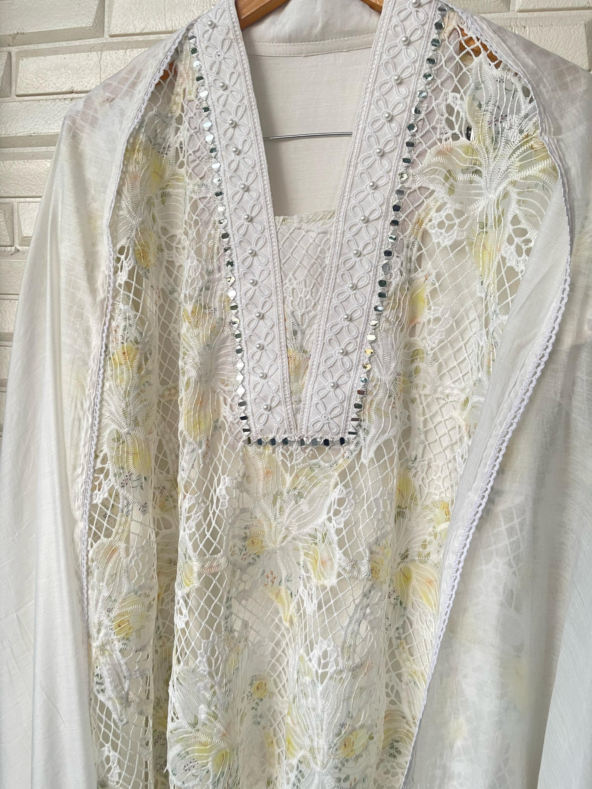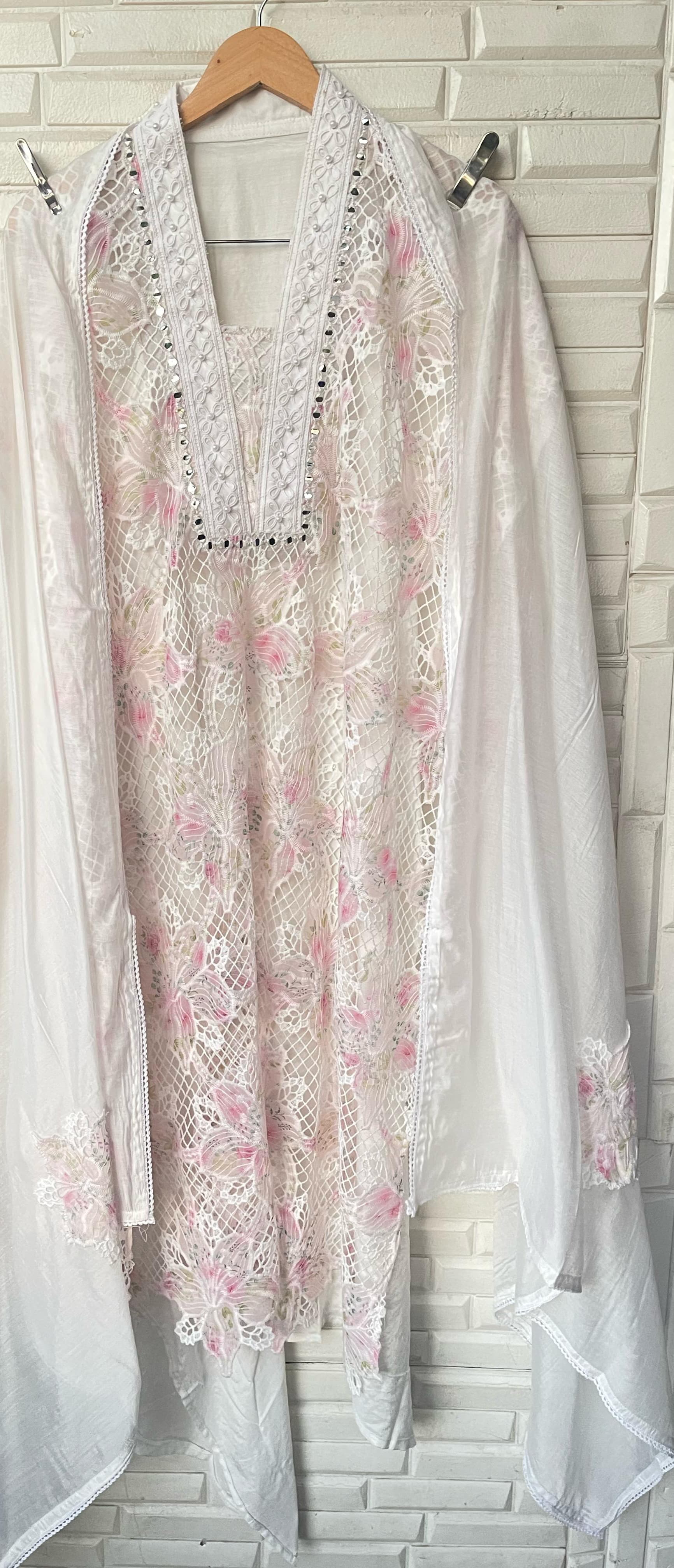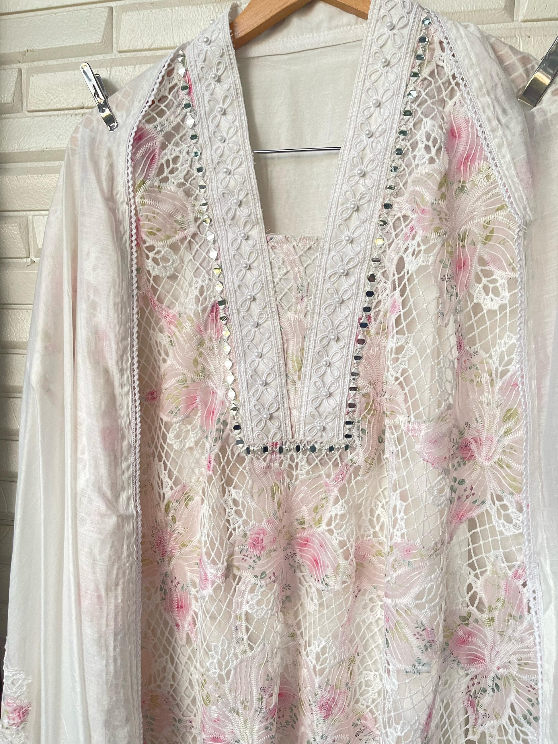 đ Crotia printed fabric unstitched shirt with muslin back plus mirror work pearl  resham embroidery