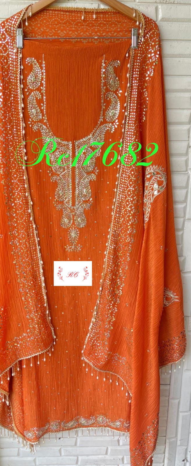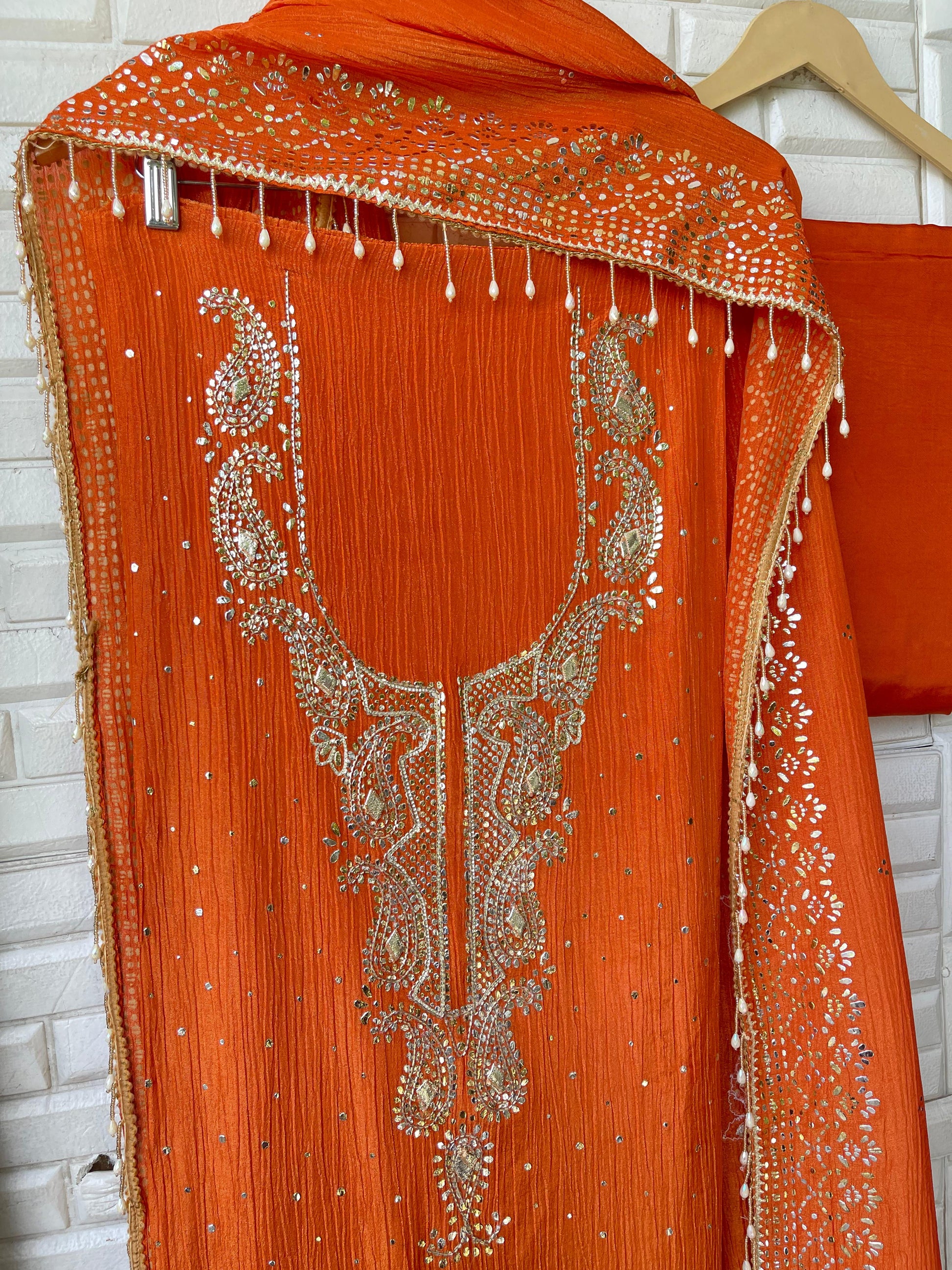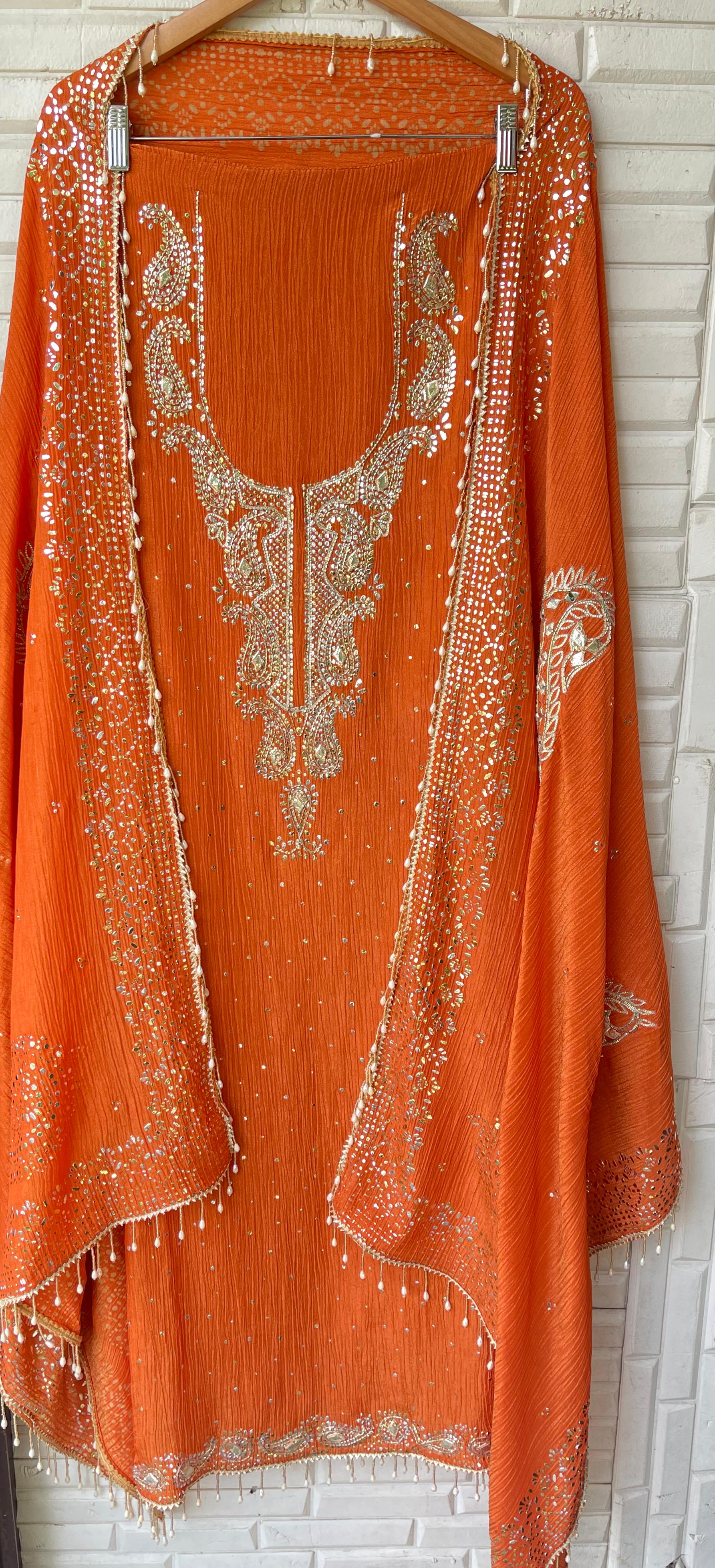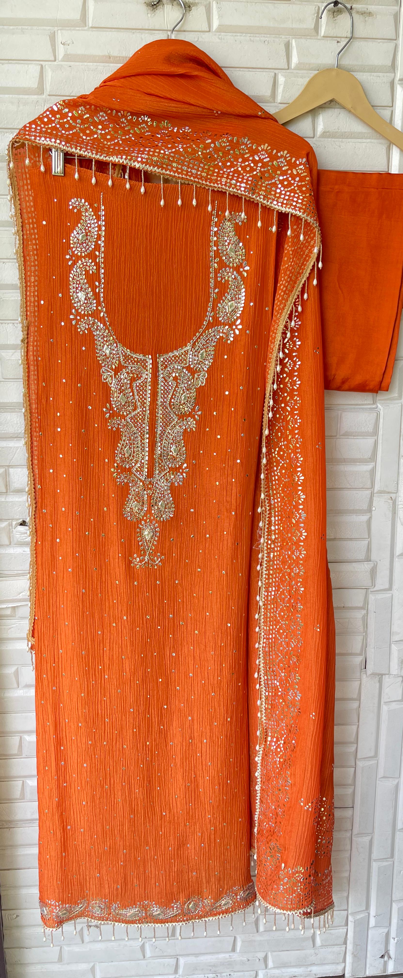 π pure crushed shimmer tissue fabric unstitched shirt with gotta patti work amd mukaish embroidery and pearl hanging lace