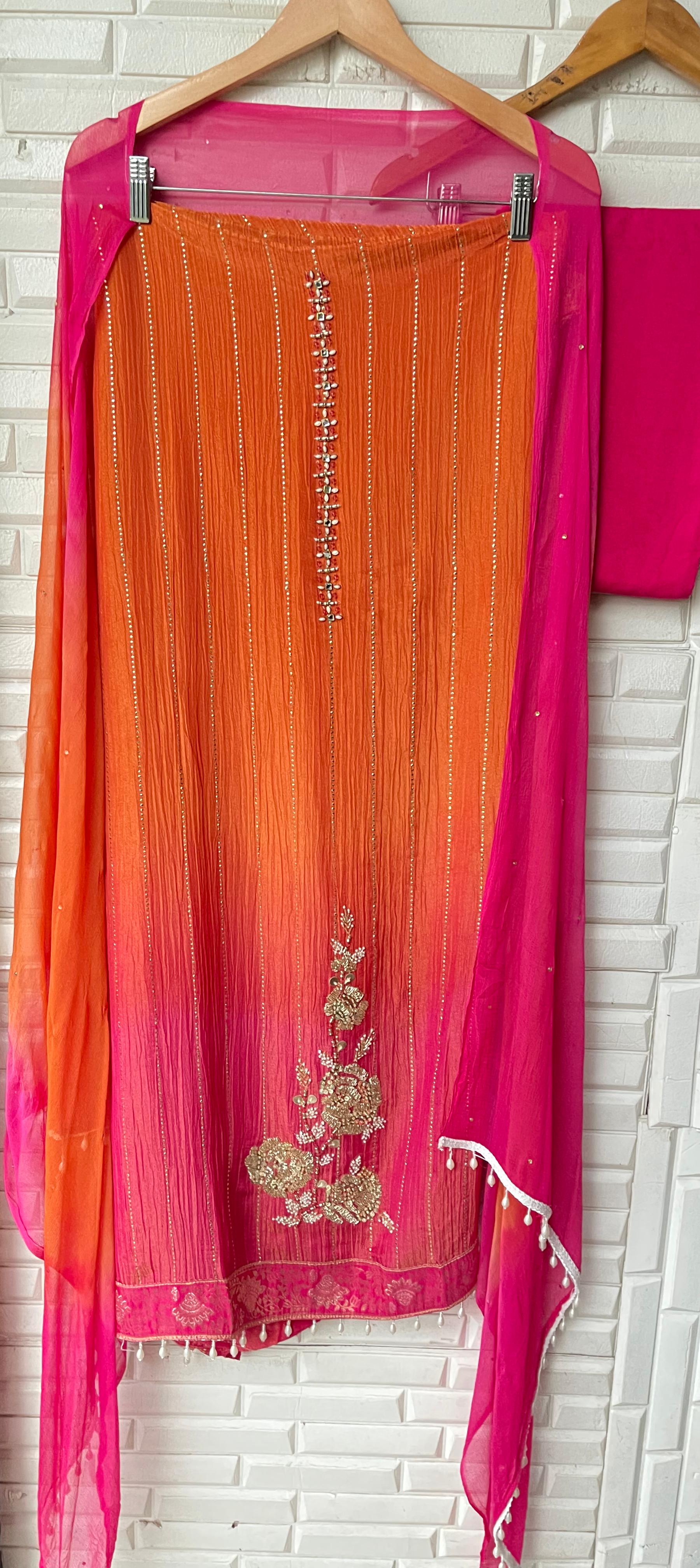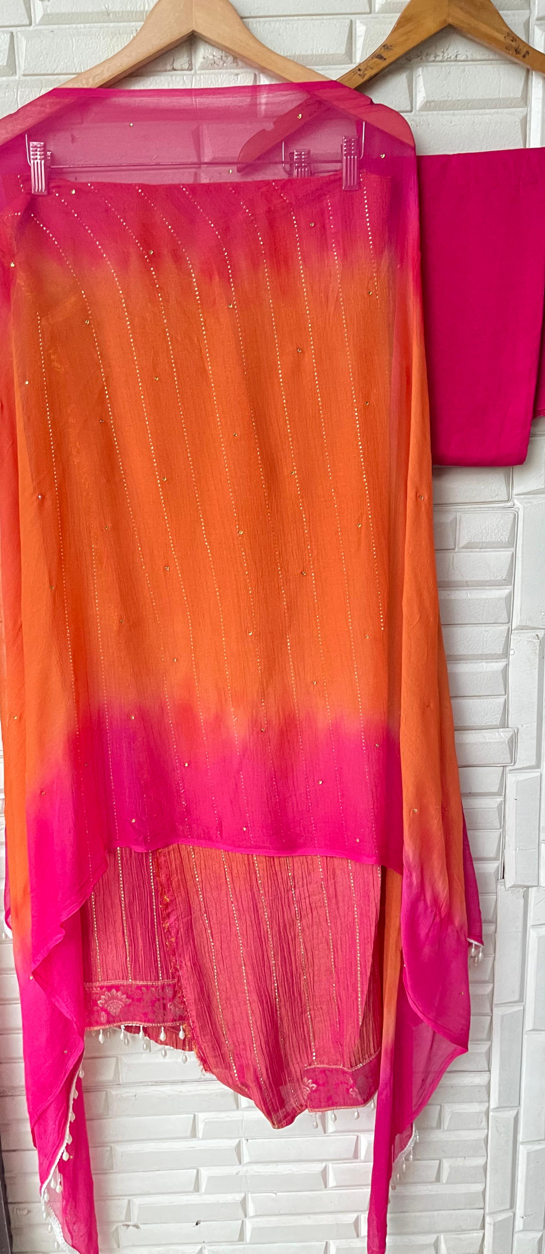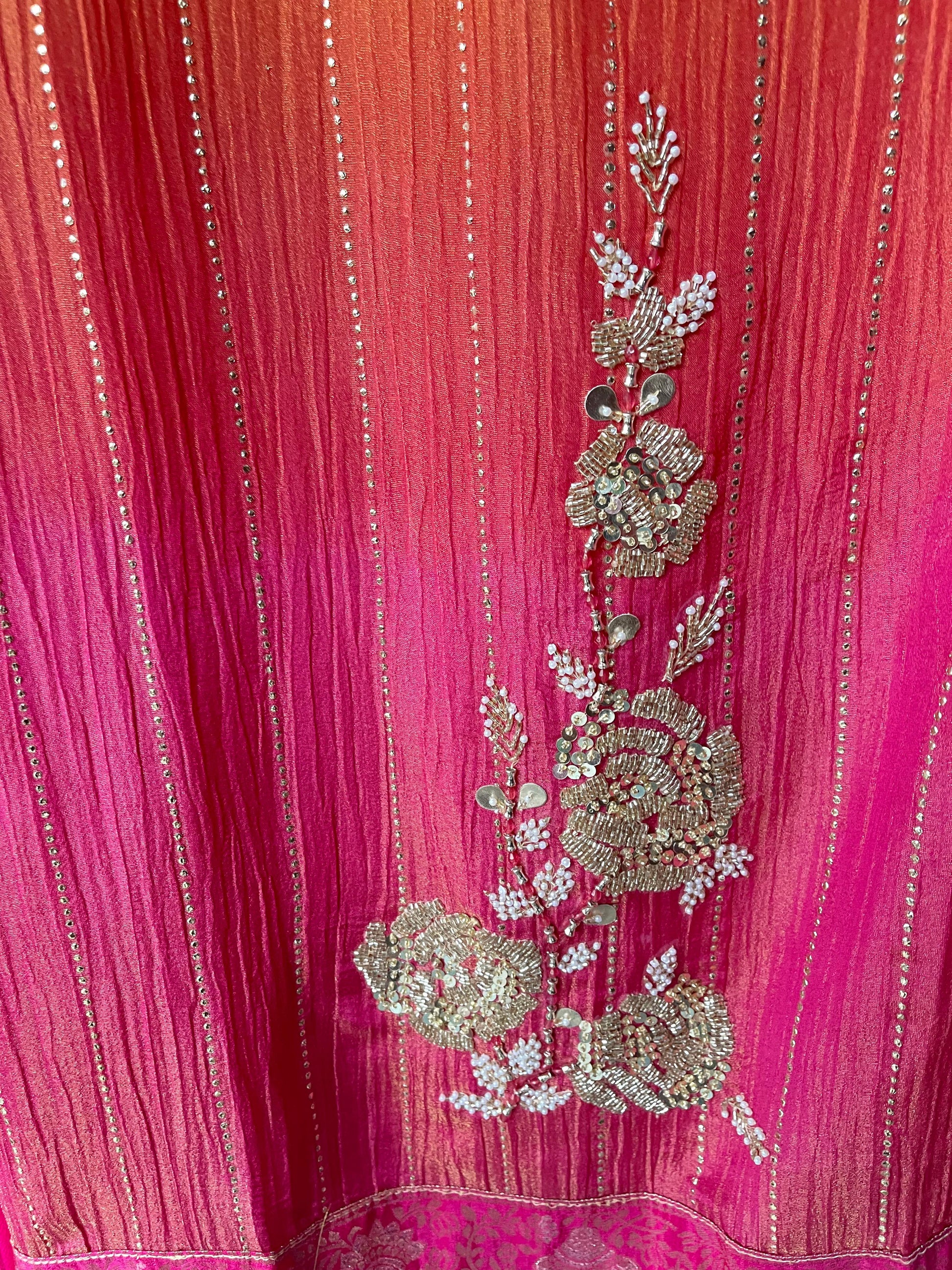 π shimmer crushed tissue fabric shaded unstitched shirt with mukaish work sequence zari kutdanna pearl and kundan embroidery and pearl hanging ghera lace