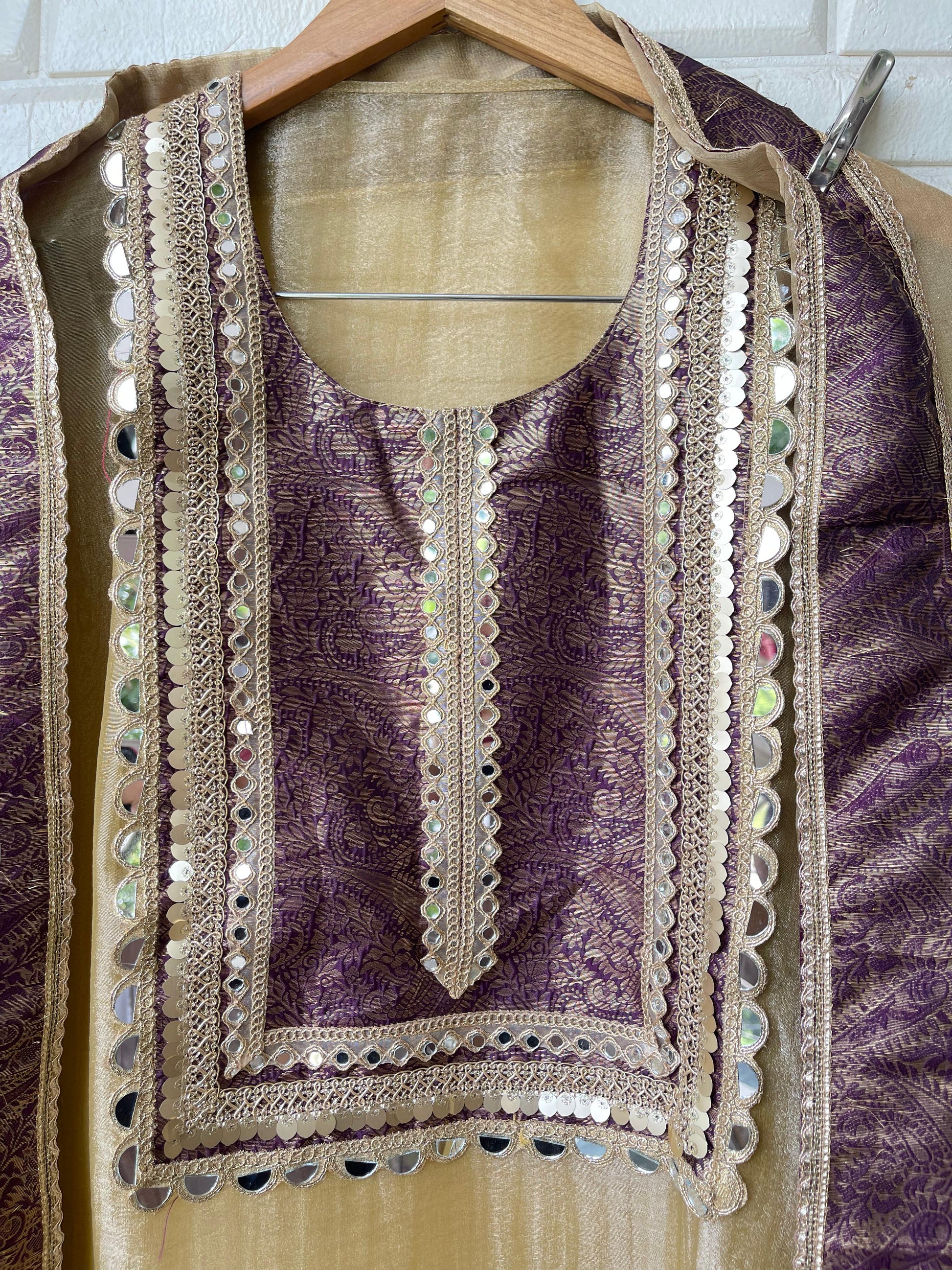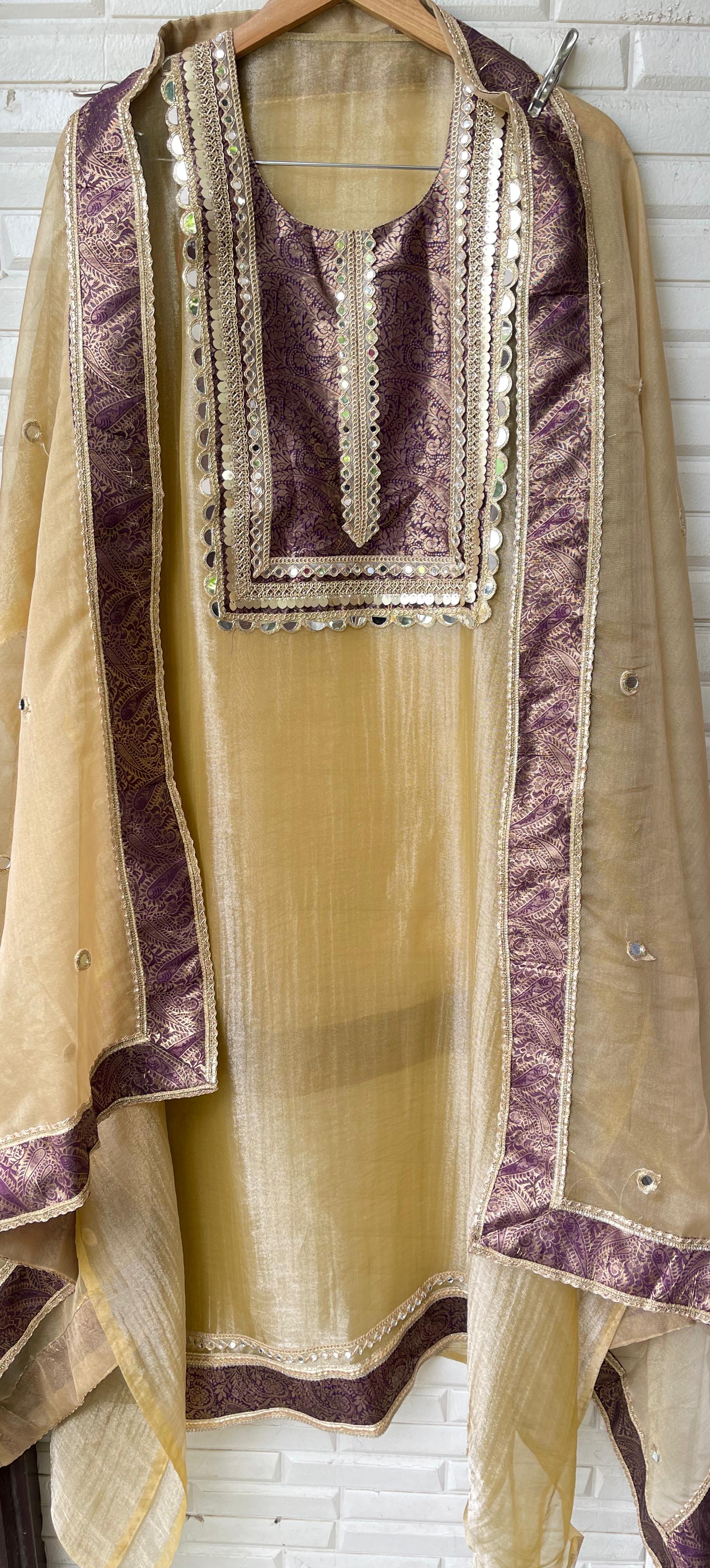 😊 shimmer crushed tissue fabric unstitched shirt with zari lace on neck ghera with mirror work highlighting and brocade borders