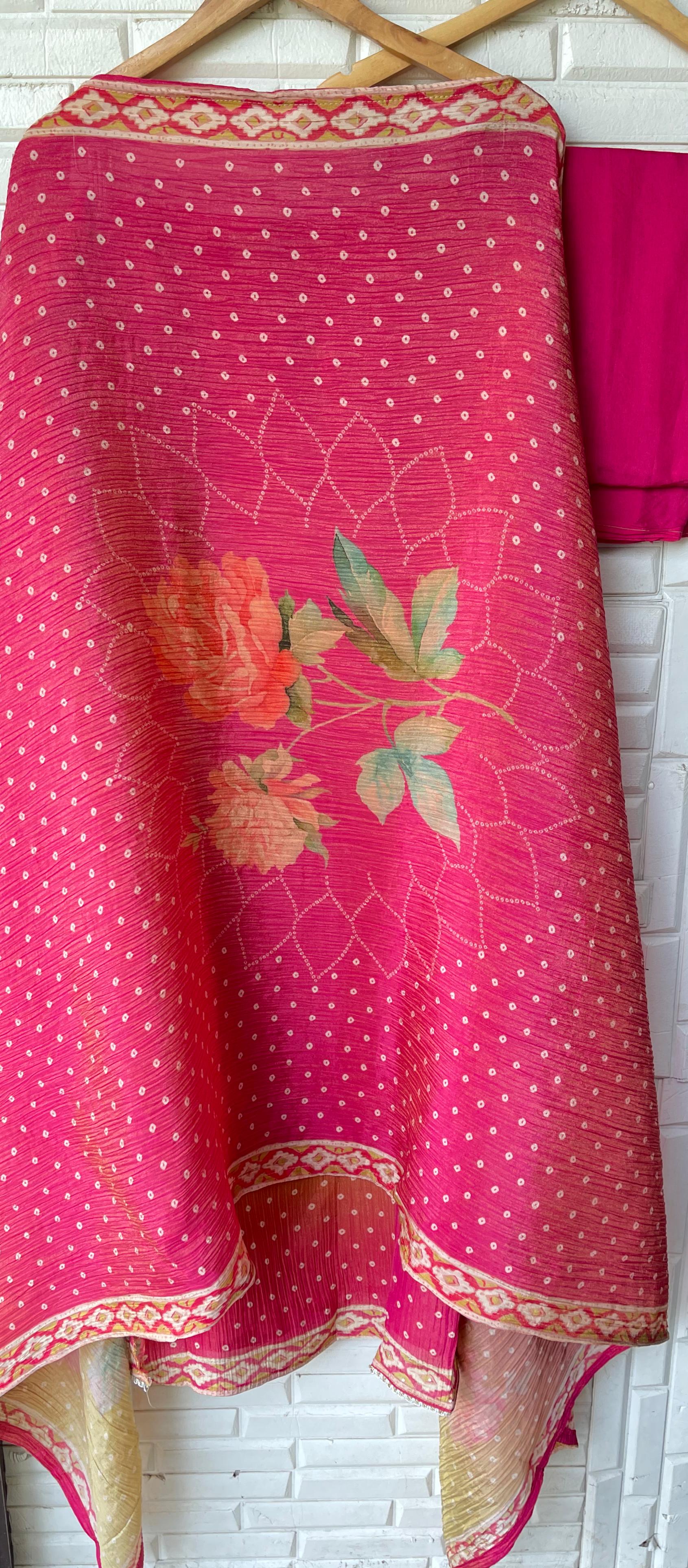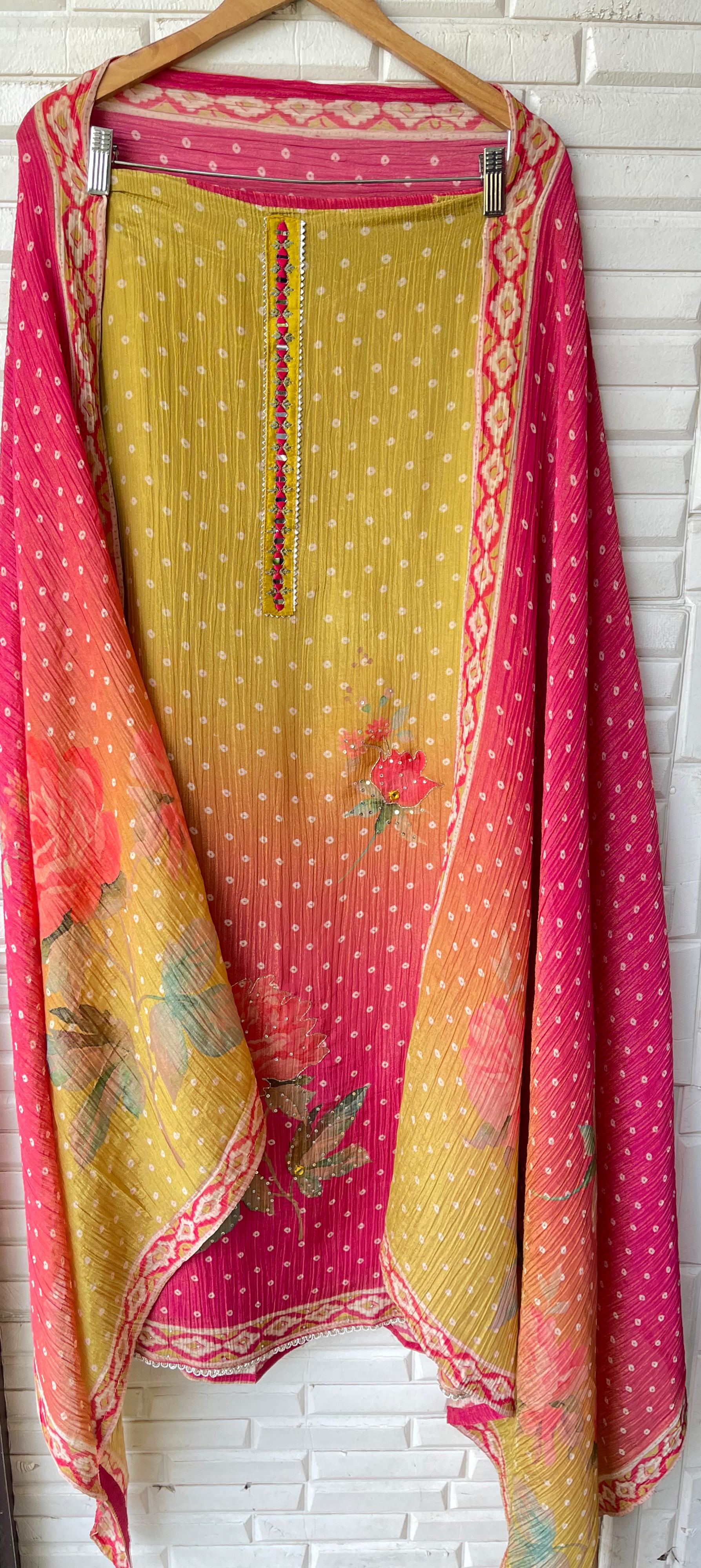 π crushed shimmer tissue shaded bhandni printed fabric unstitched shirt with mirror work resham sequence zari embroidery