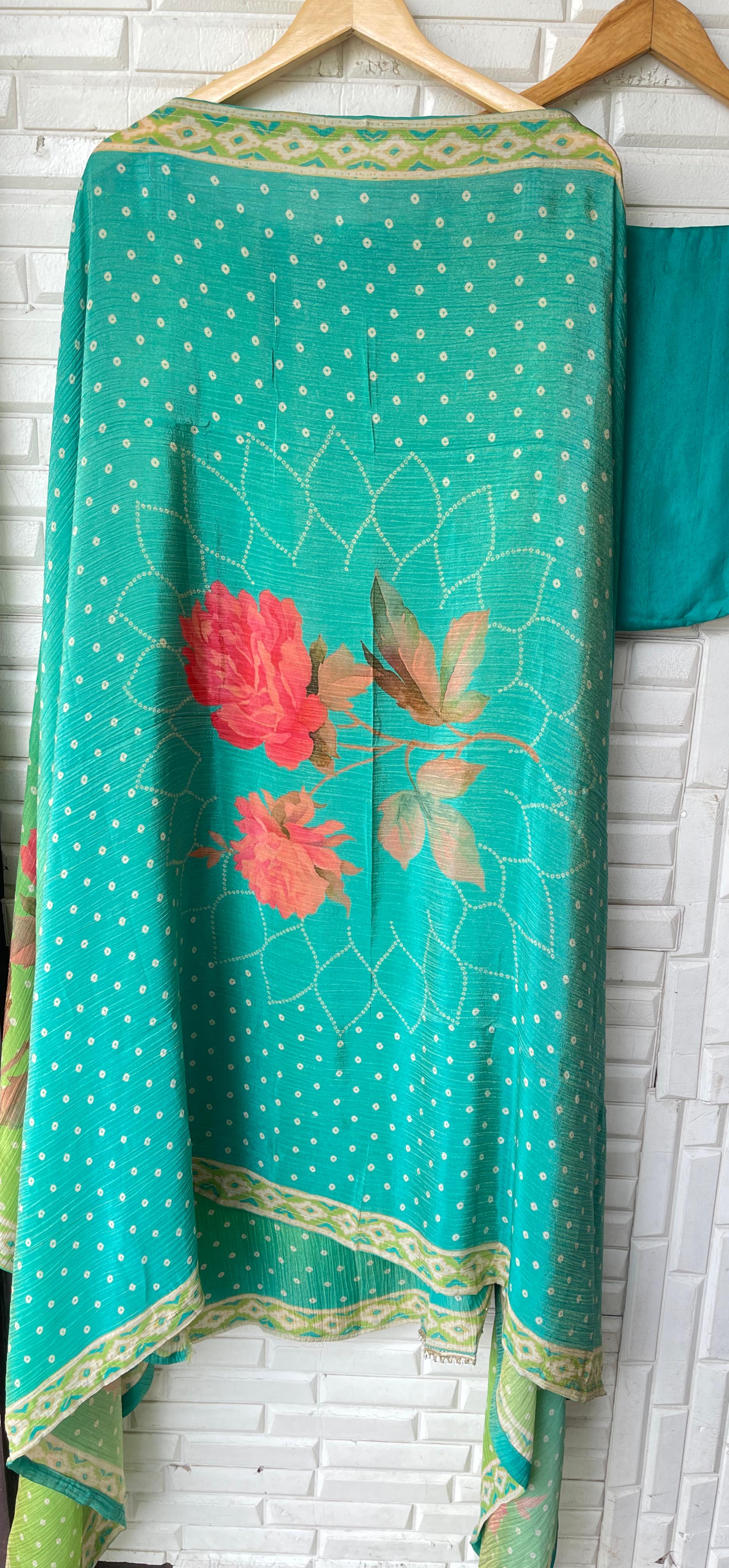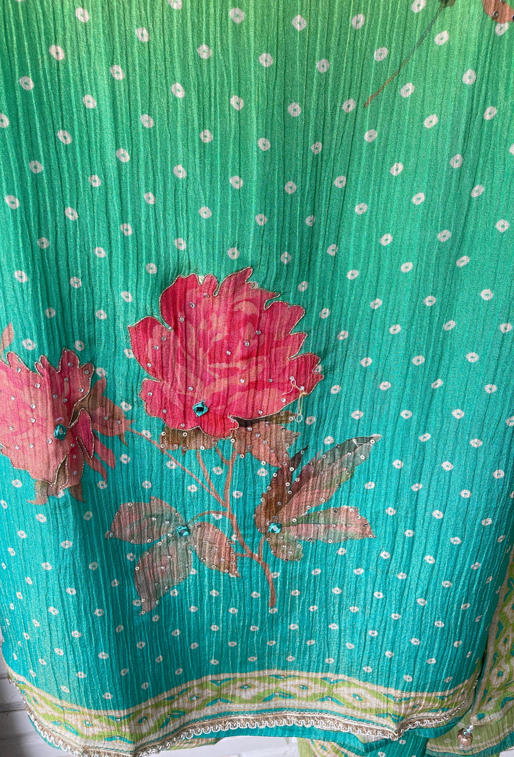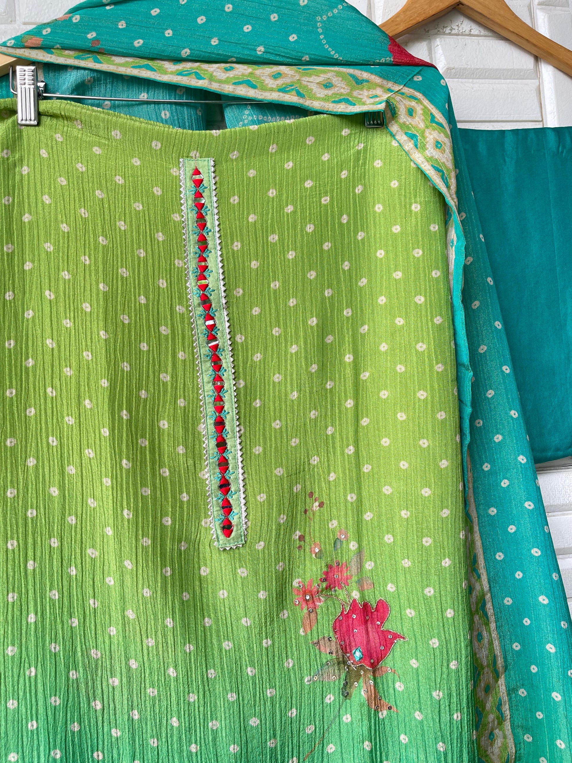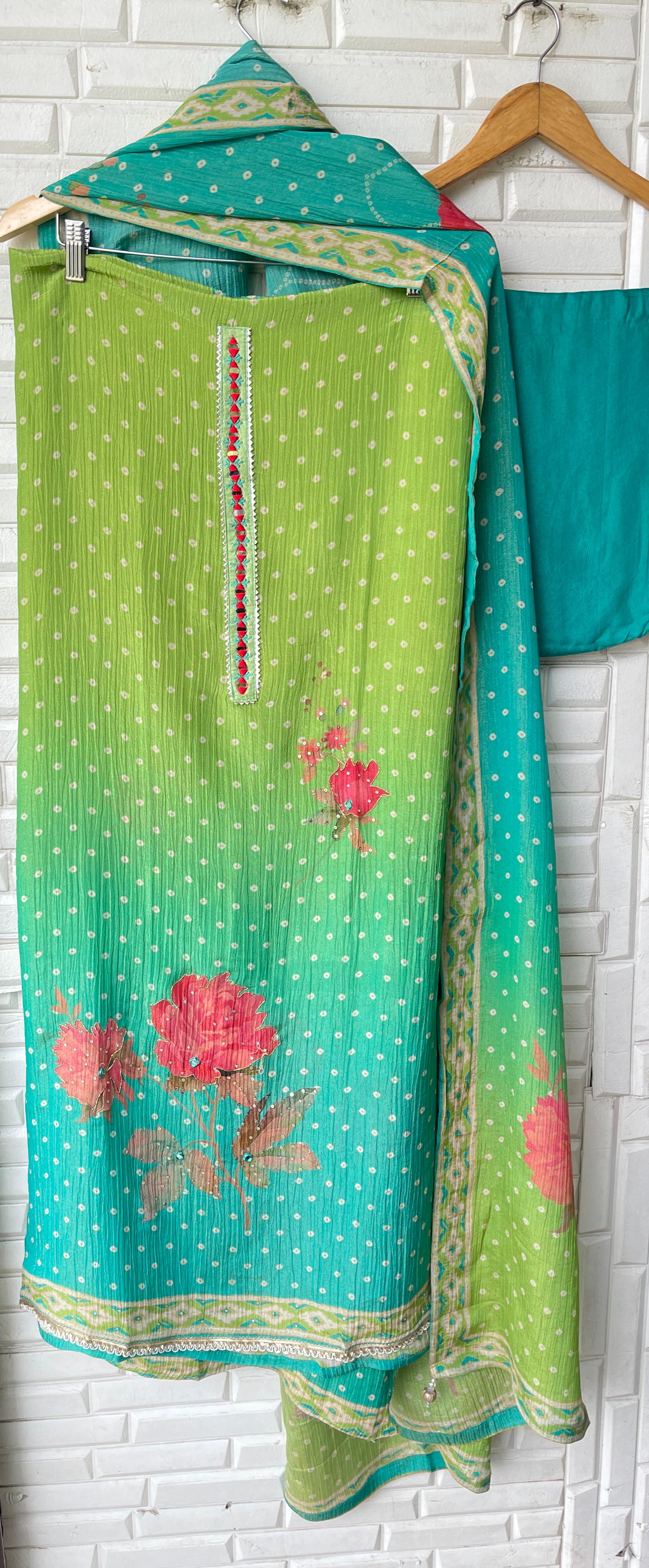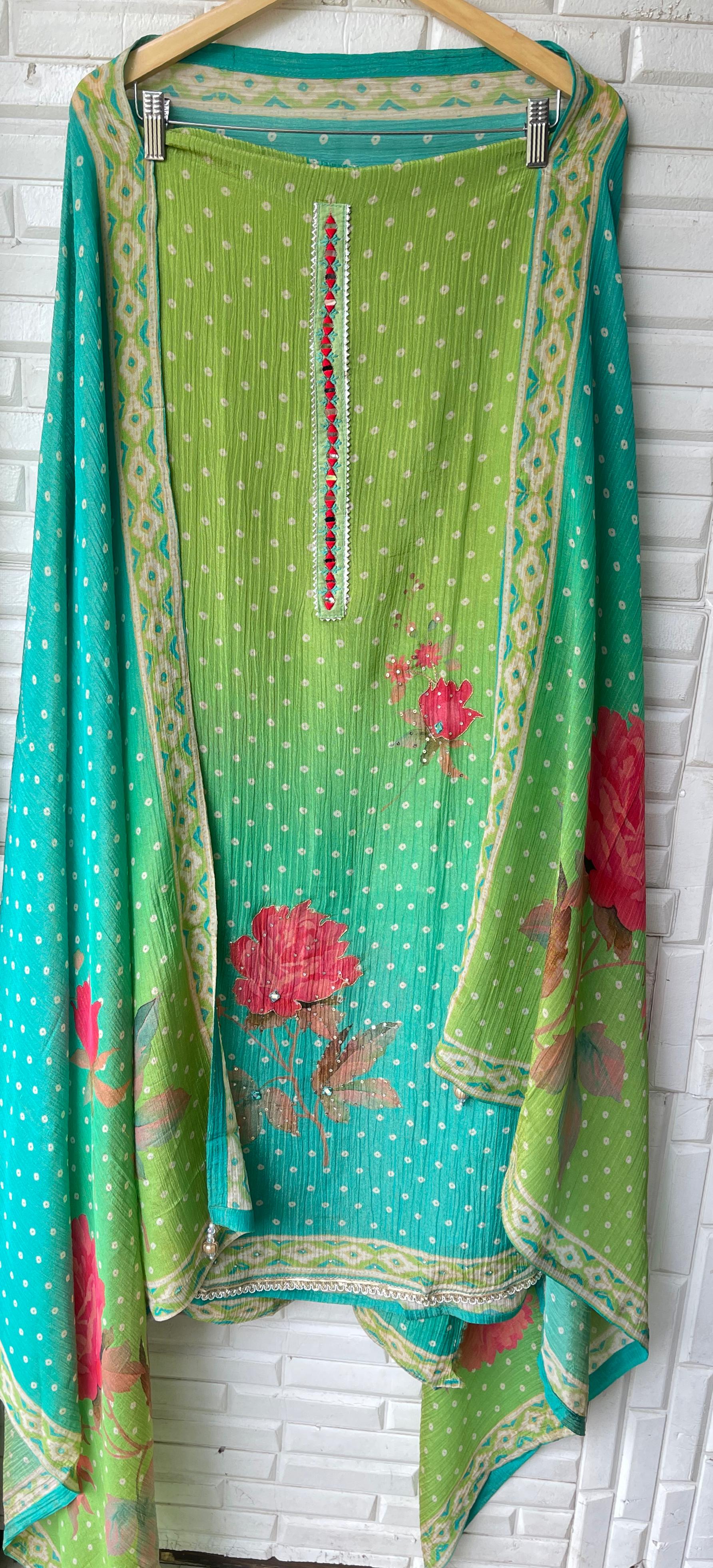 π crushed shimmer tissue shaded bhandni printed fabric unstitched shirt with mirror work resham sequence zari embroidery