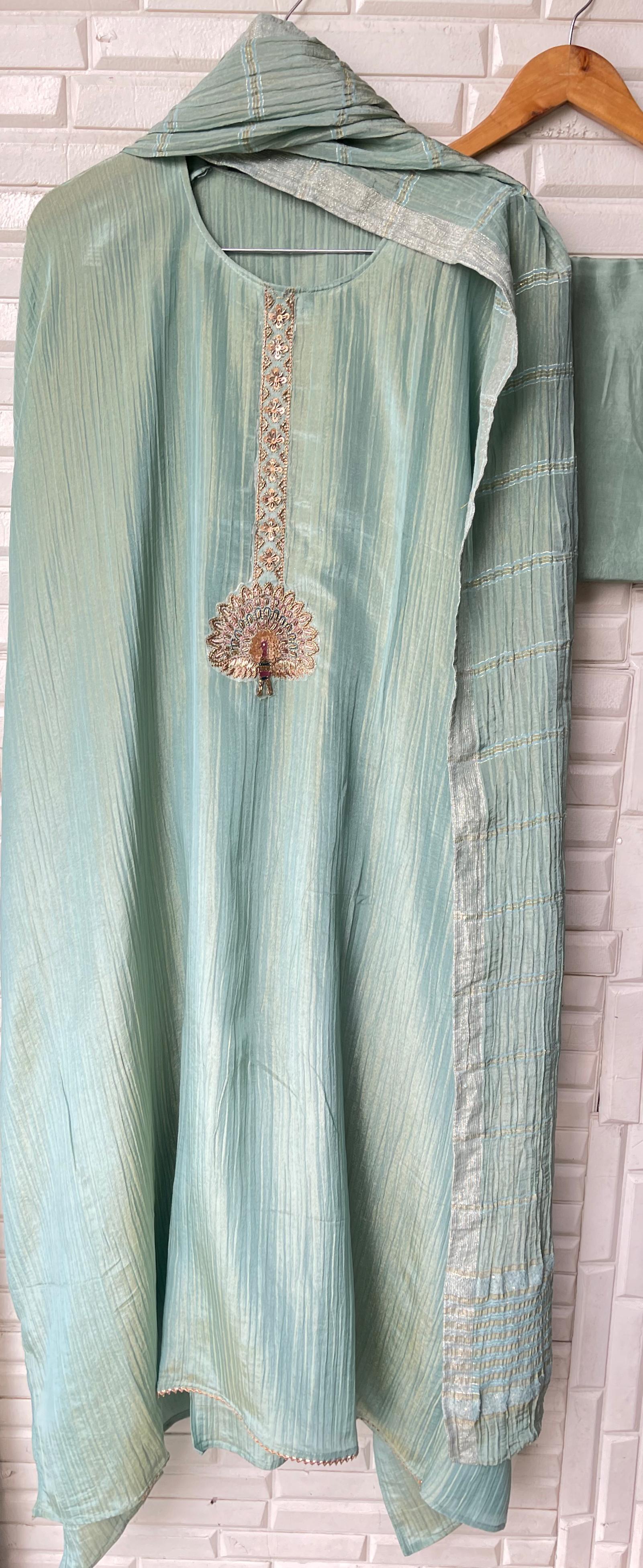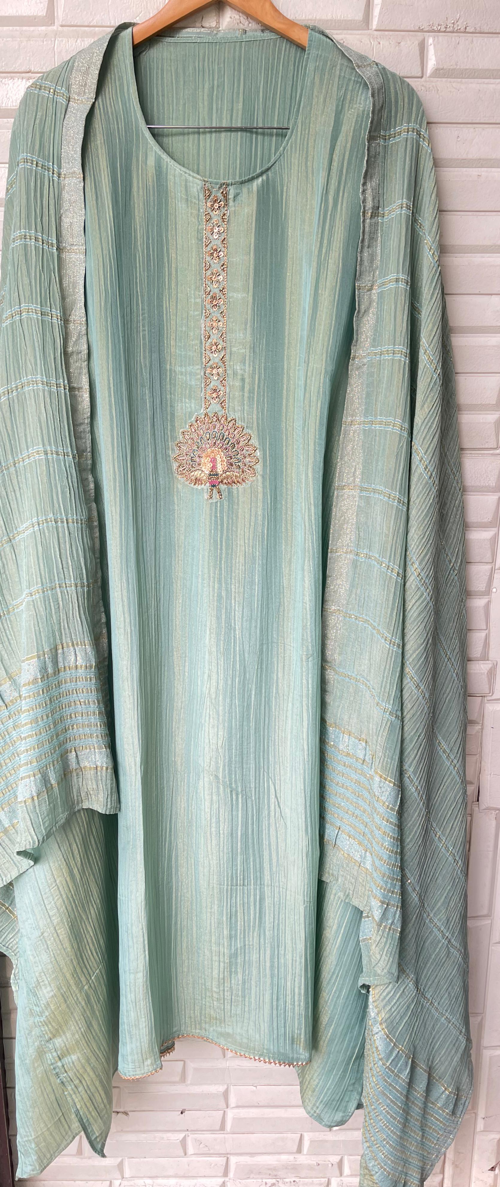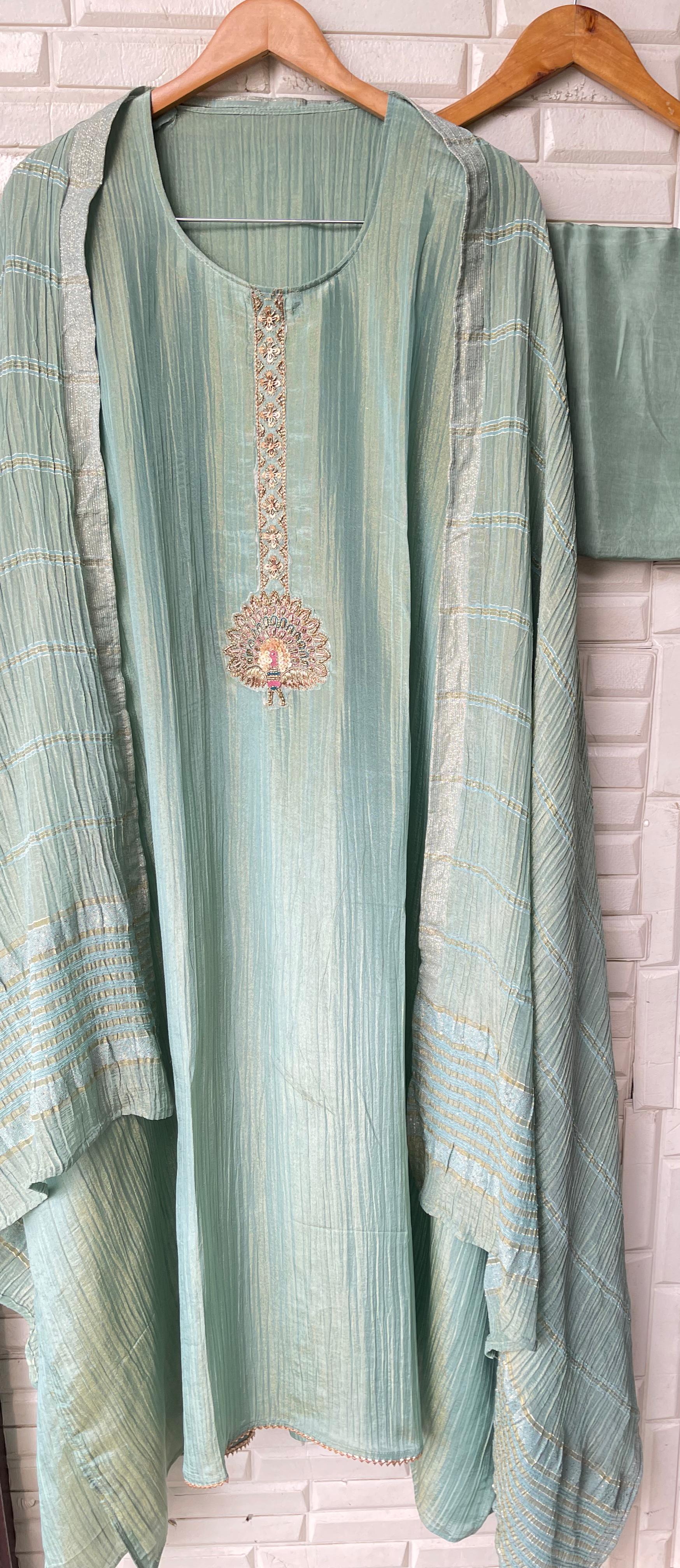 😊 self crushed tissue fabric unstitched shirt with zari pearl kutdanna swarowski dabka neck embroidery