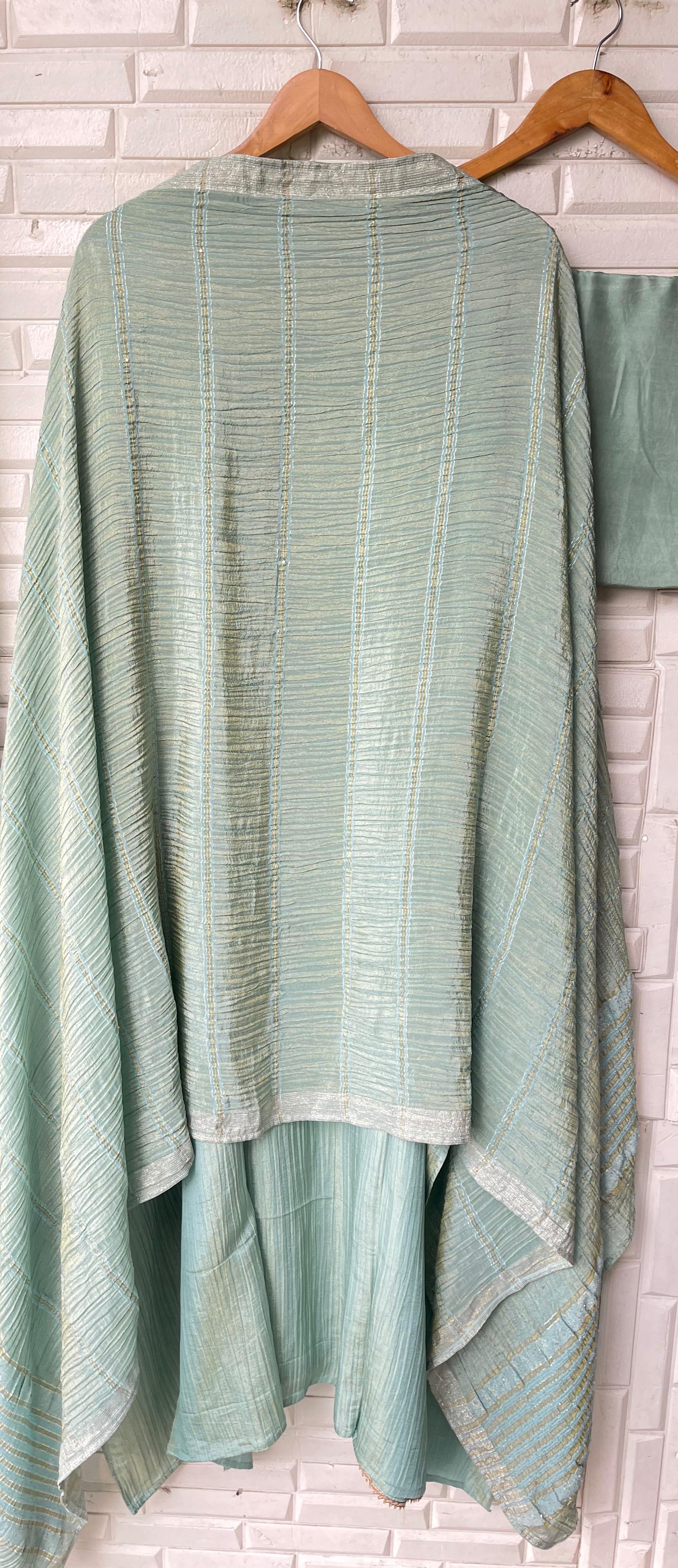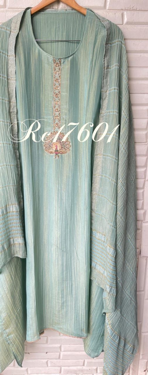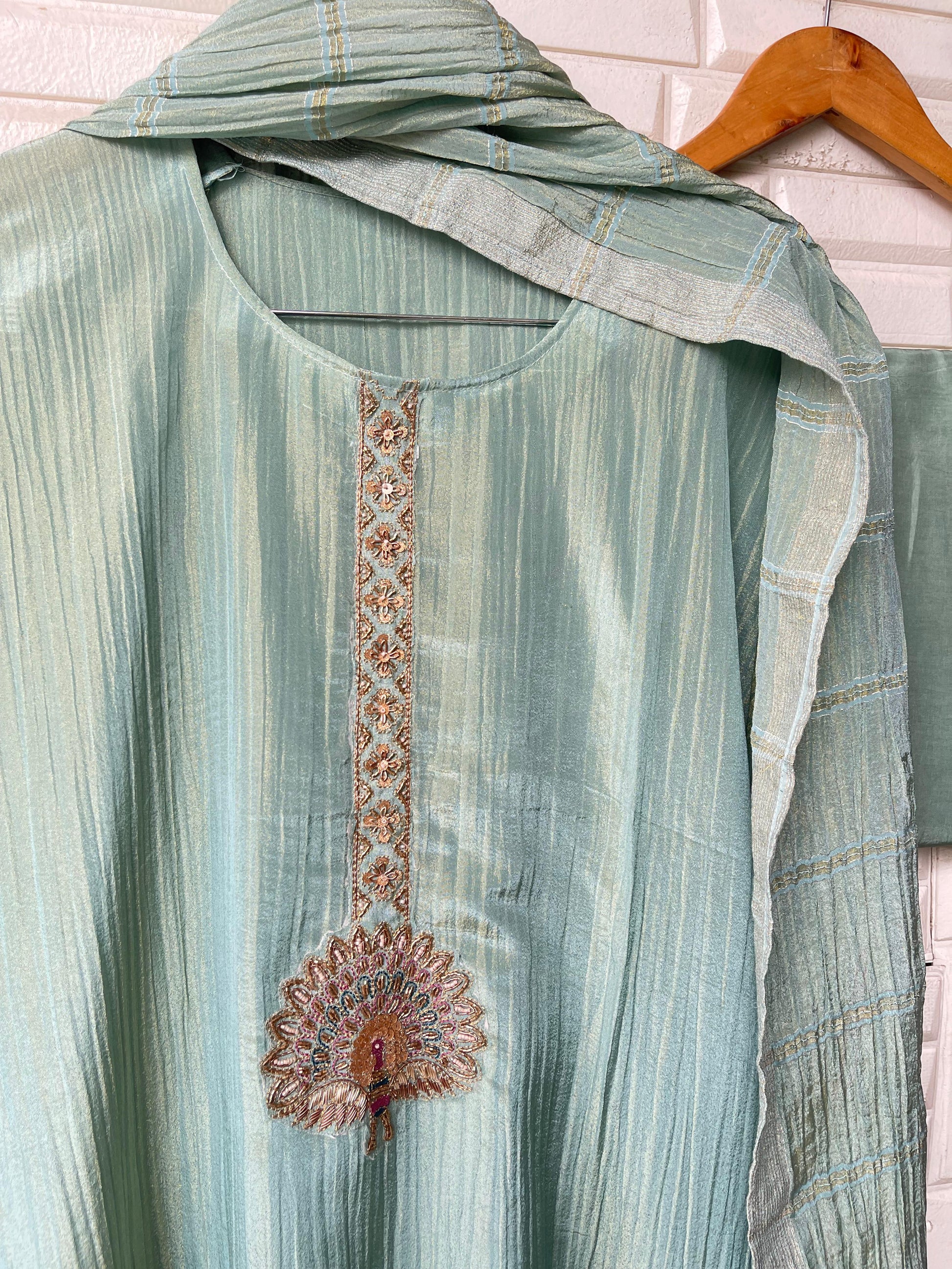 😊 self crushed tissue fabric unstitched shirt with zari pearl kutdanna swarowski dabka neck embroidery