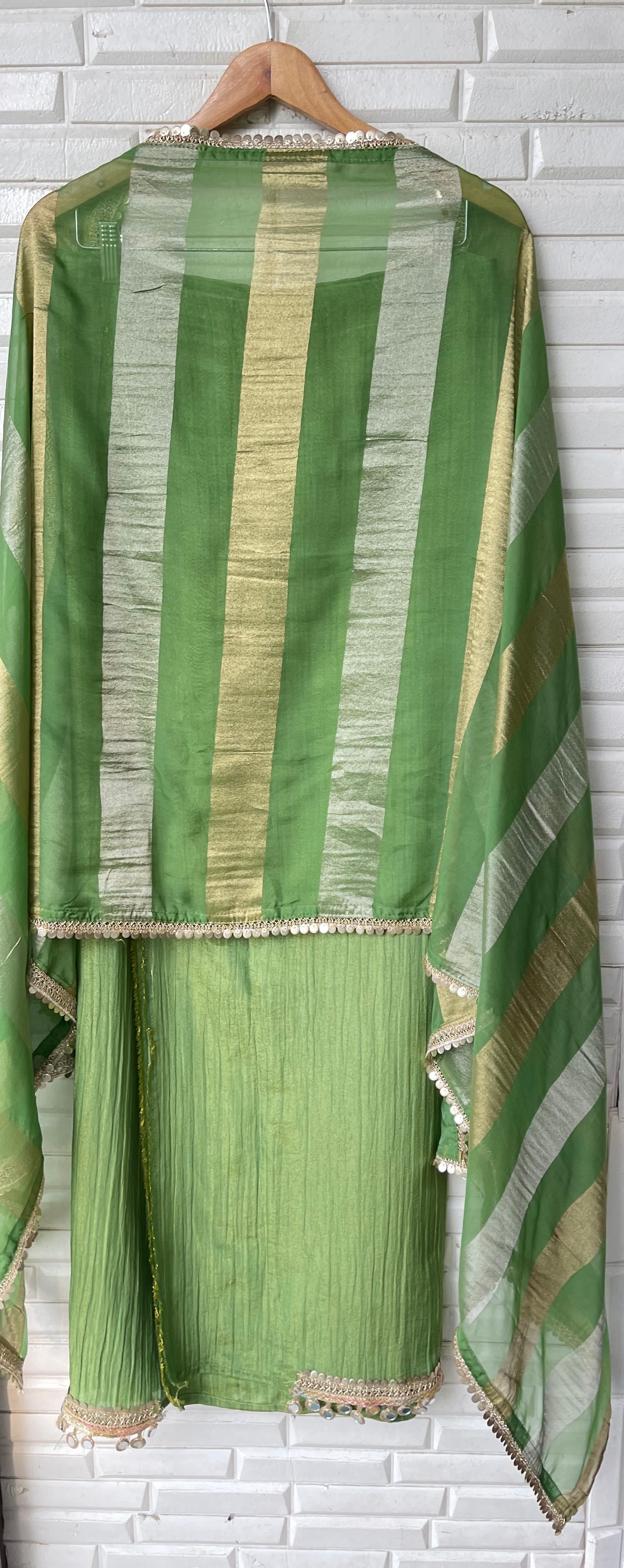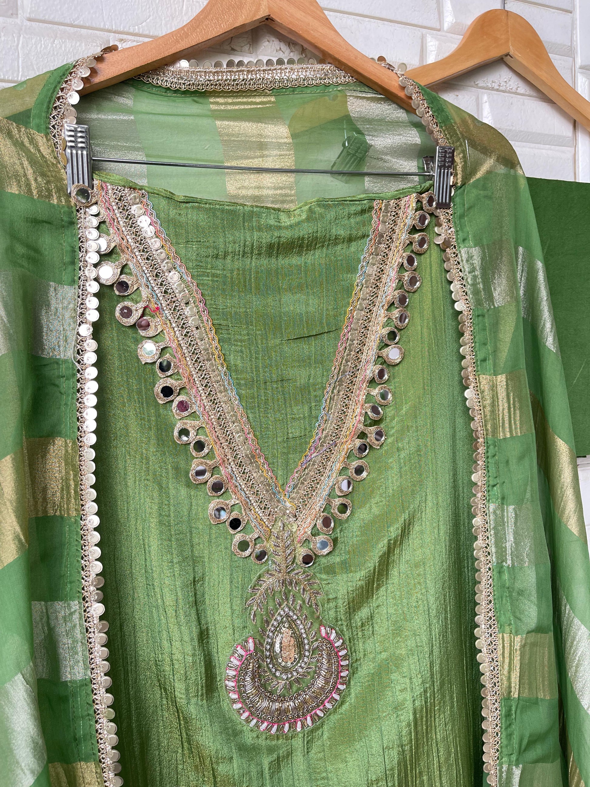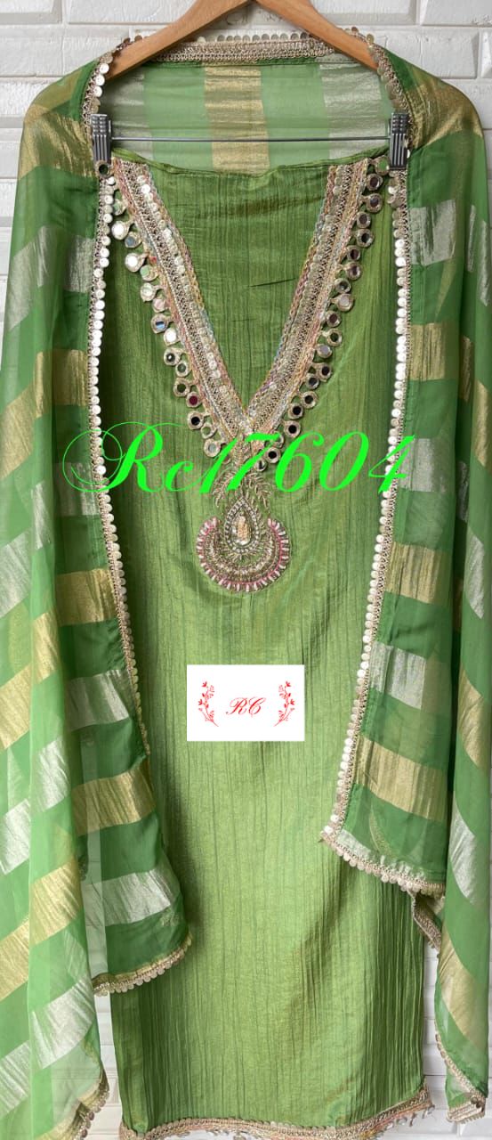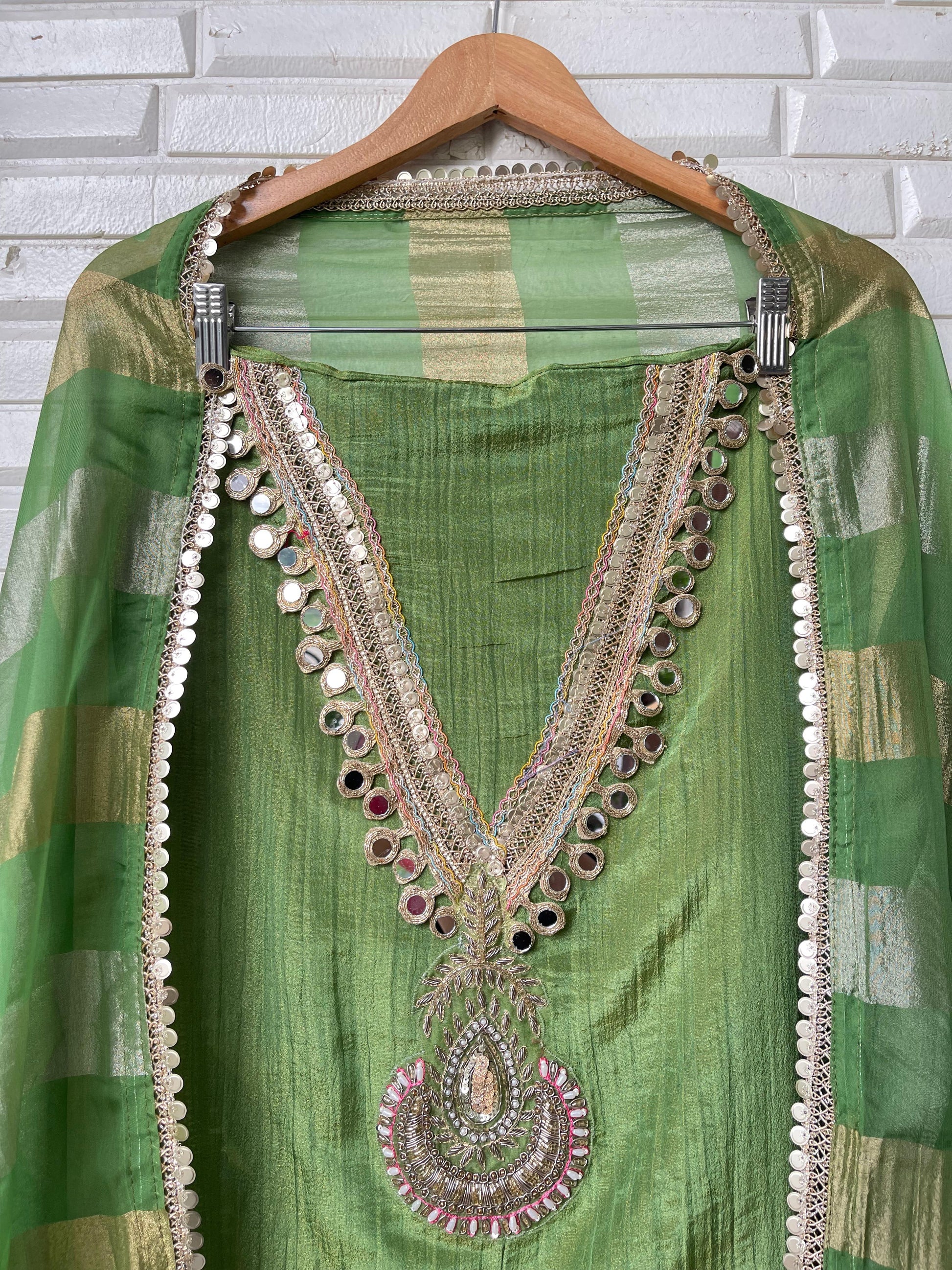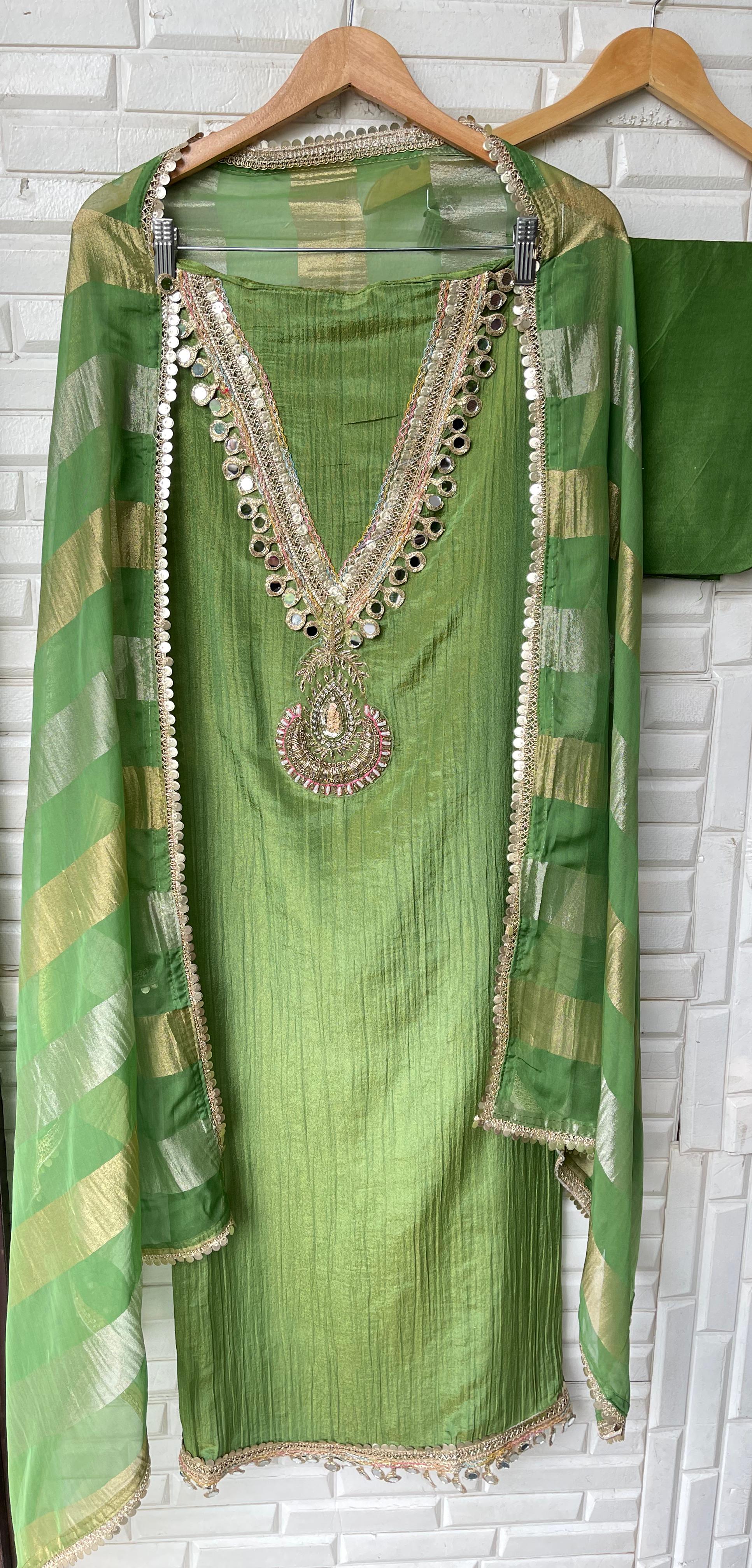 😊crushed tissue unstitched shirt with beautiful mirror zari cutdana Moti Dabka embroidery