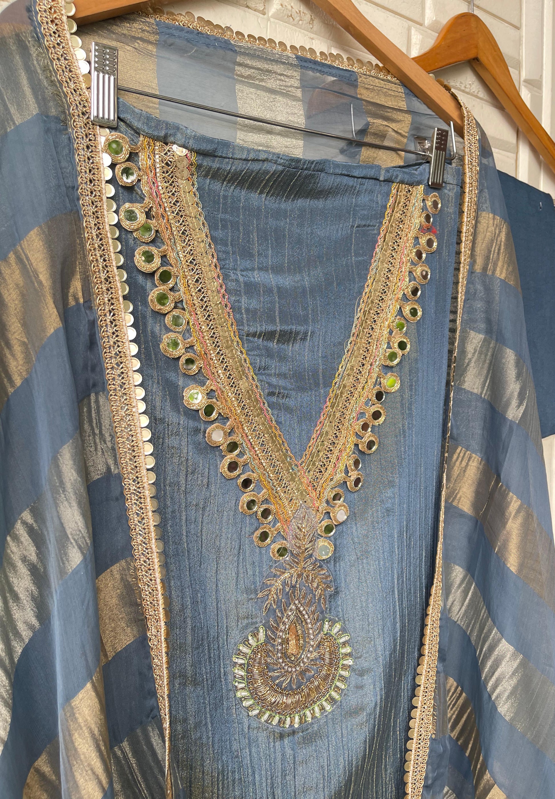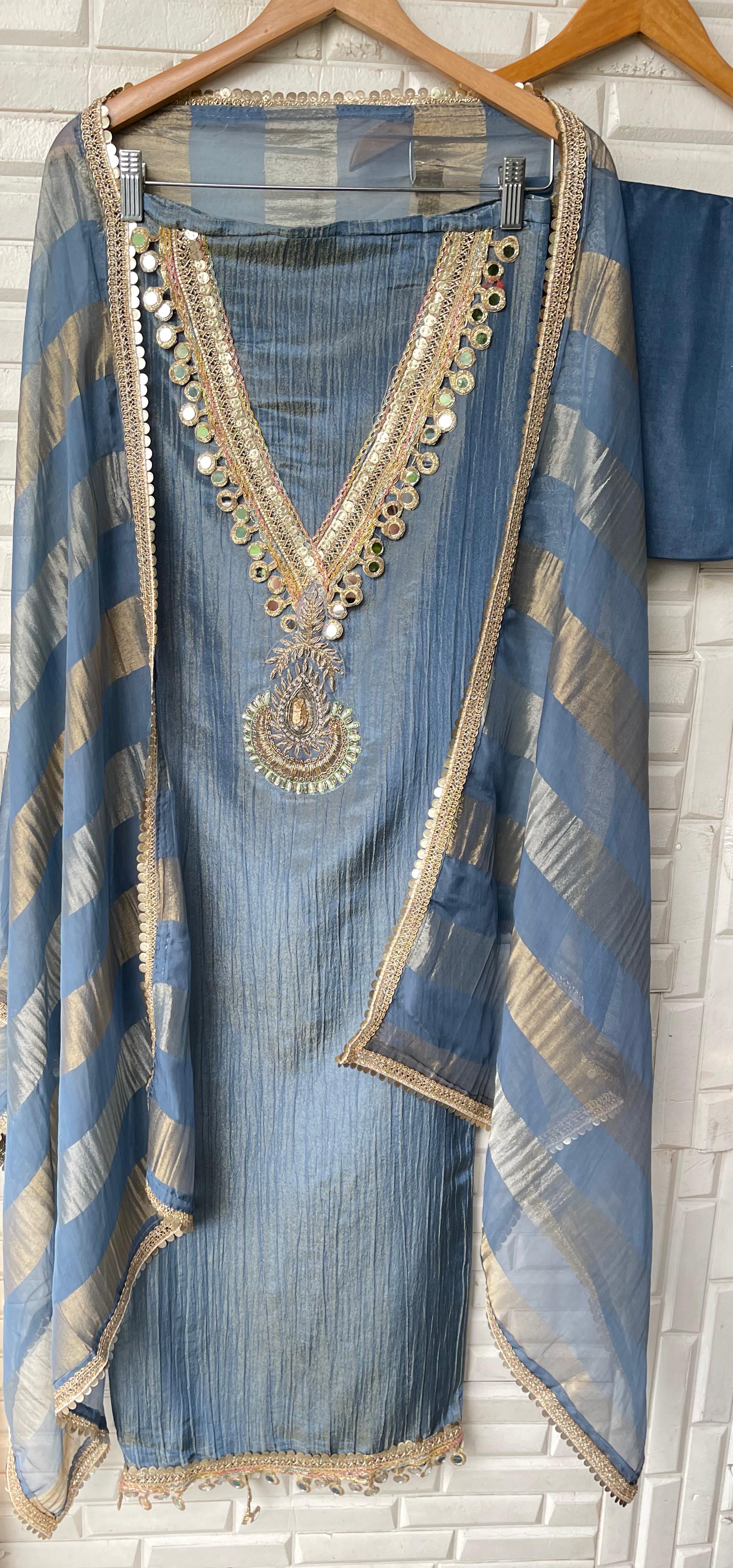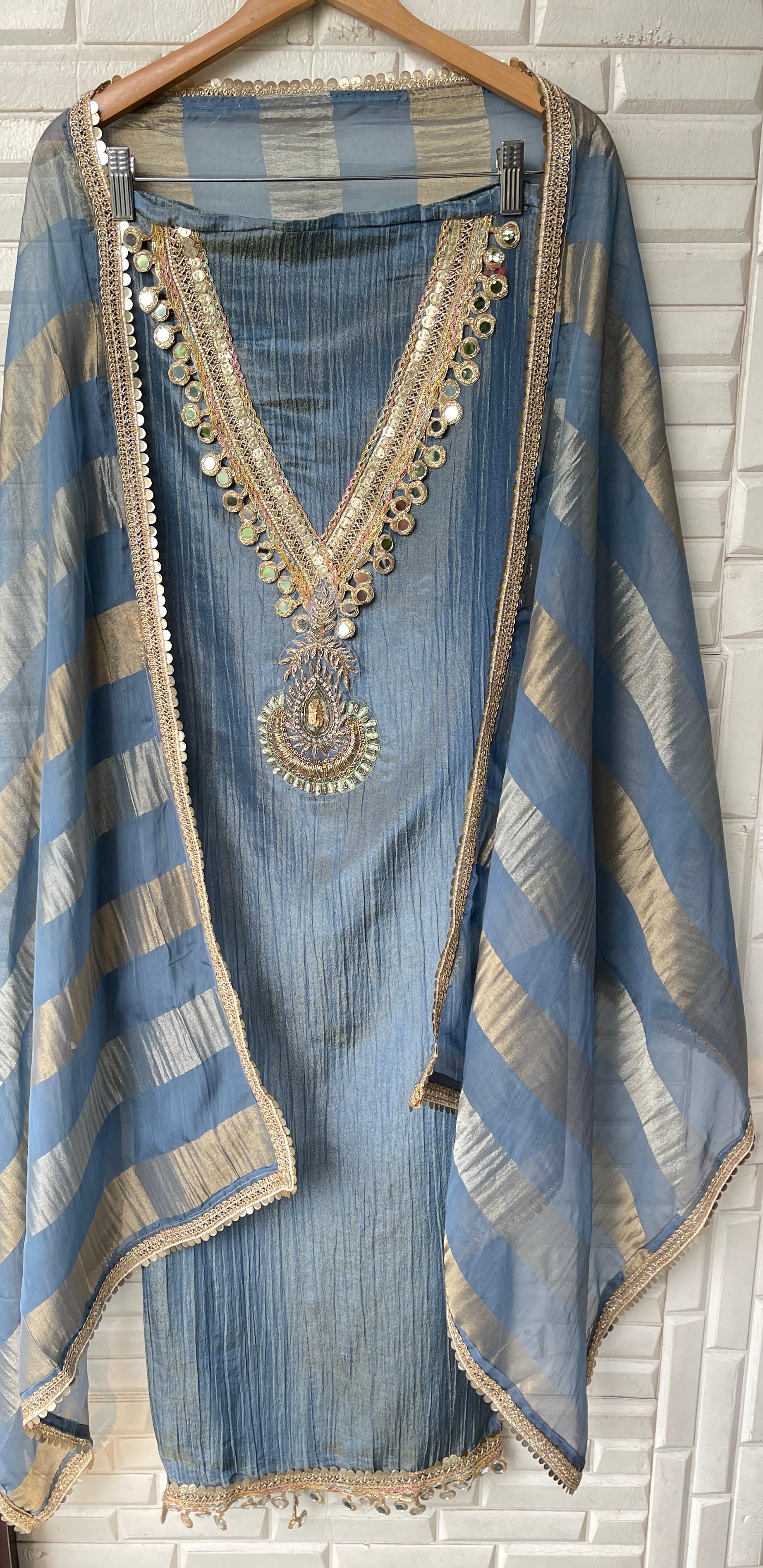 😊crushed tissue unstitched shirt with beautiful mirror zari cutdana Moti Dabka embroidery