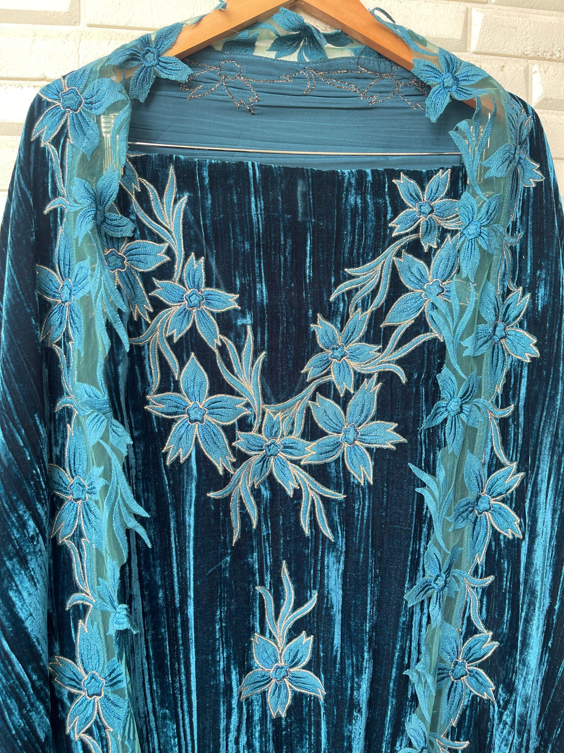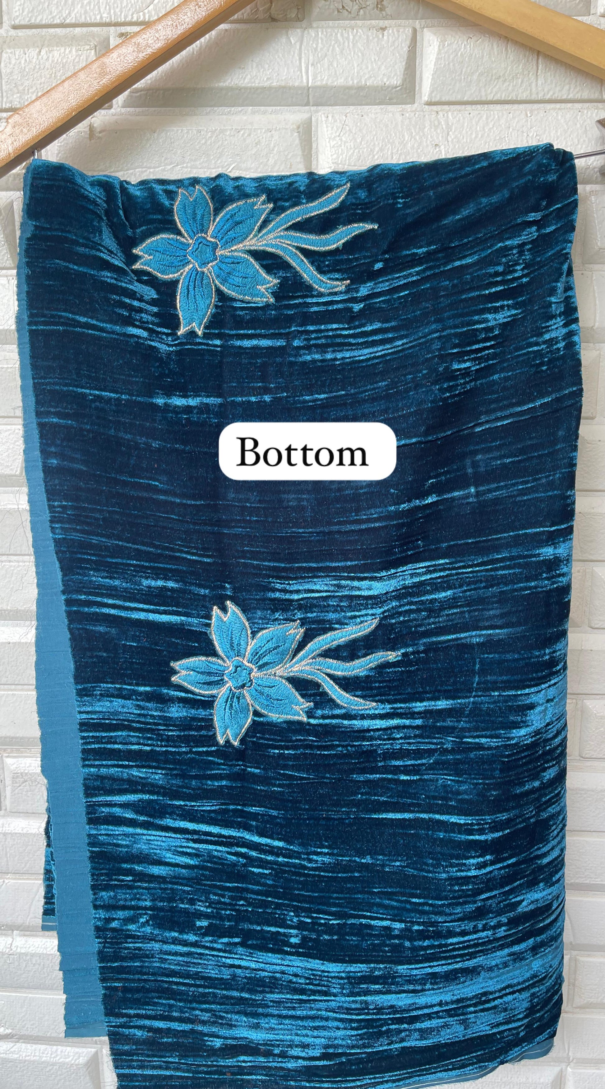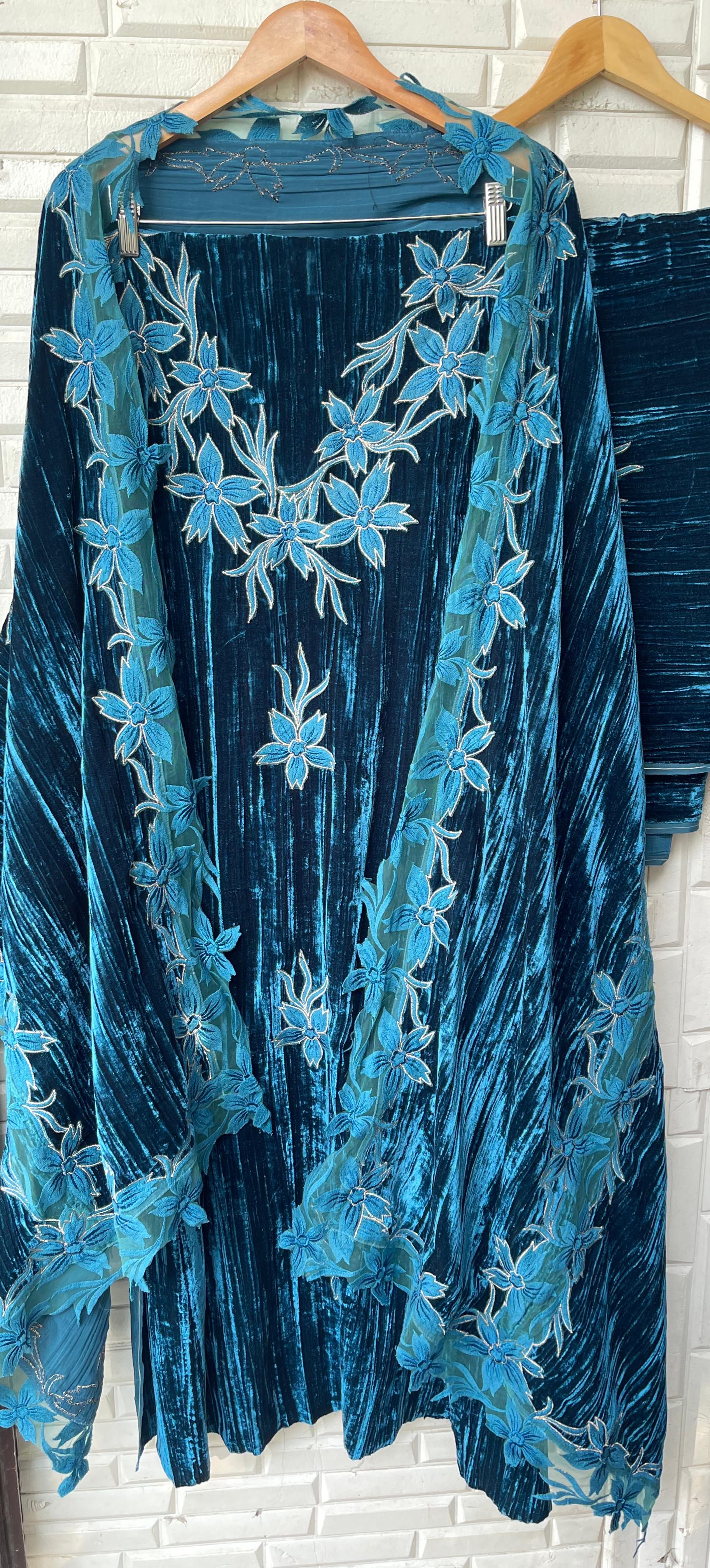 😊 pure crushed velvet fabric unstitched shirt with patchwork and zari highlighting plus most stunning appliqué embroidery
