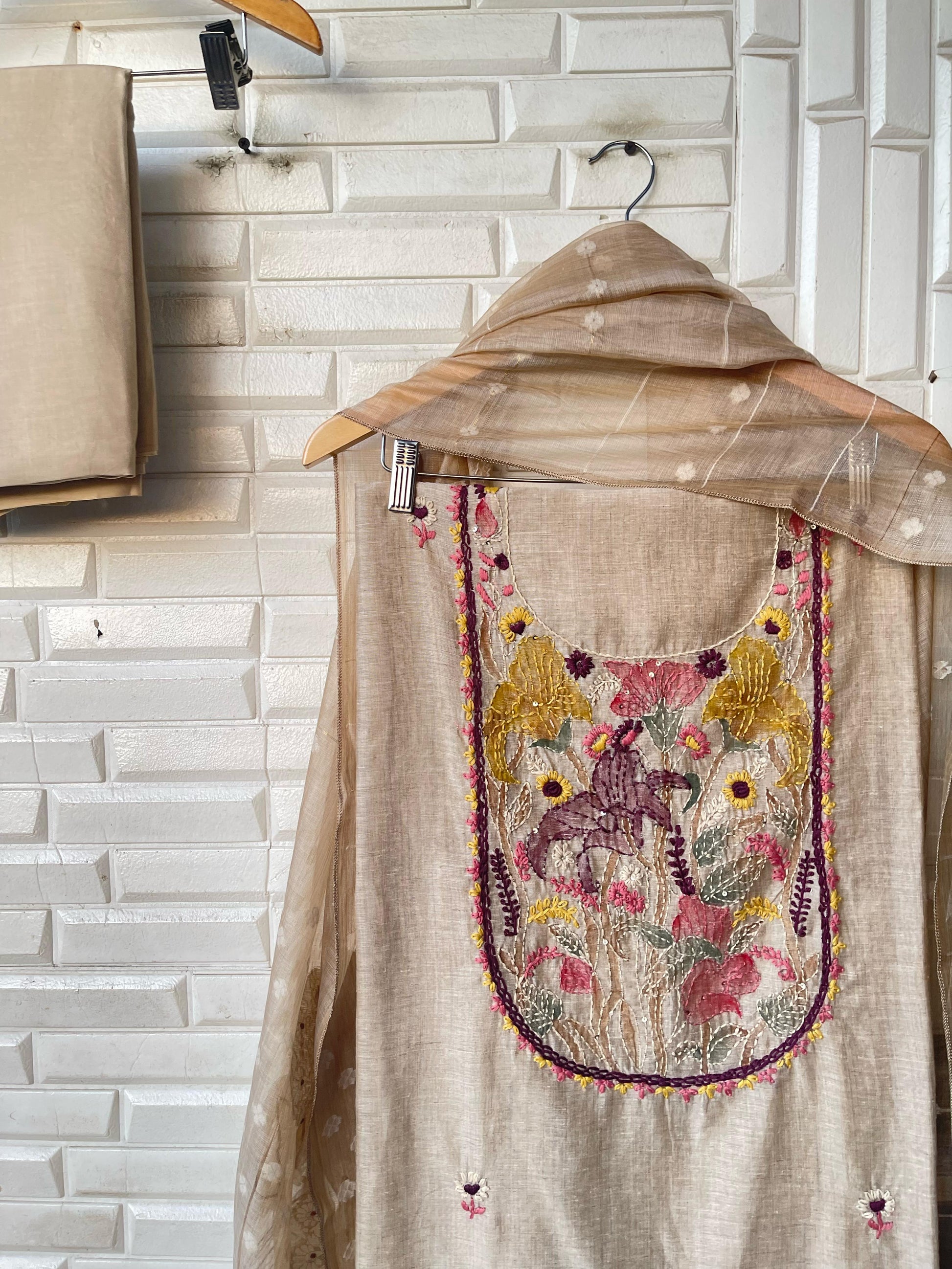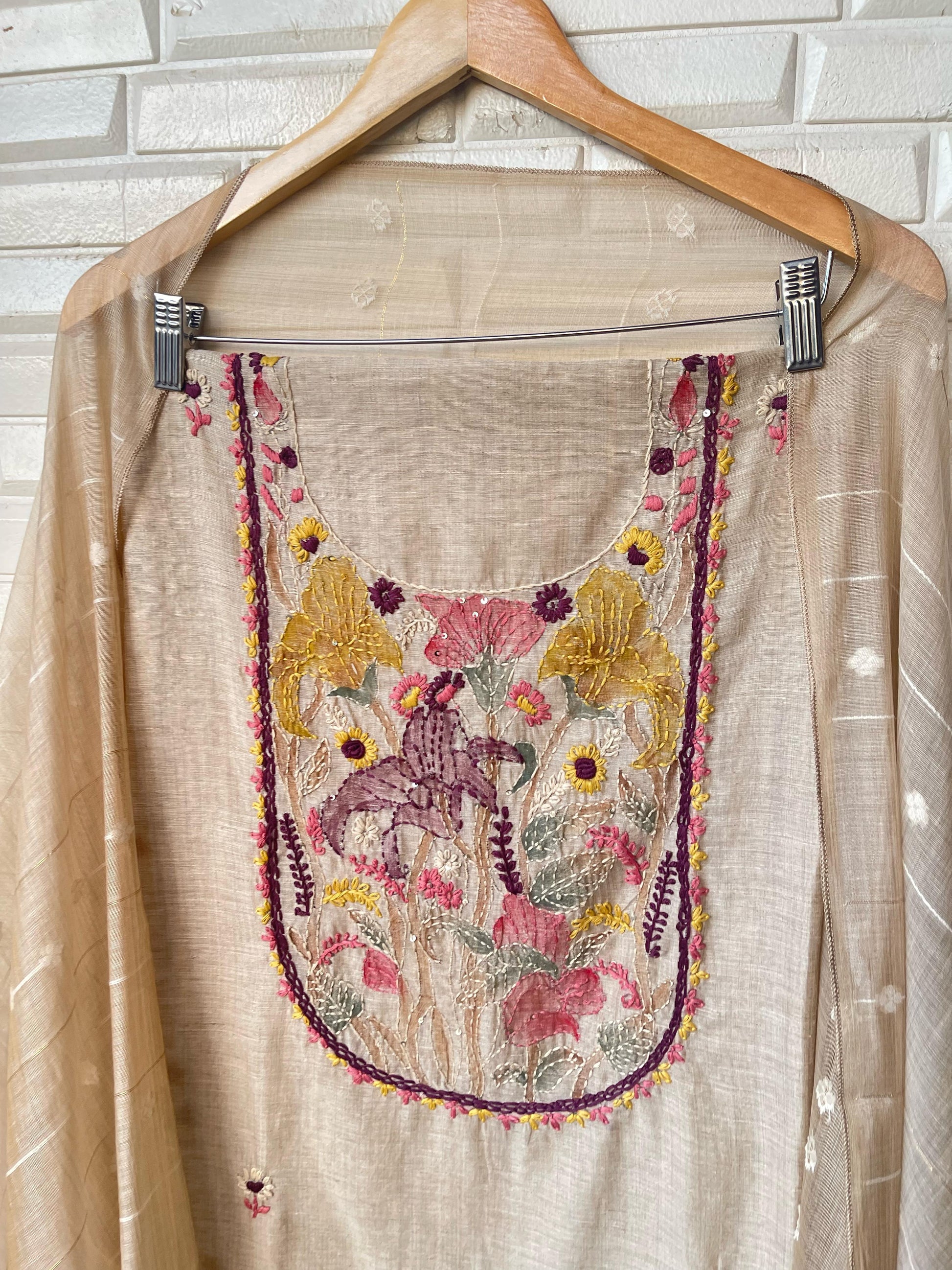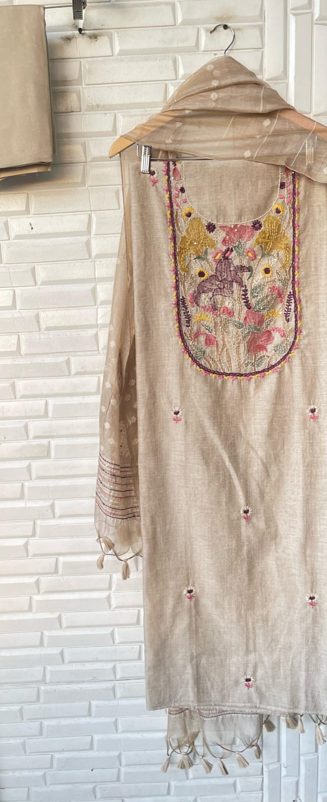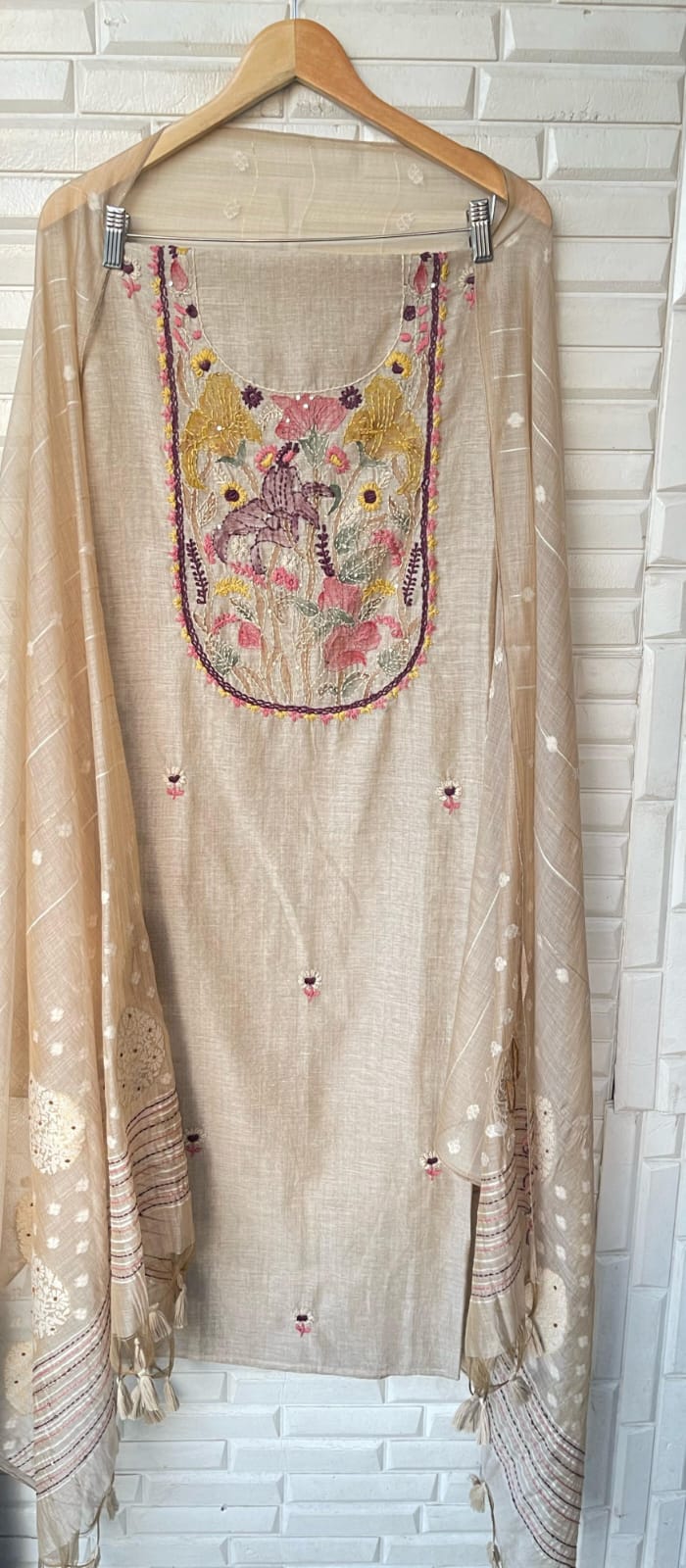 đ Fine linen cotton fabric unstitched shirt with resham knots sequence embroideryÂ