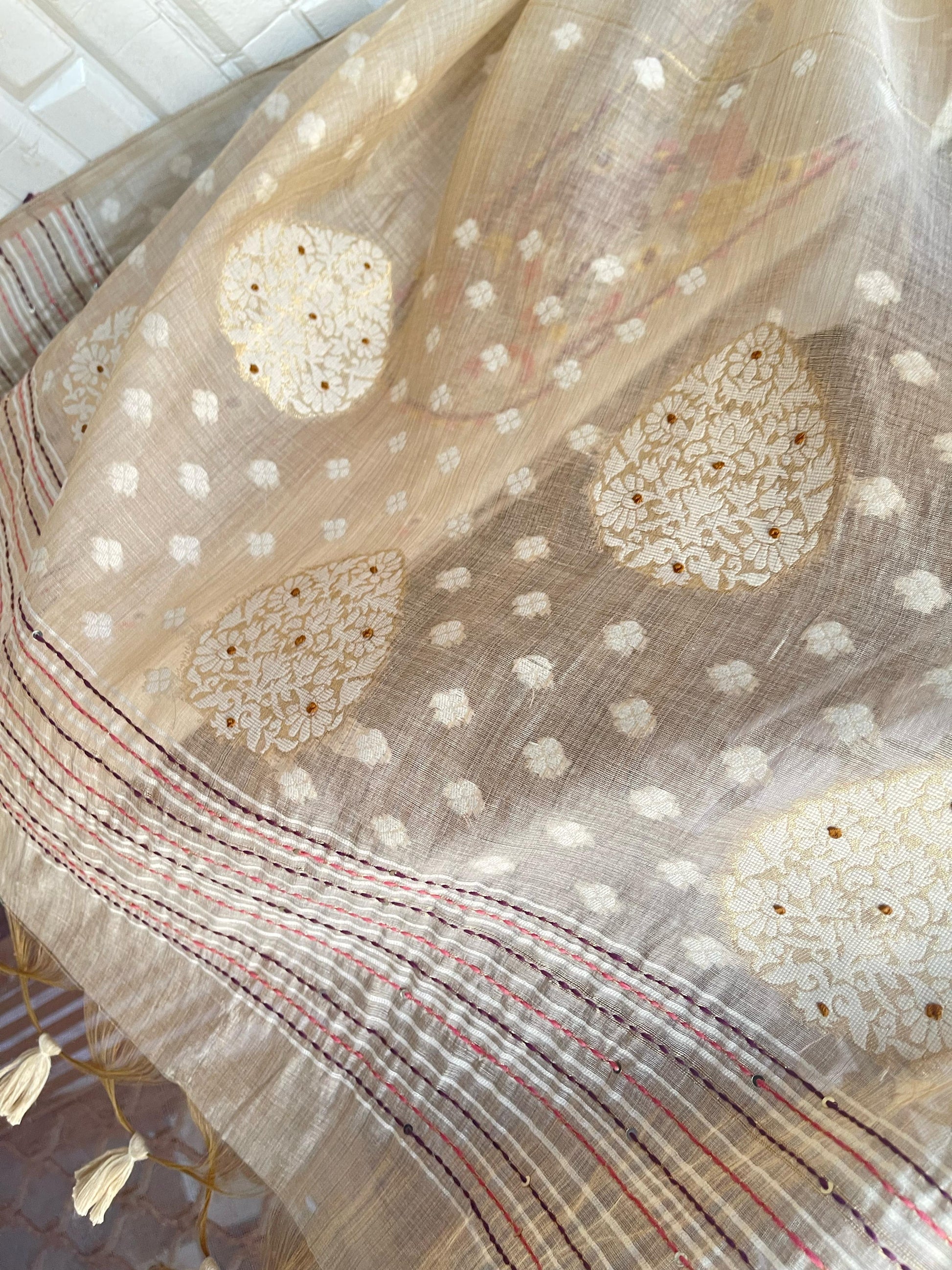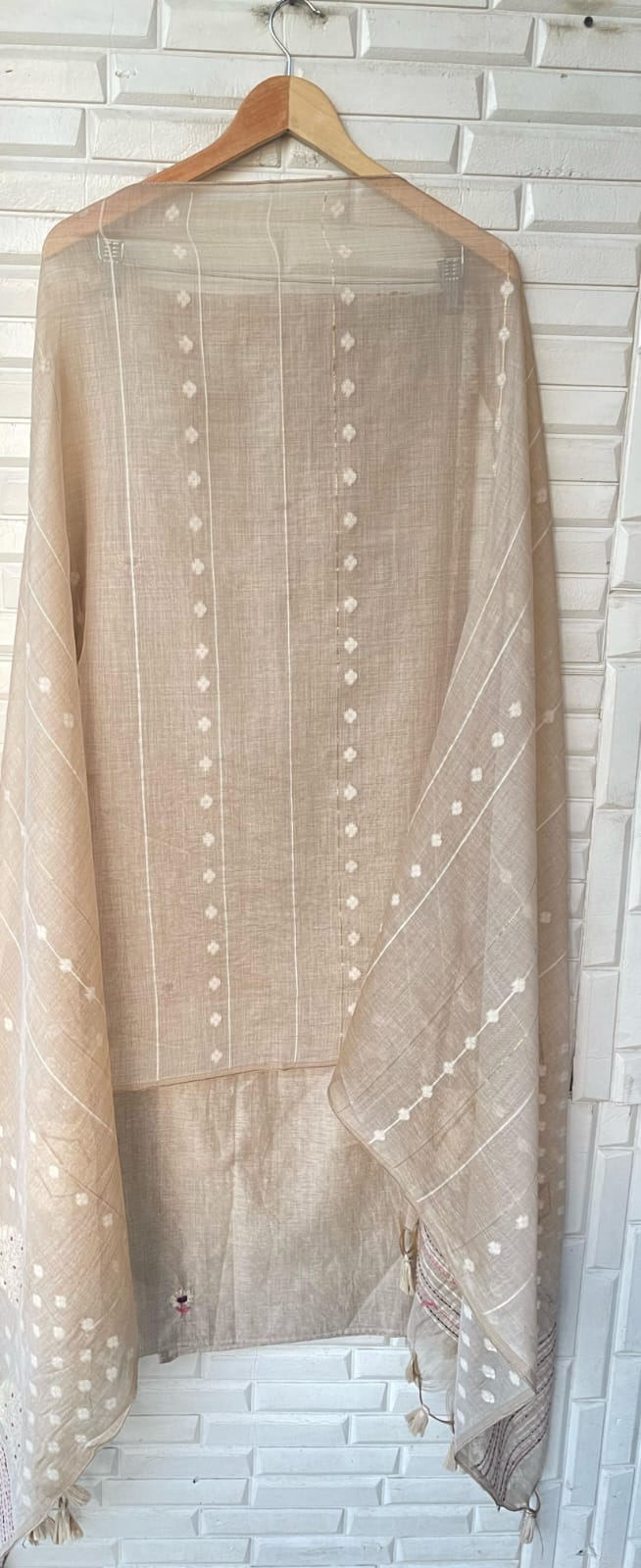 đ Banarasi fine linen cotton fabric dupatta with resham knots embroidery and tassel border laceÂ
