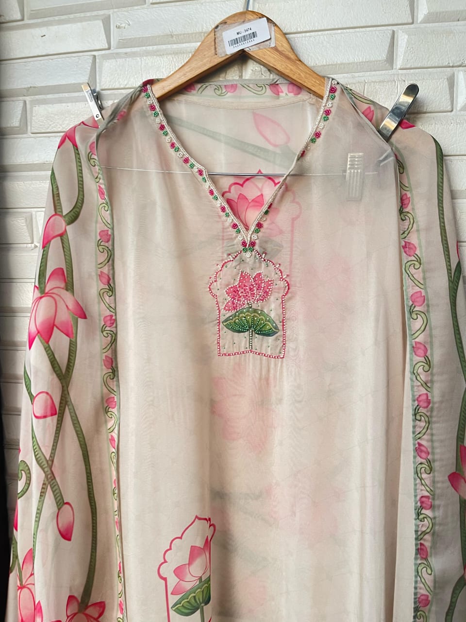 đ Fine muslin printed fabric unstitched shirt with sequence pearl embroideryÂ