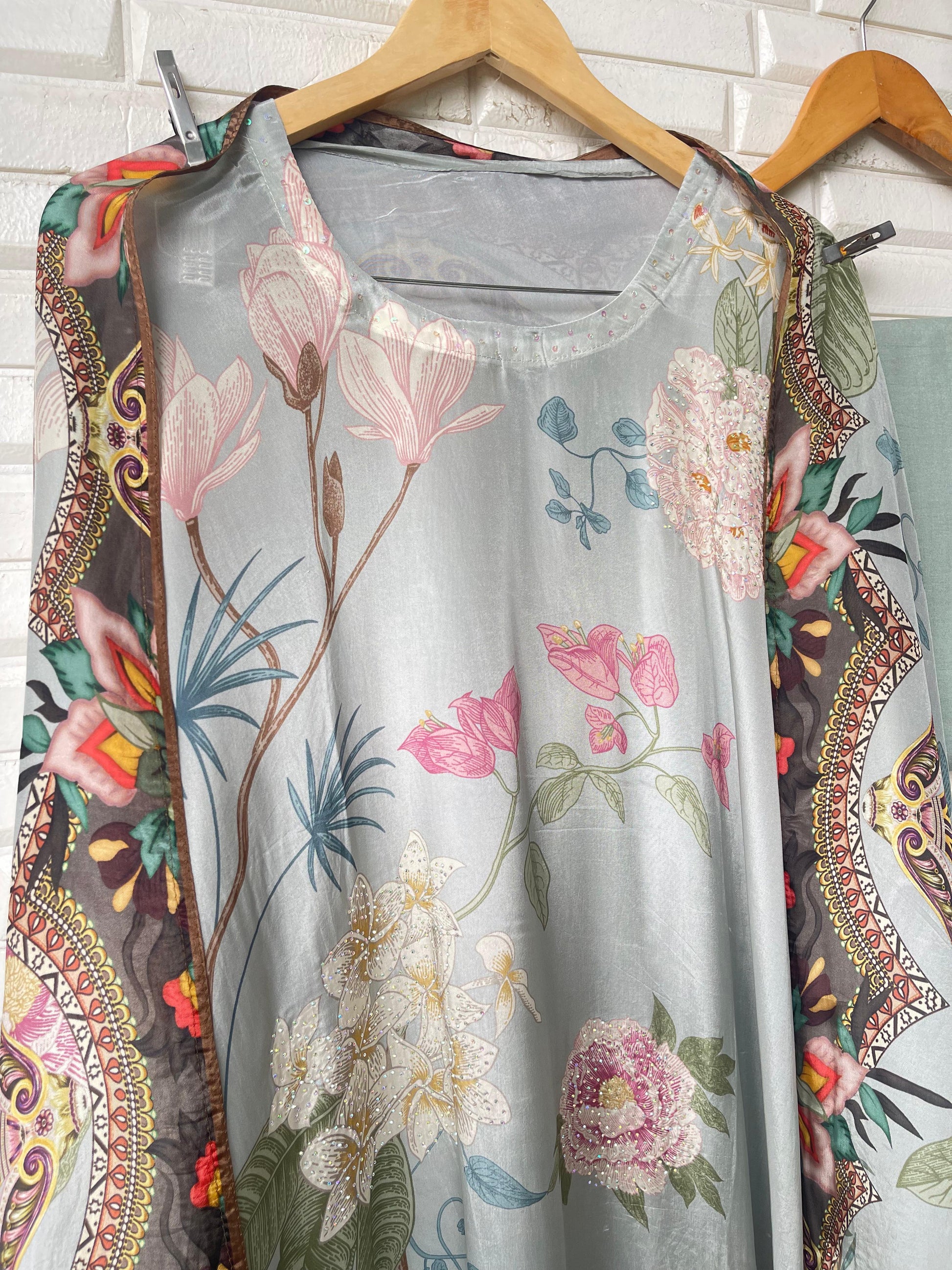 π glass organza with sheen printed fabric unstitched shirt with swarowski highlighting and shell hanging ghera lace