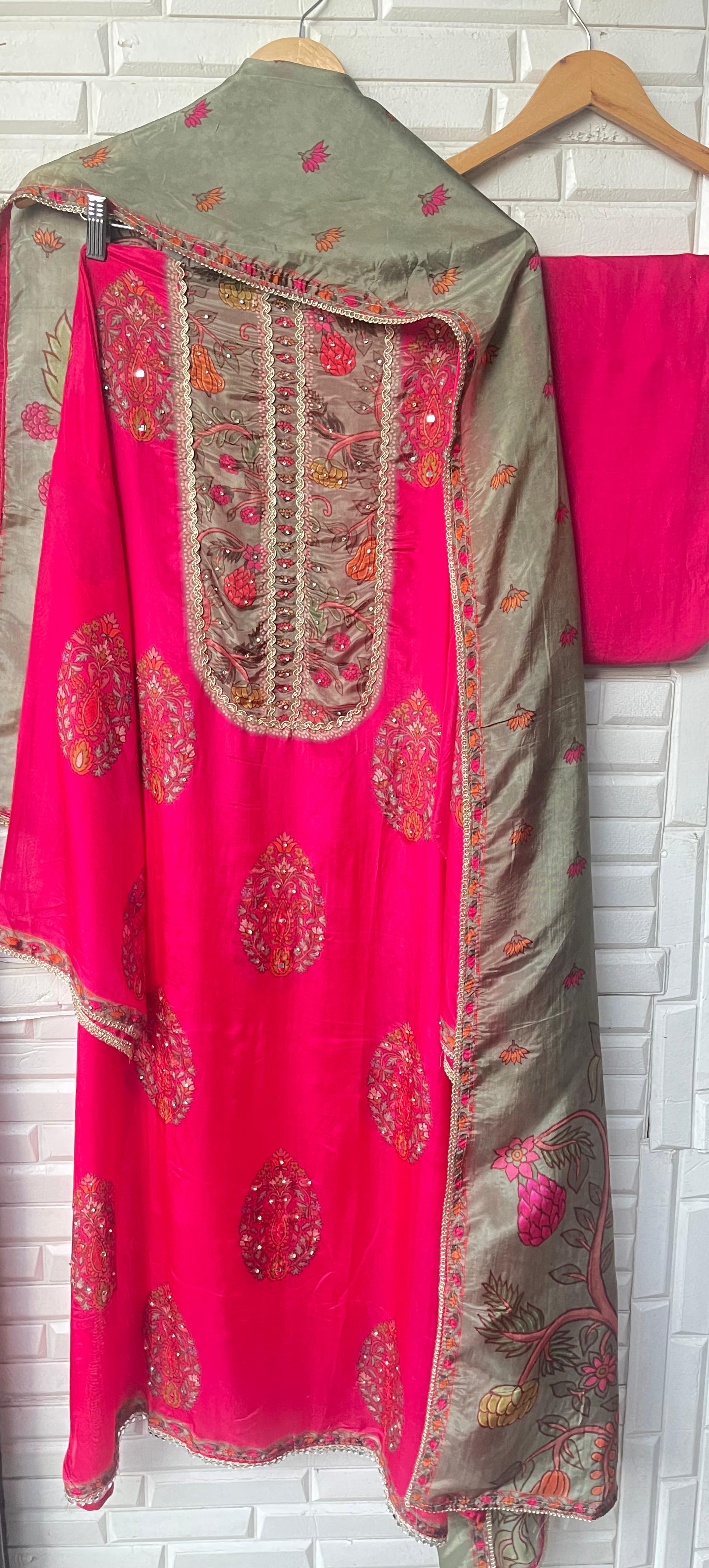 π sheen glass organza printed fabric unstitched shirt with mirror work swarowski resham pearl embroidery