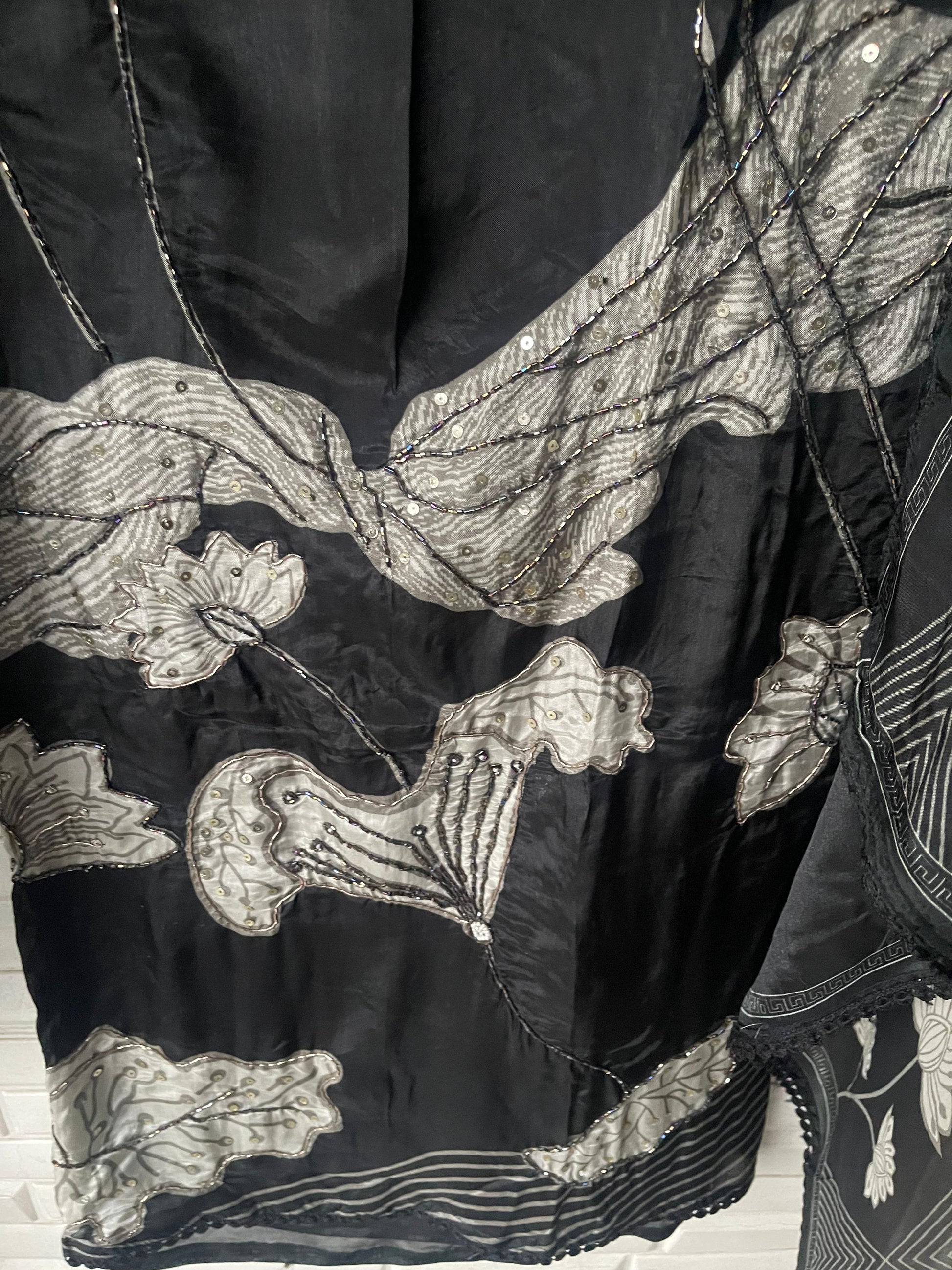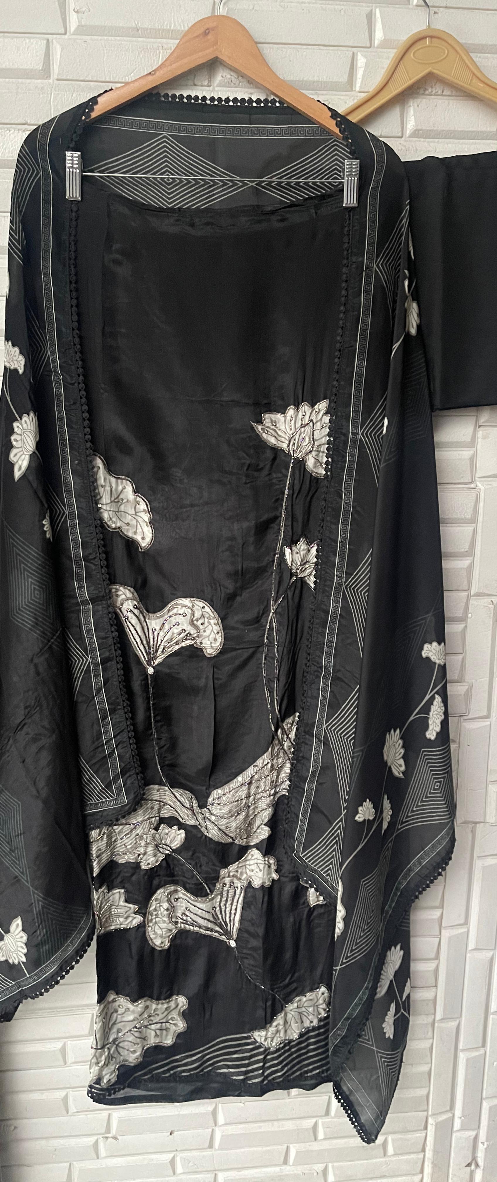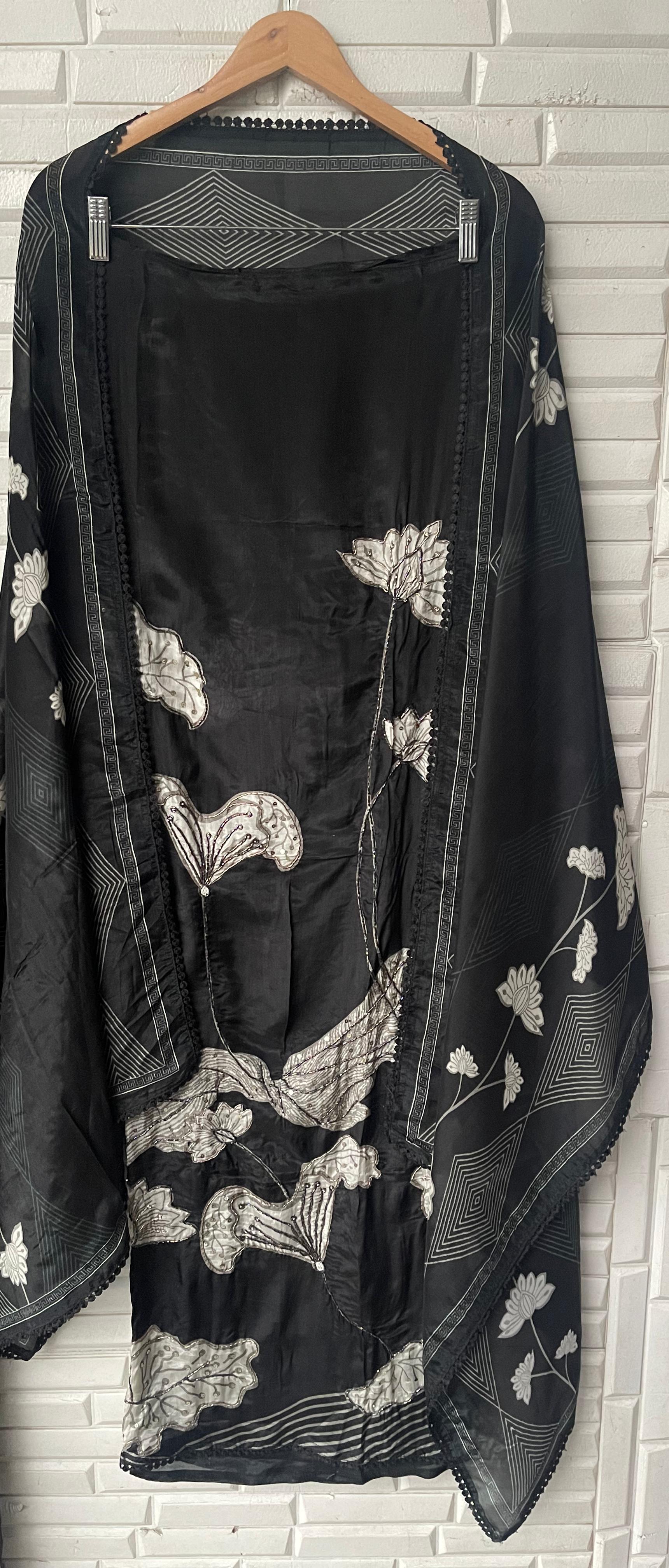 π glass organza printed fabric unstitched shirt with kutdanna pearl dabka embroidery