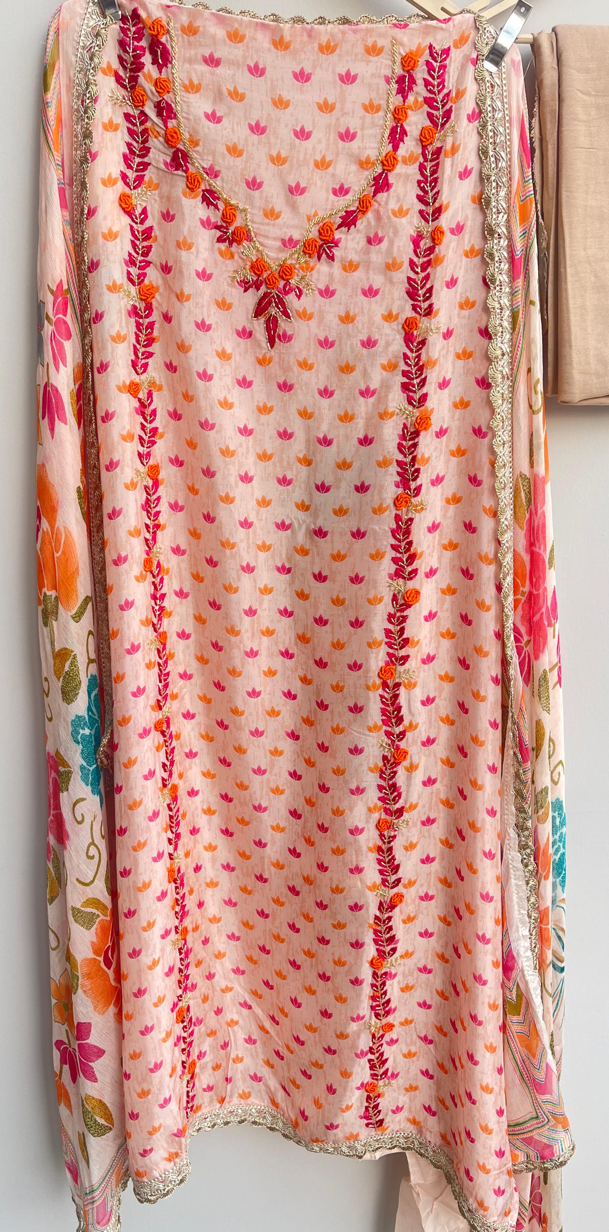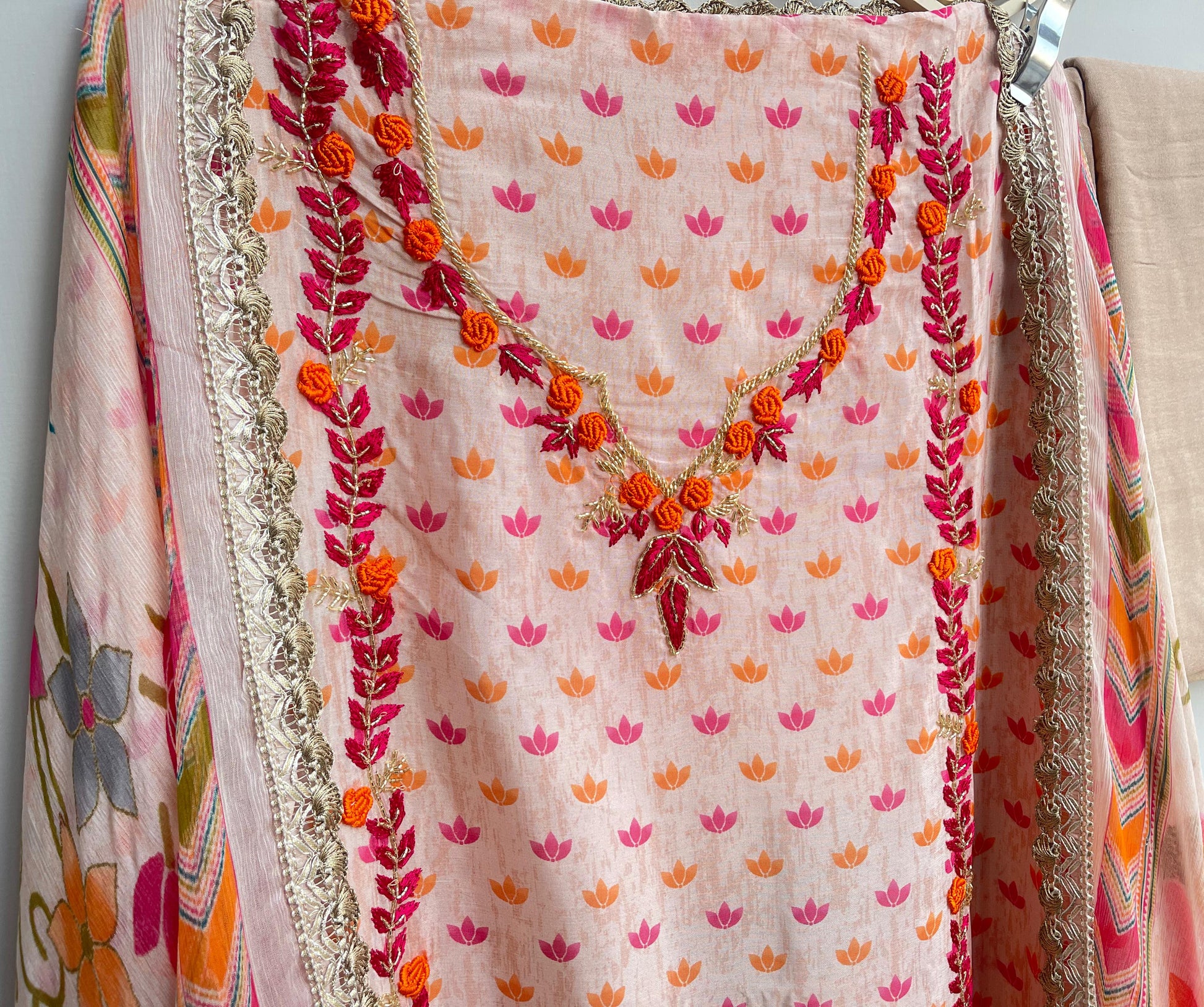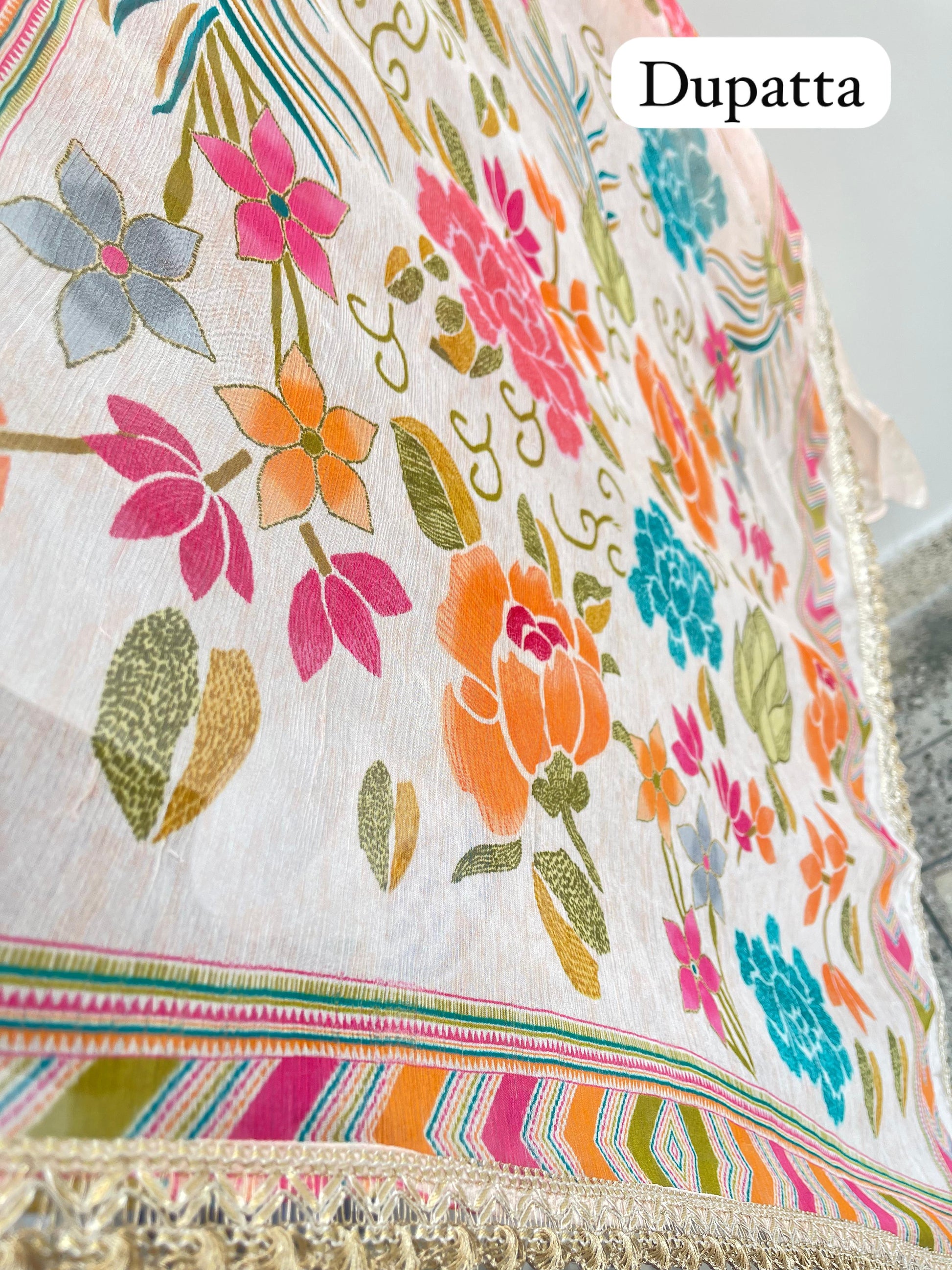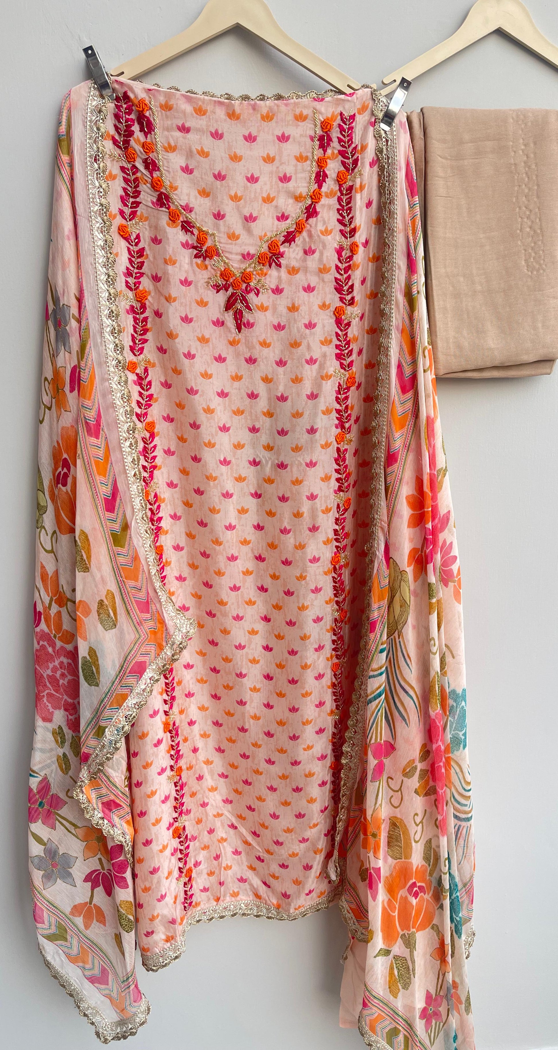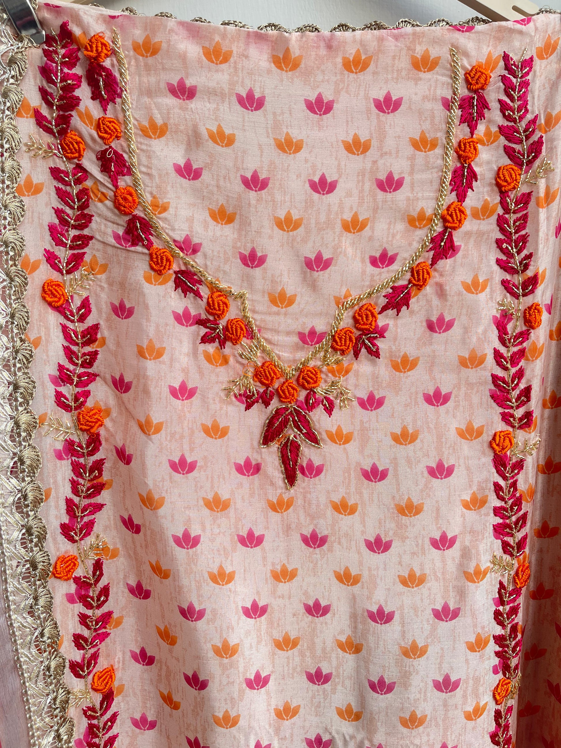 😊 glass organza printed fabric unstitched shirt with stunning kutdaana resham embroidery and kingri ghera lace